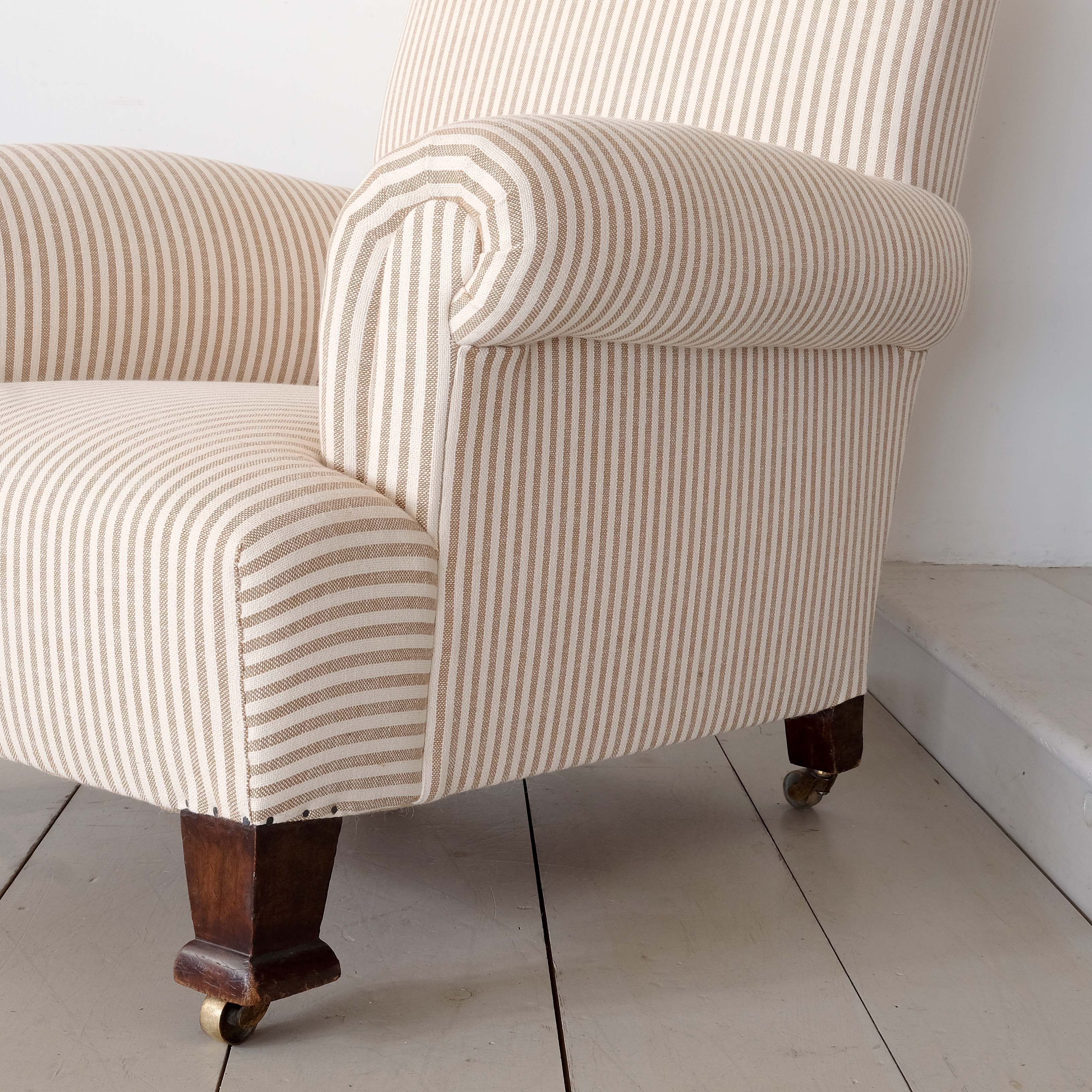 English country house armchair, circa 1900. Good quality hard wood frame raised on unusually chunky square tapered legs and original brass castors. Generous proportions and very comfortable. Restored and upholstered in caramel ticking from Merchant and Mills.