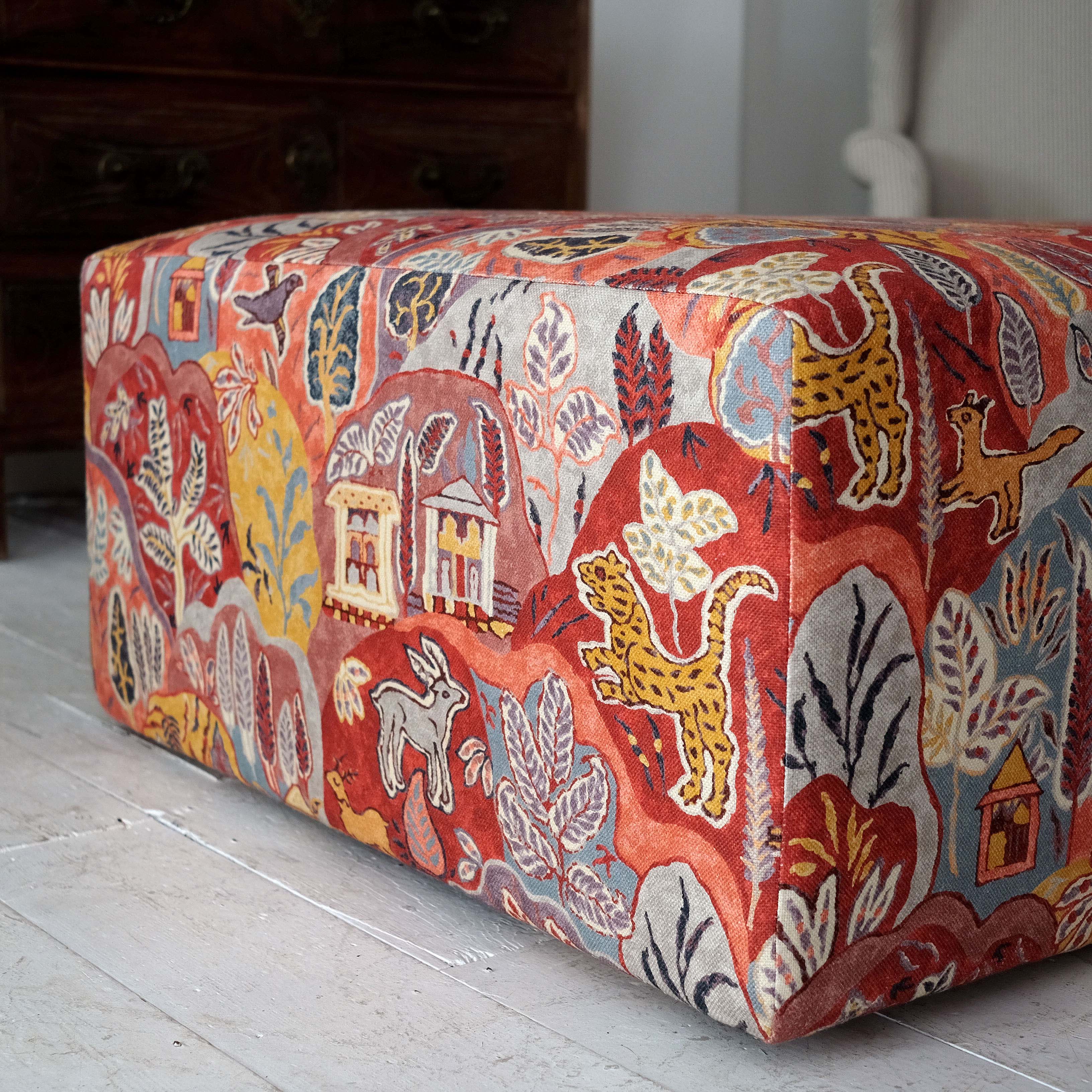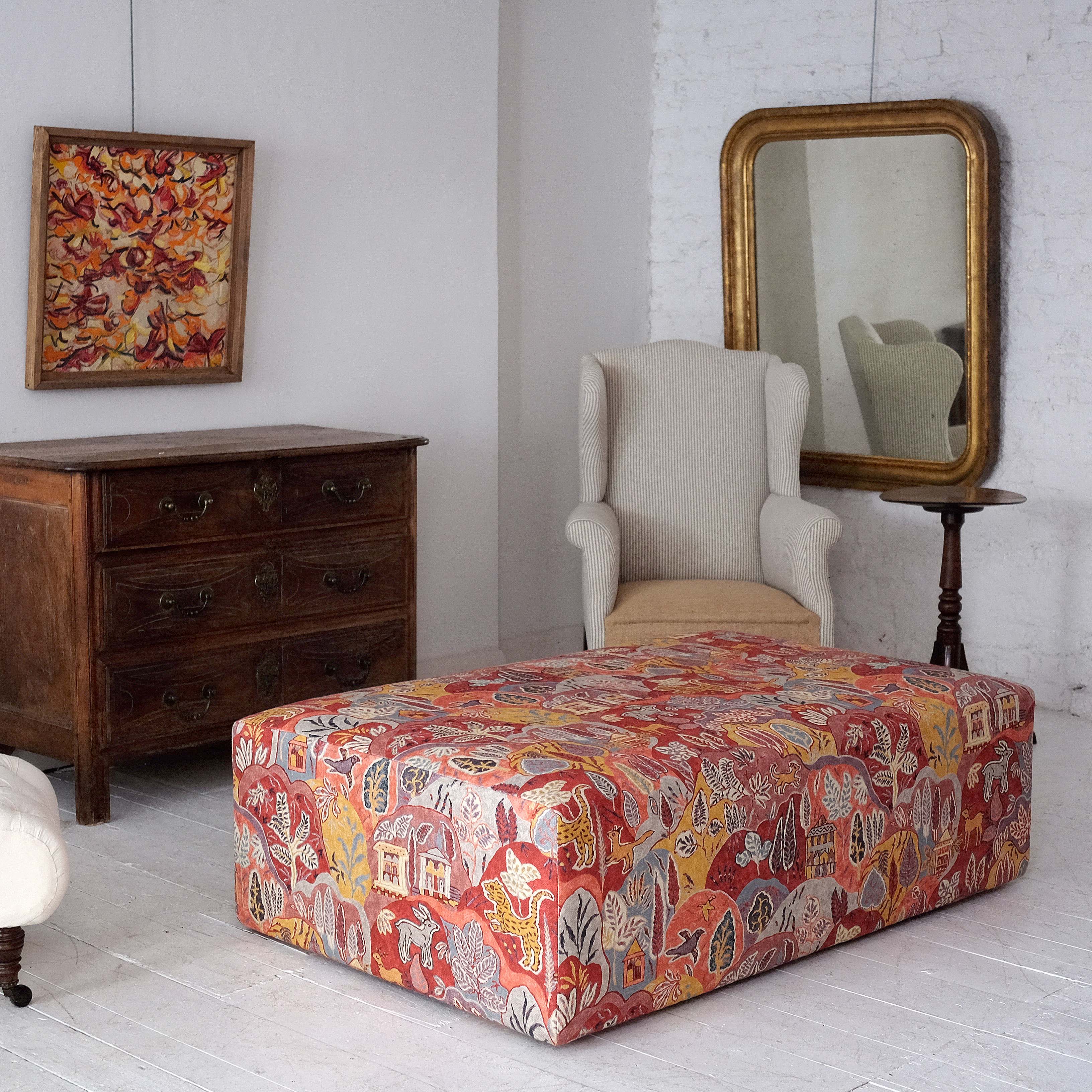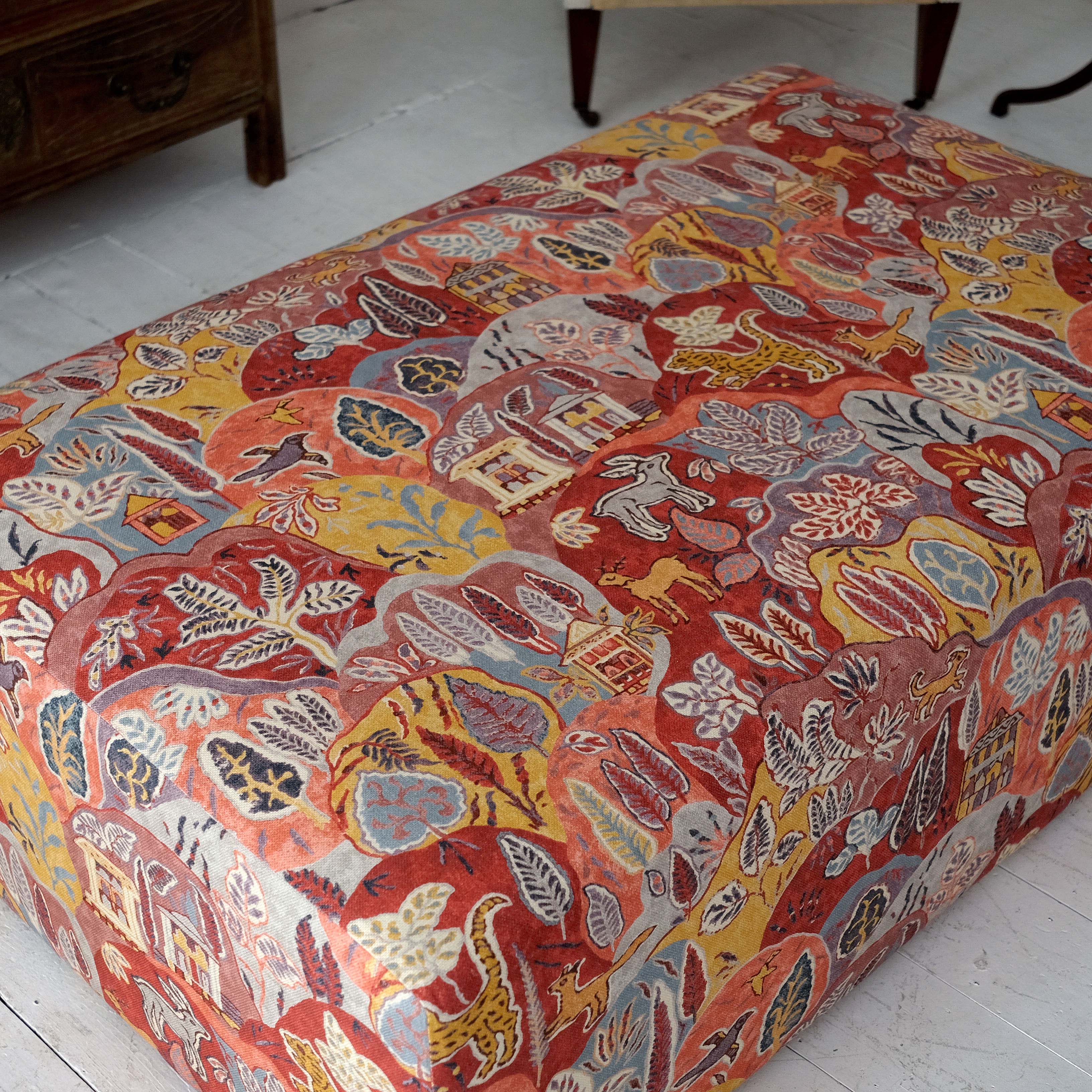 A large ottoman of recent manufacture upholstered in lovely Kit Kemp material.