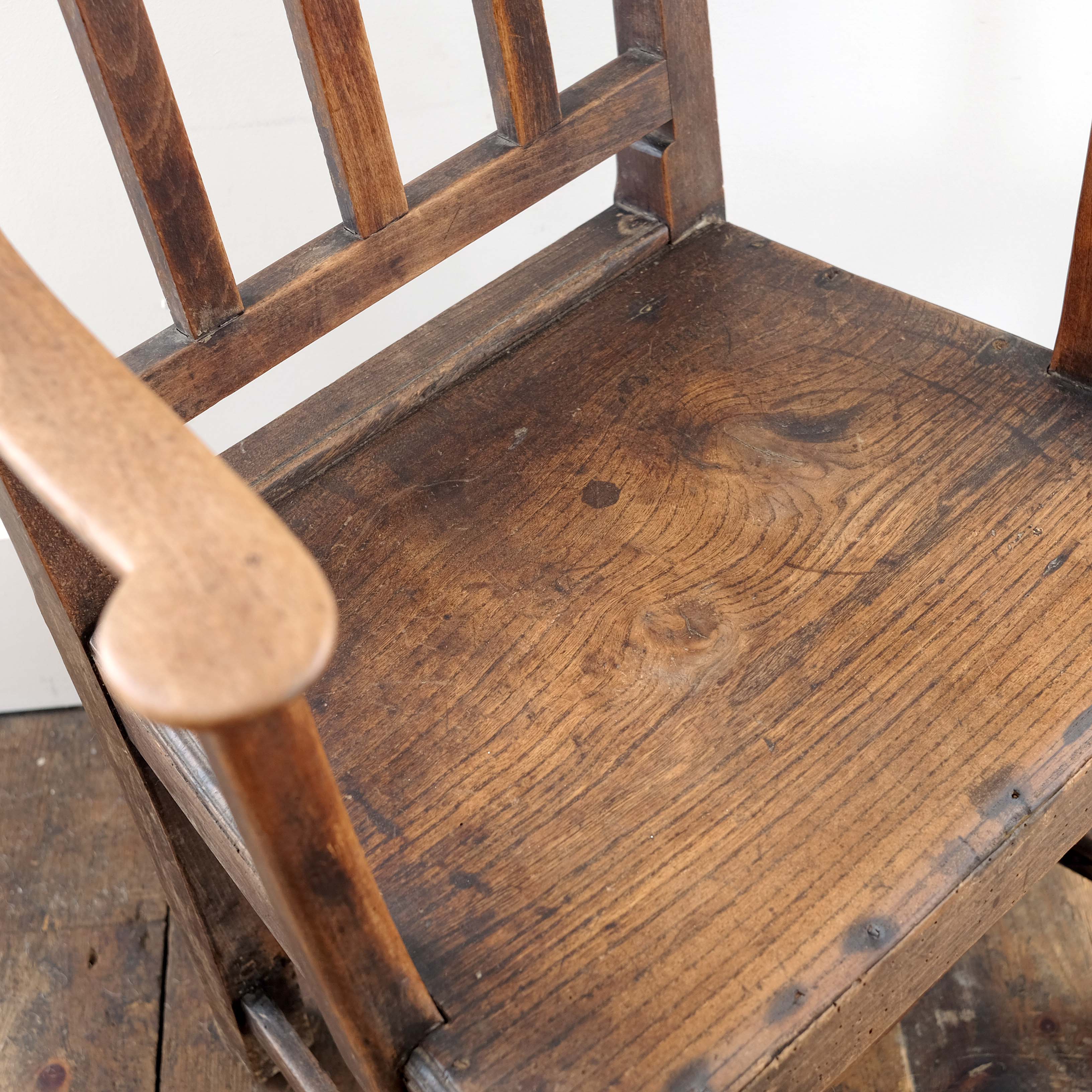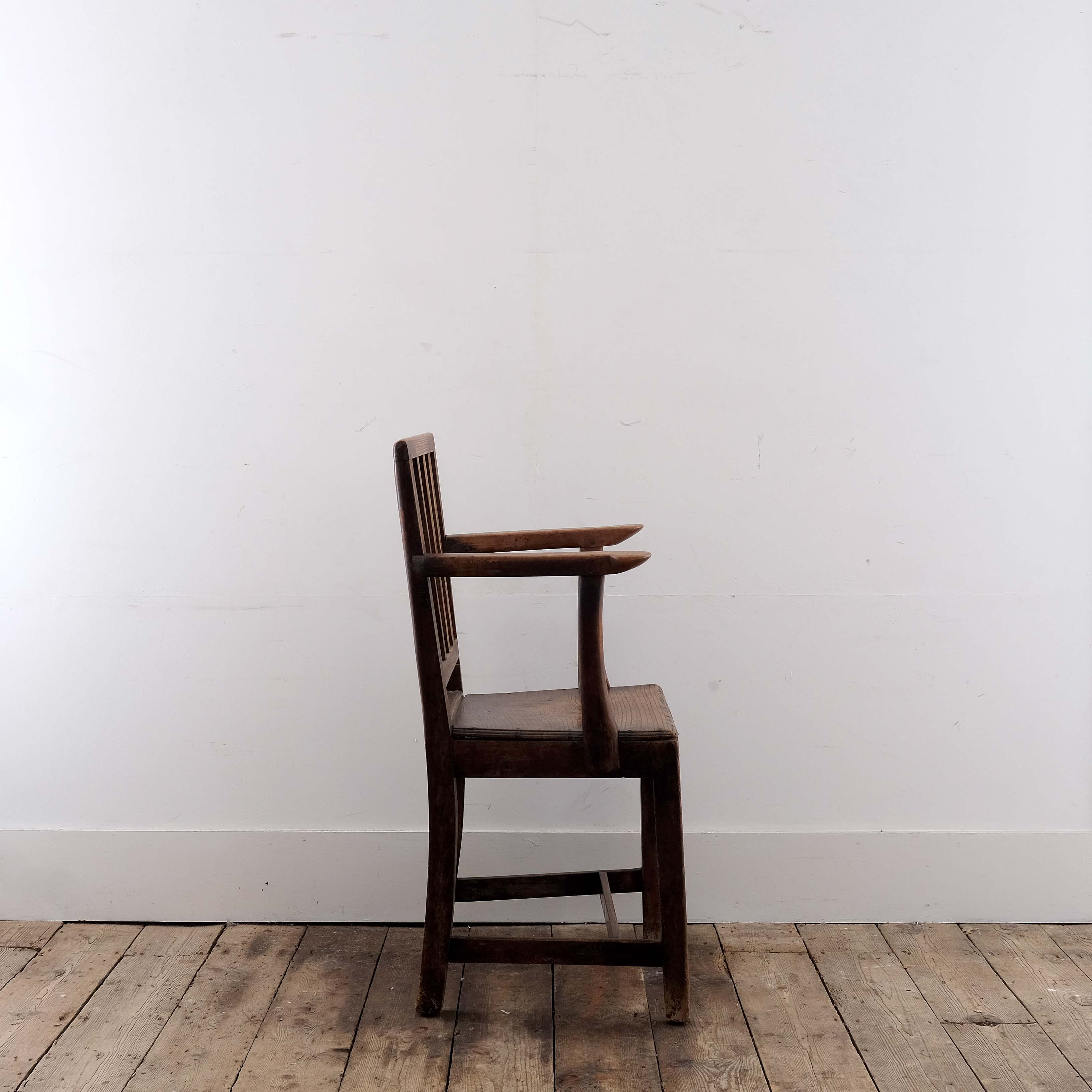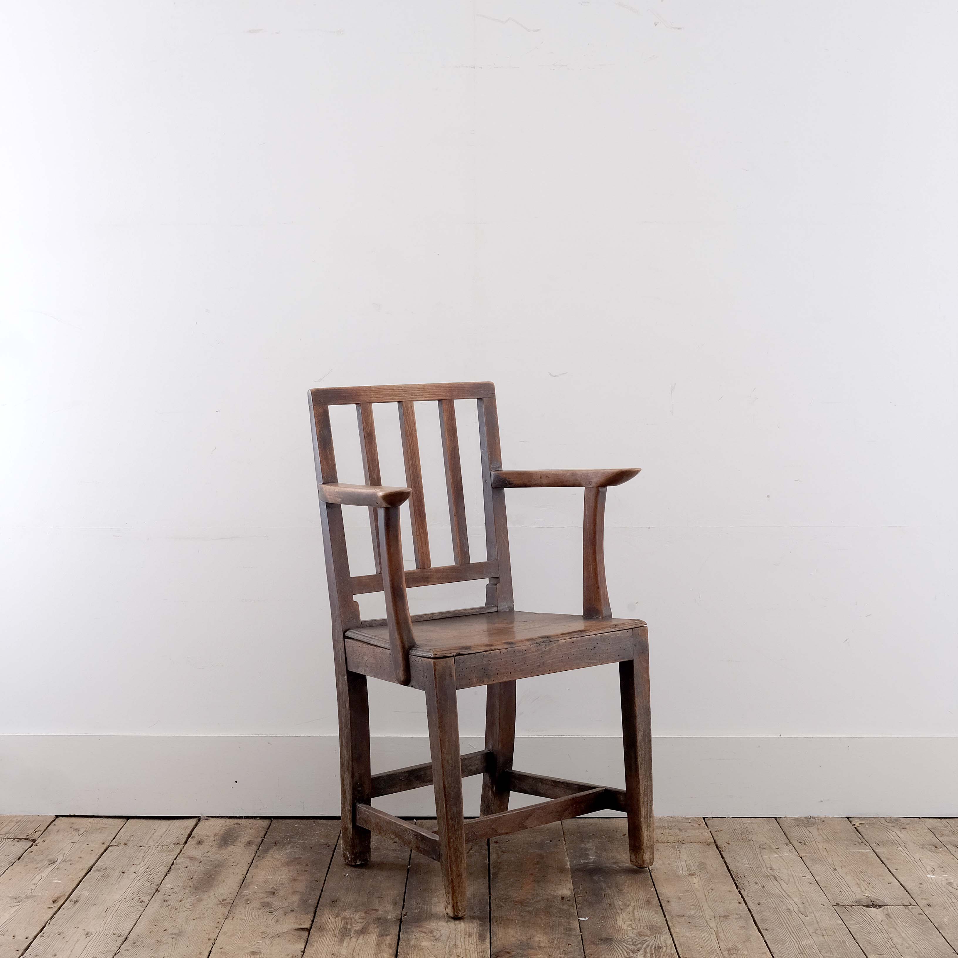 Early 19th century English country stick back armchair in elm. Wonderful simple form with unusually thin armrests. Lovely figuring and colour to the elm seat especially. Very nice signs of age and soft edges.