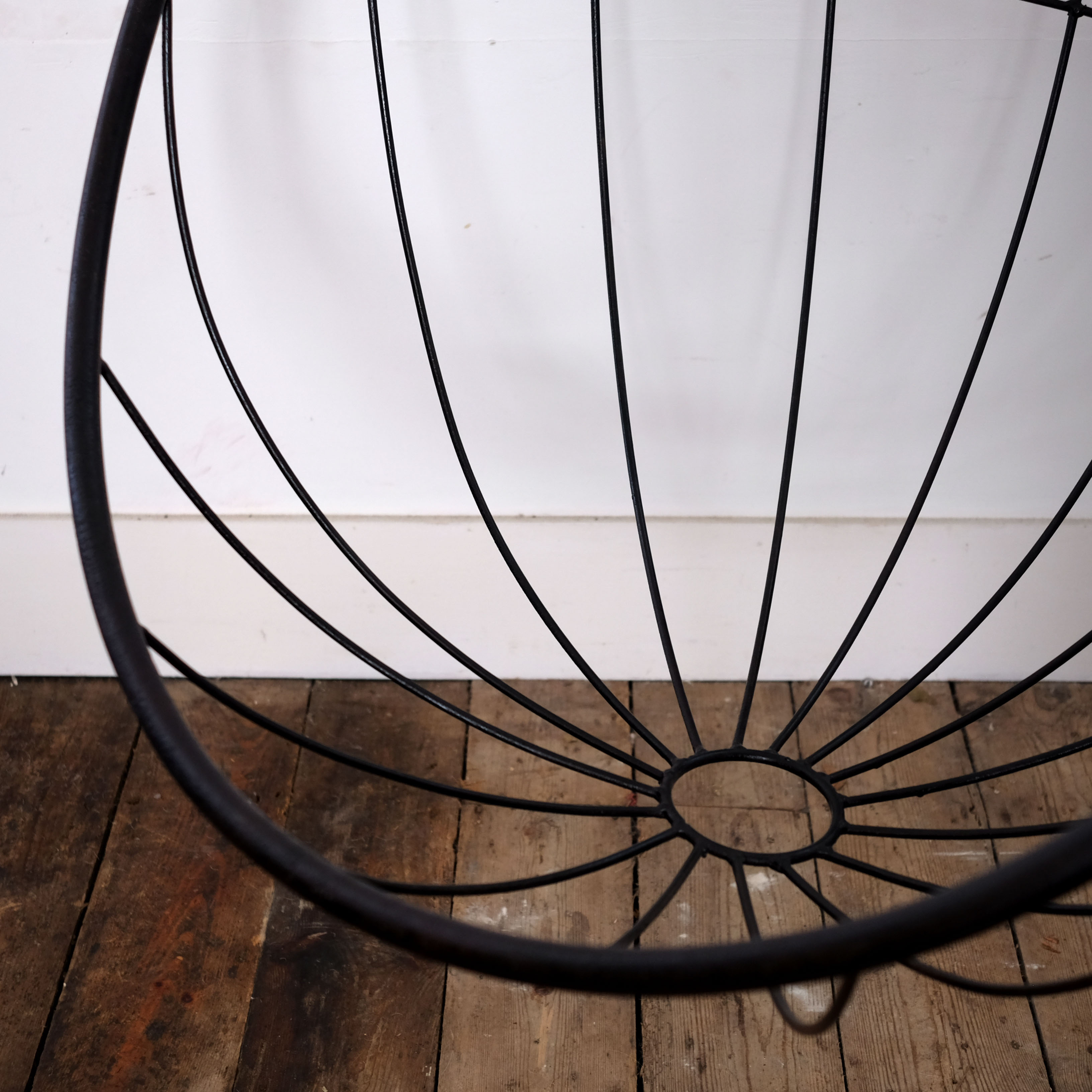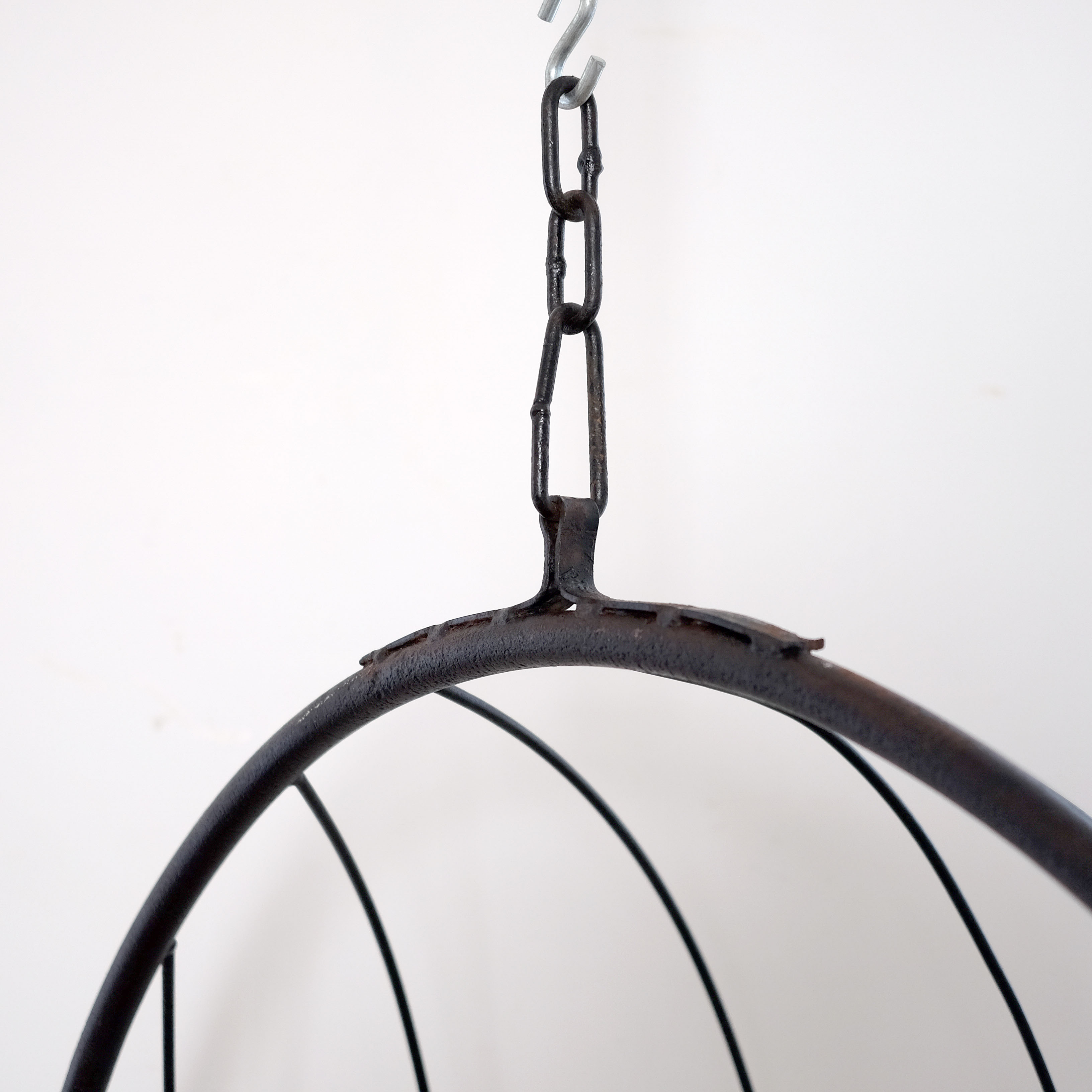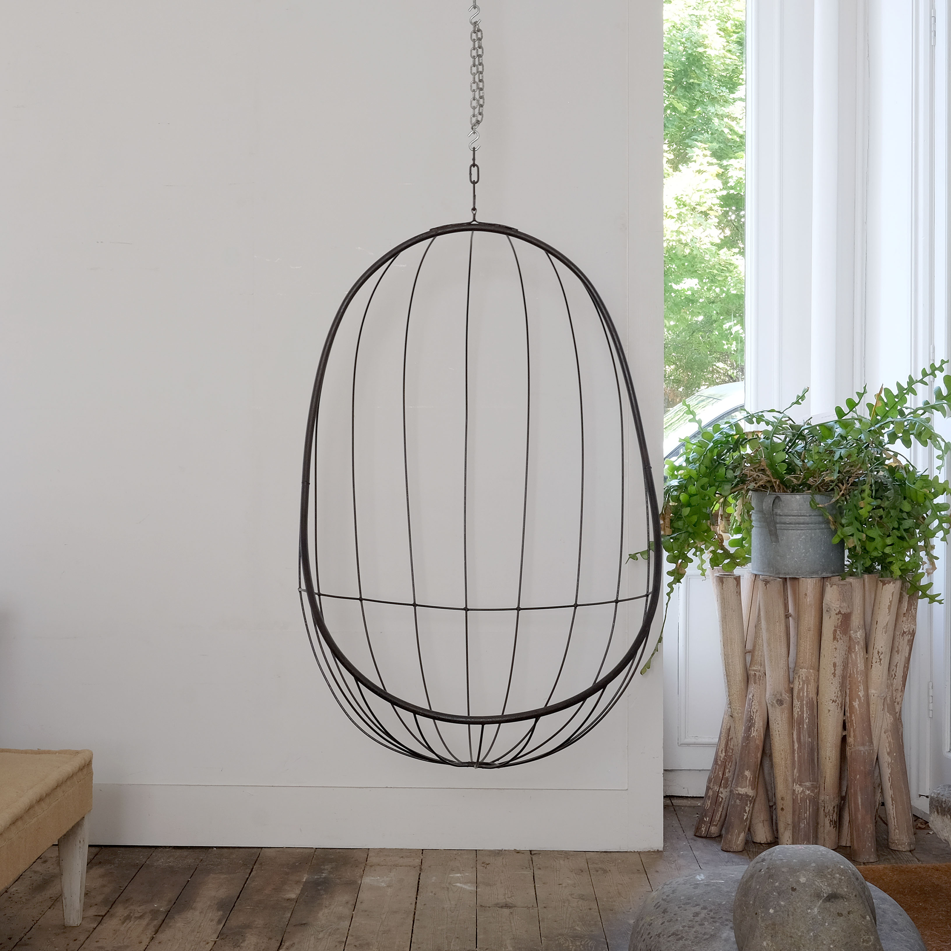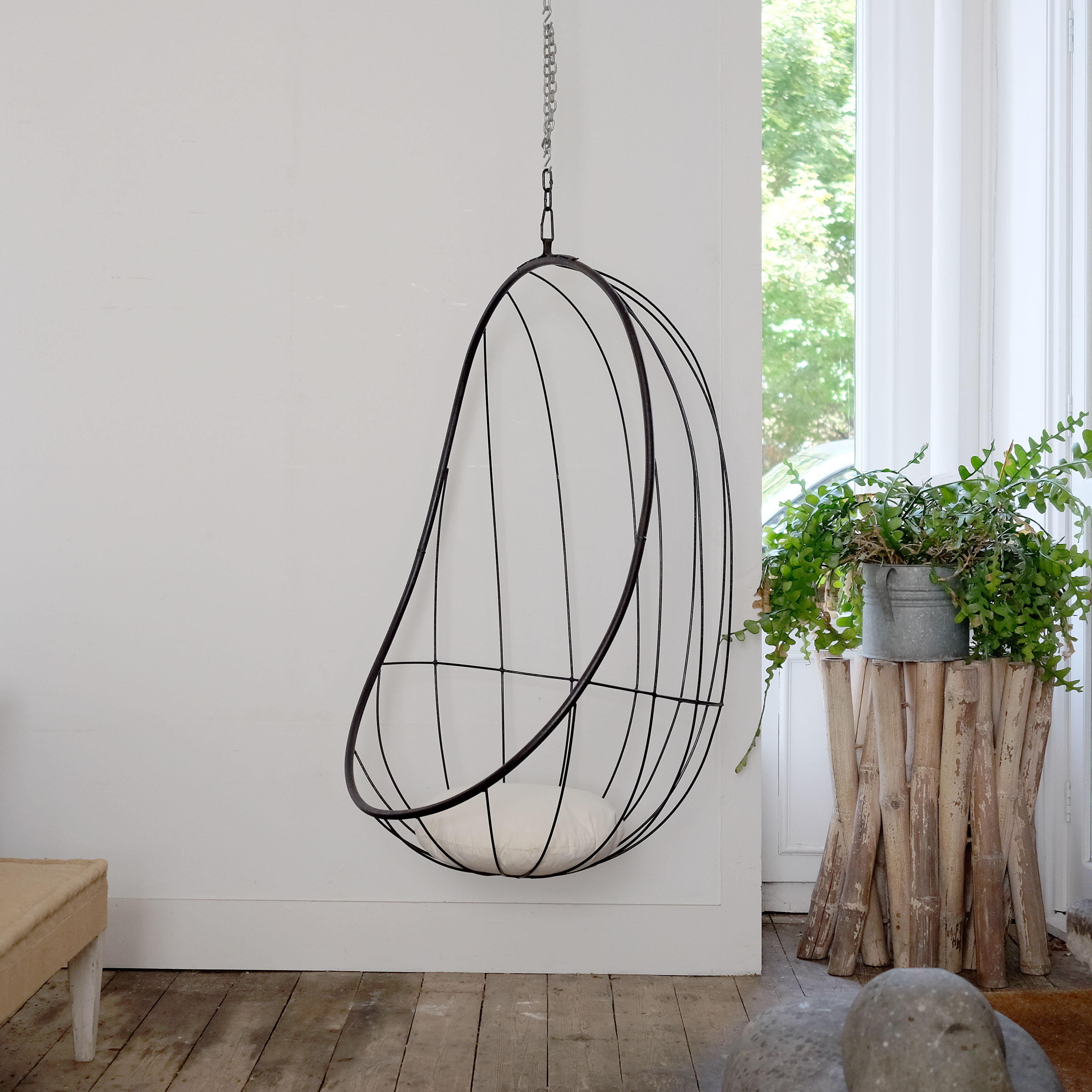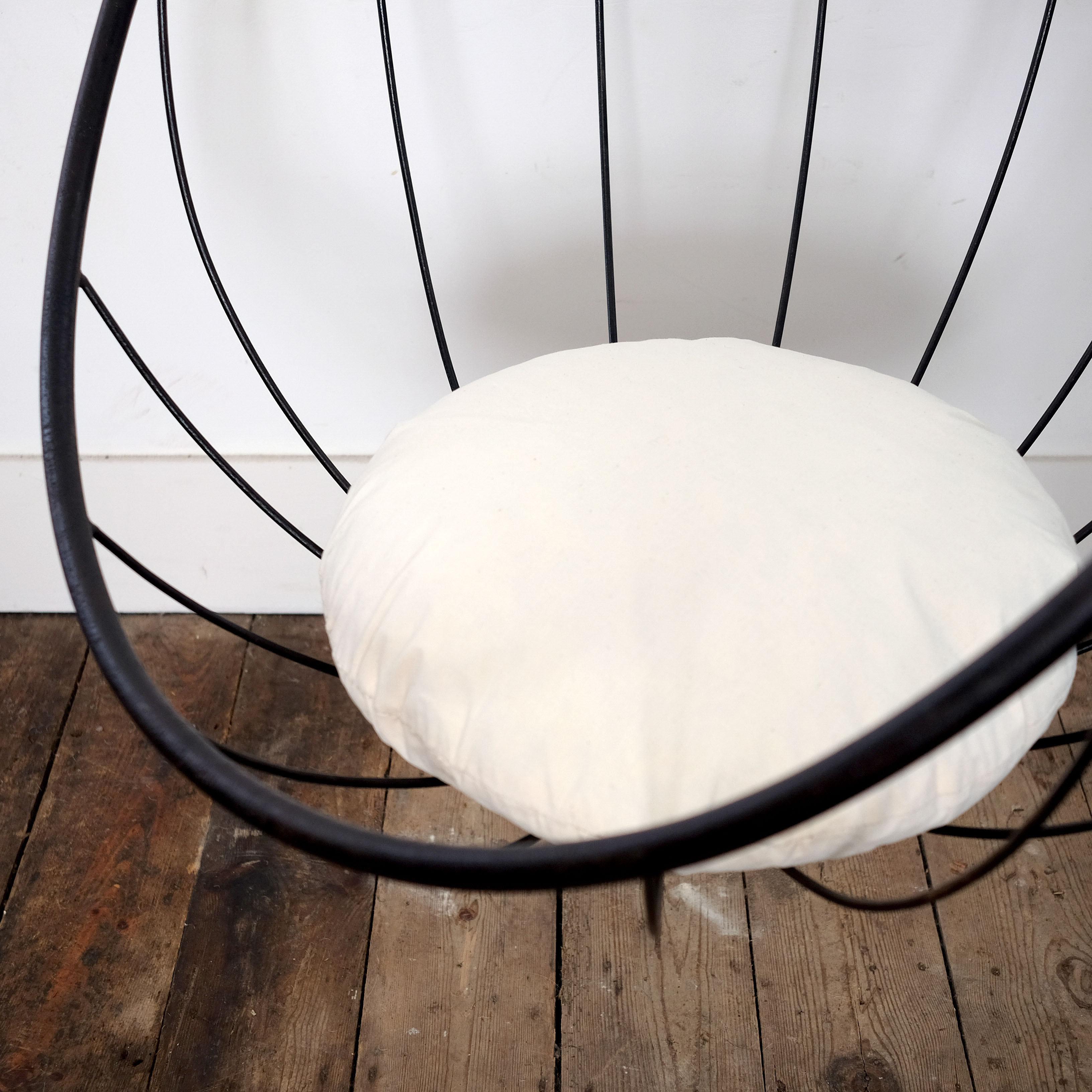 A very stylish French mid 20th century hanging chair. Wrought iron frame in the original black finish with a calico squab cushion. Super form and great lines. Can be used indoors or outdoors if covered in bad weather.