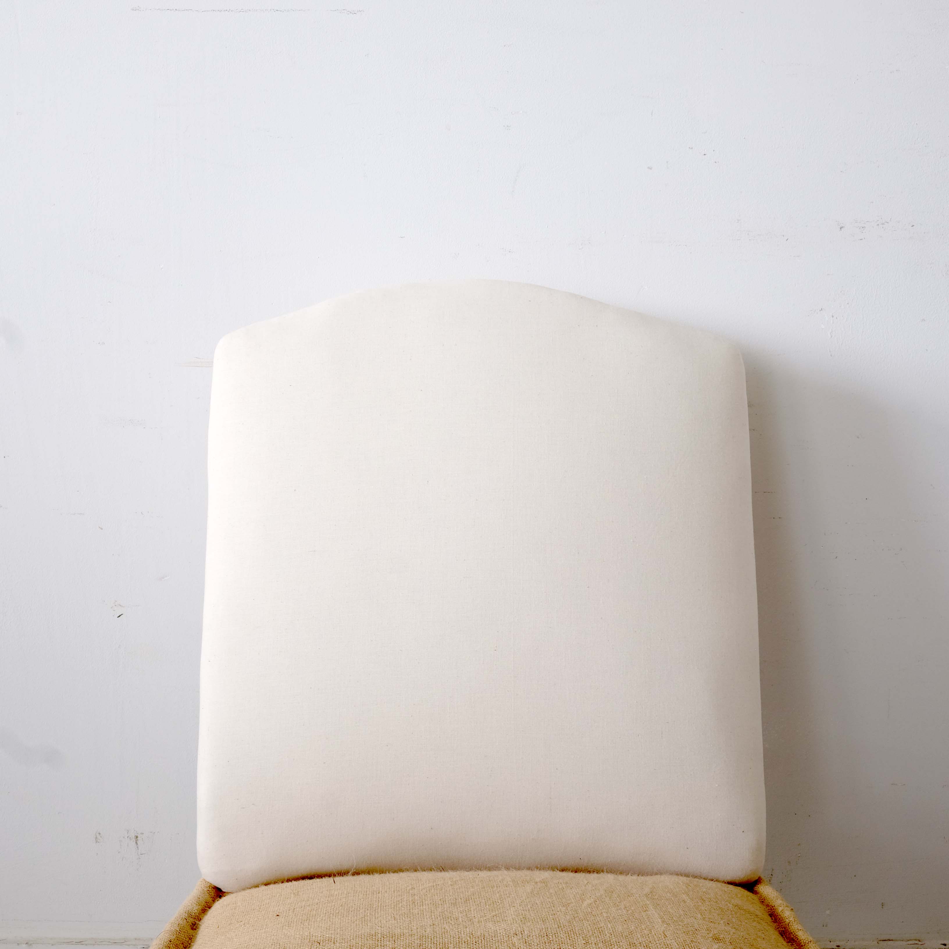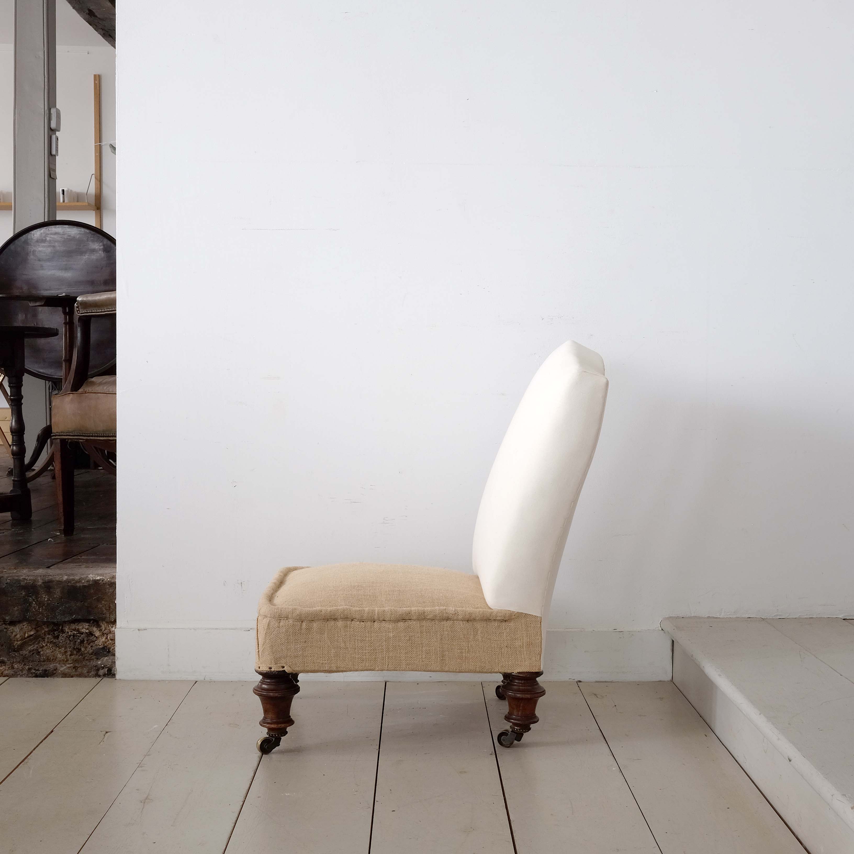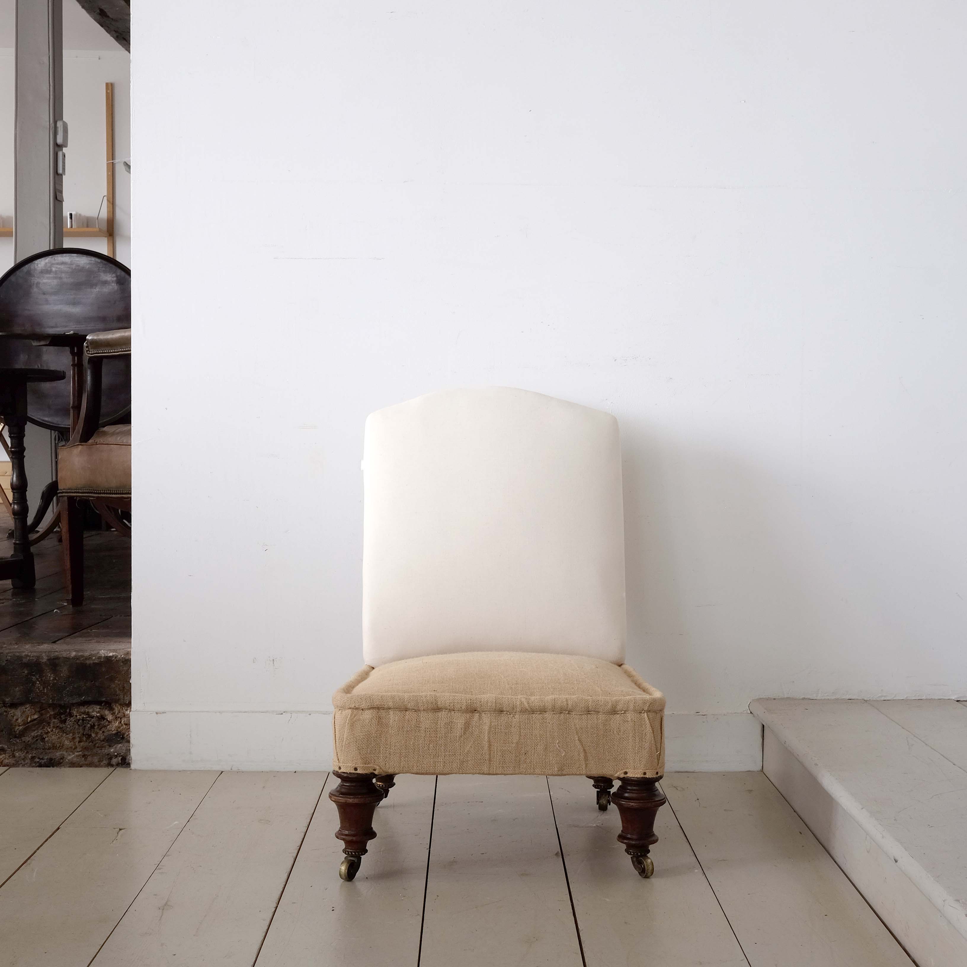 A very good quality late 19th century English slipper chair with turned walnut legs front and back on the original brass castors. Recovered in hessian and calico using traditional methods. Ready to use or ready for your material.