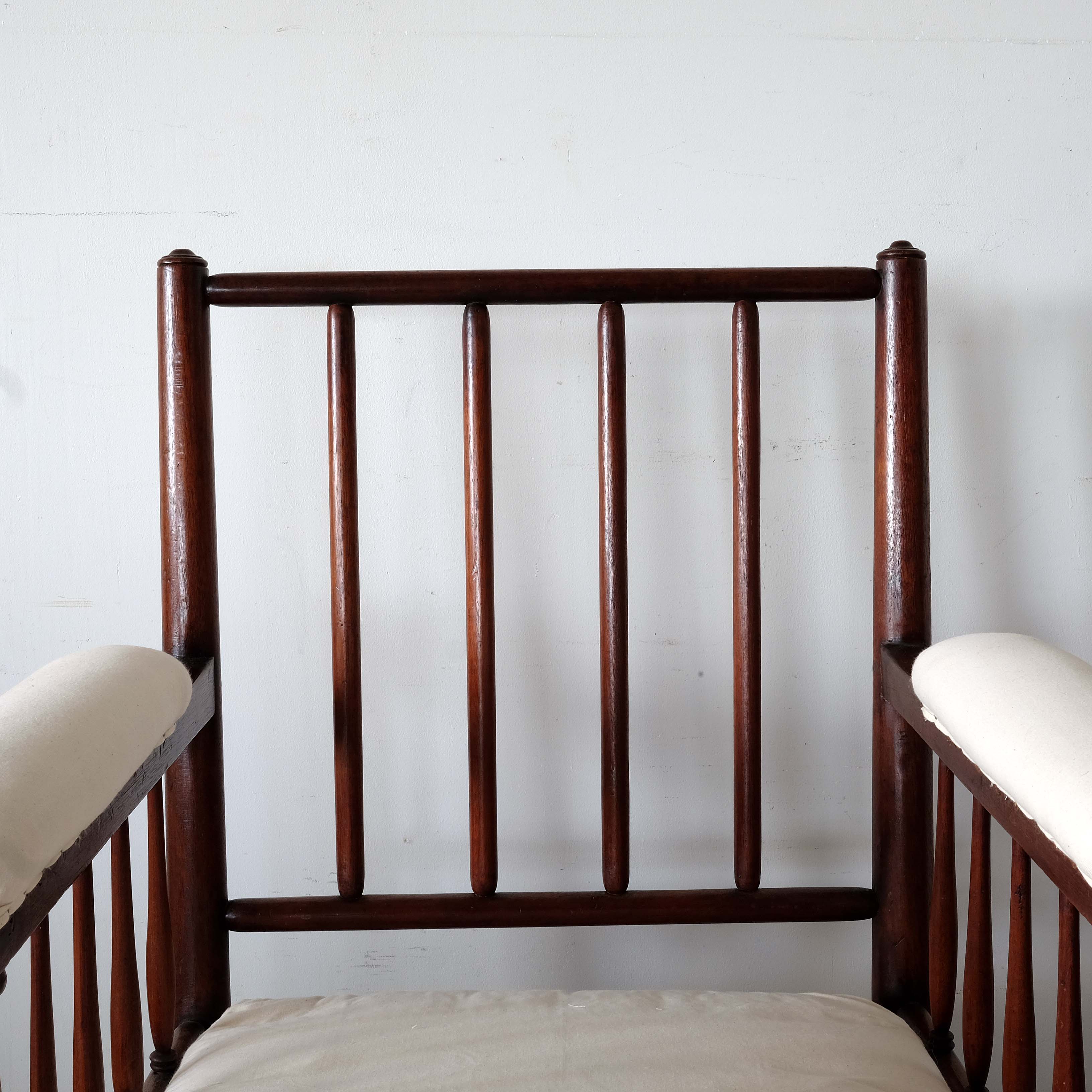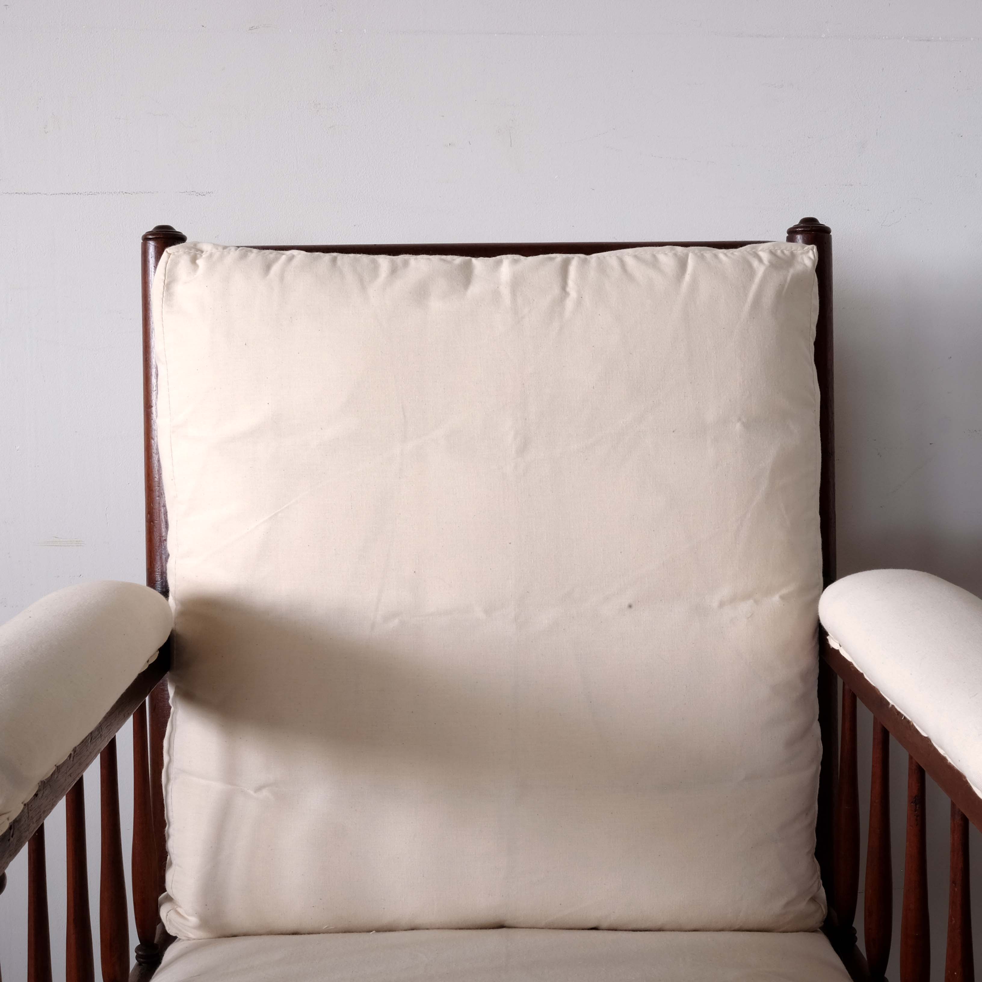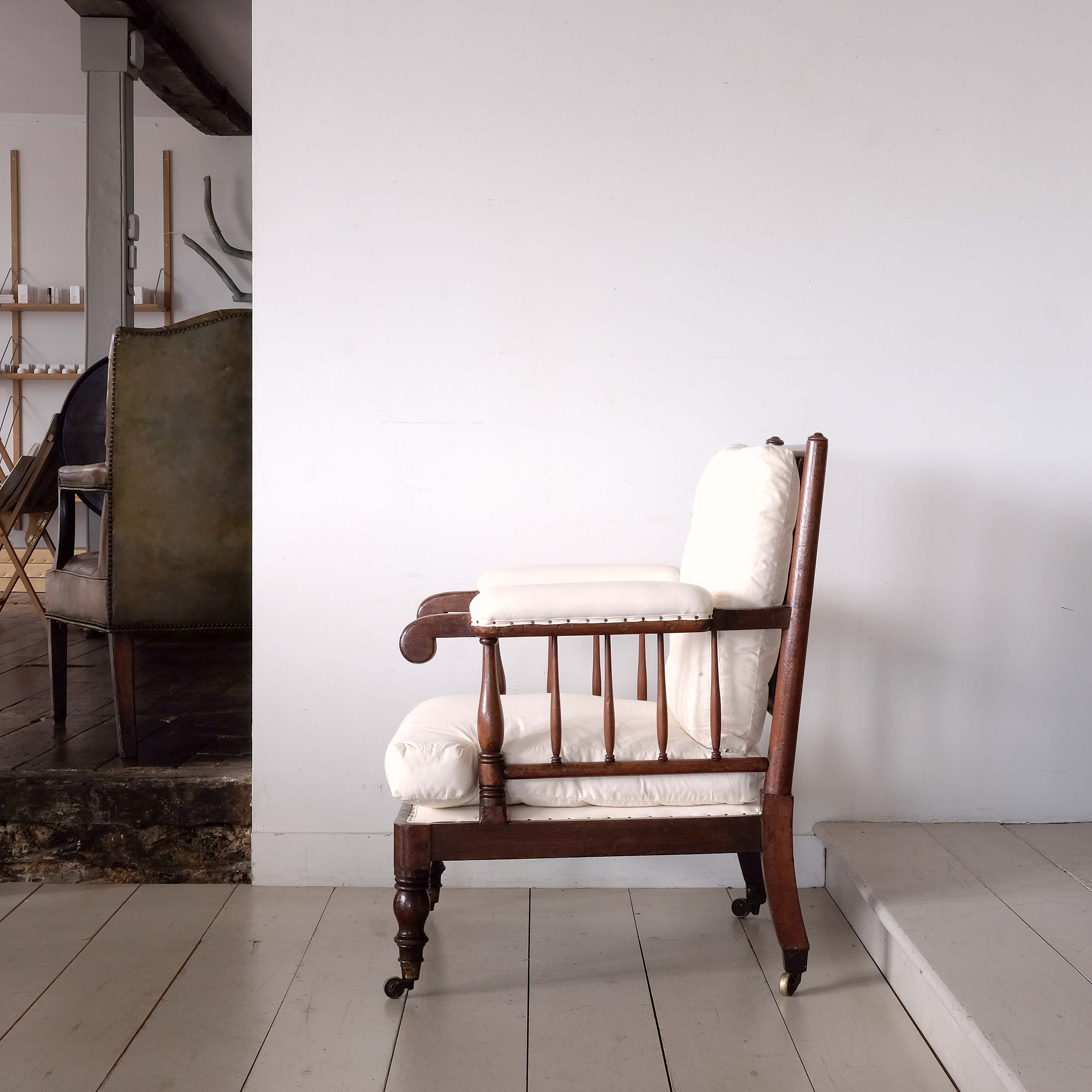 A very smart English Regency library armchair, circa 1820, in mahogany with comfortable feather swab cushions. Quality mahogany frame with finely turned arm and back supports. Elegant legs on original castors.