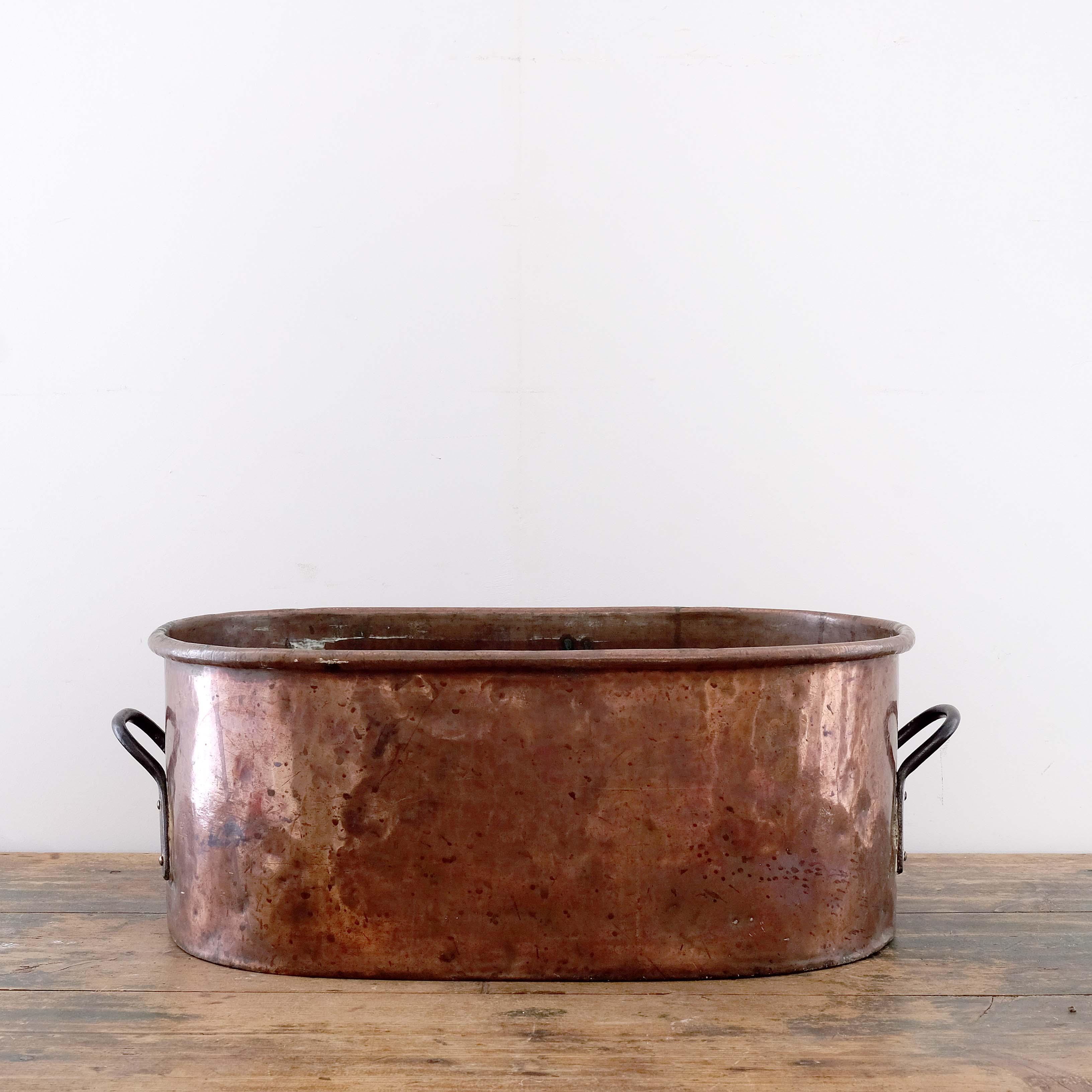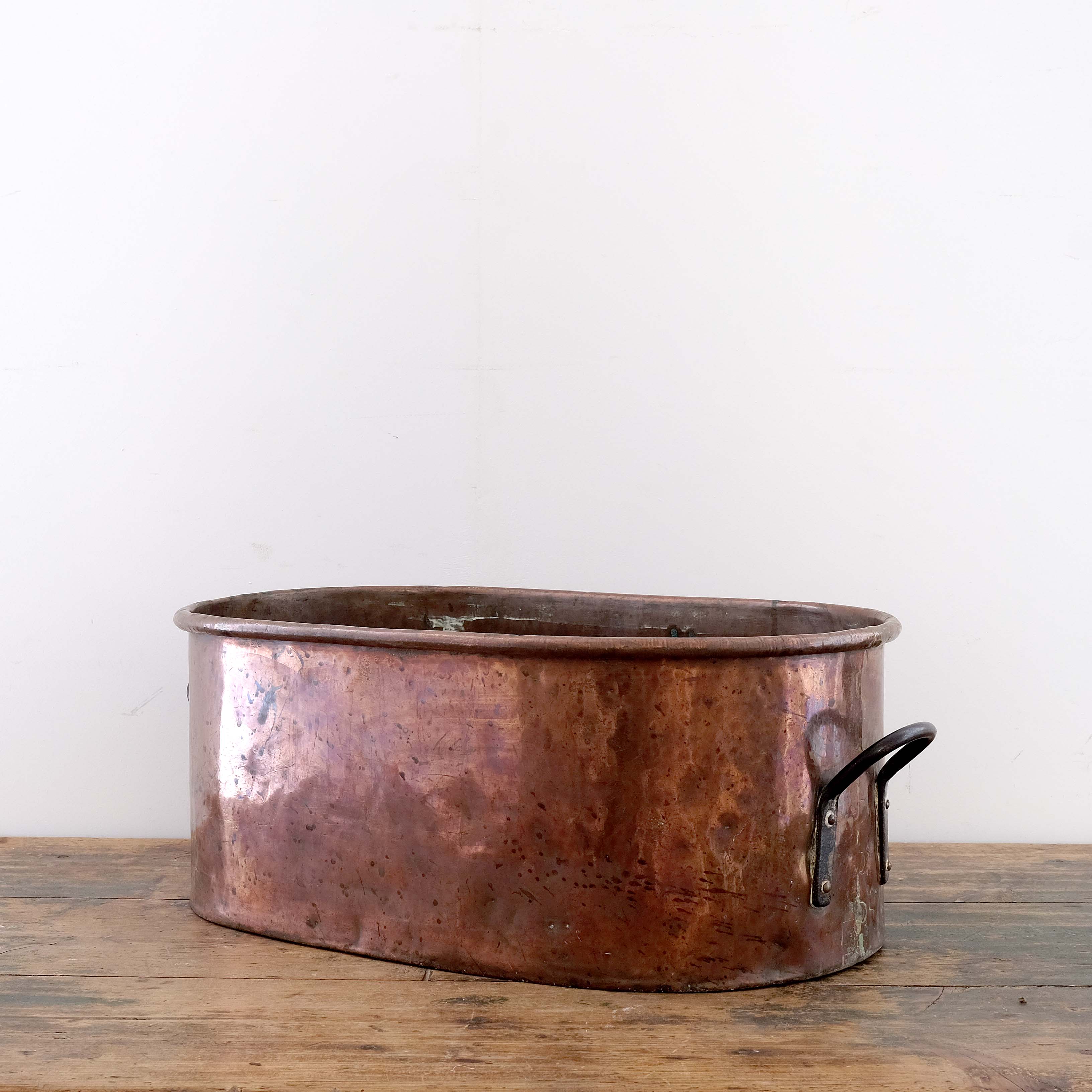 19th century antique French copper vessel/ boiling pan with riveted copper handles. Lovely shape and signs of age and wear. Good patination to the copper.