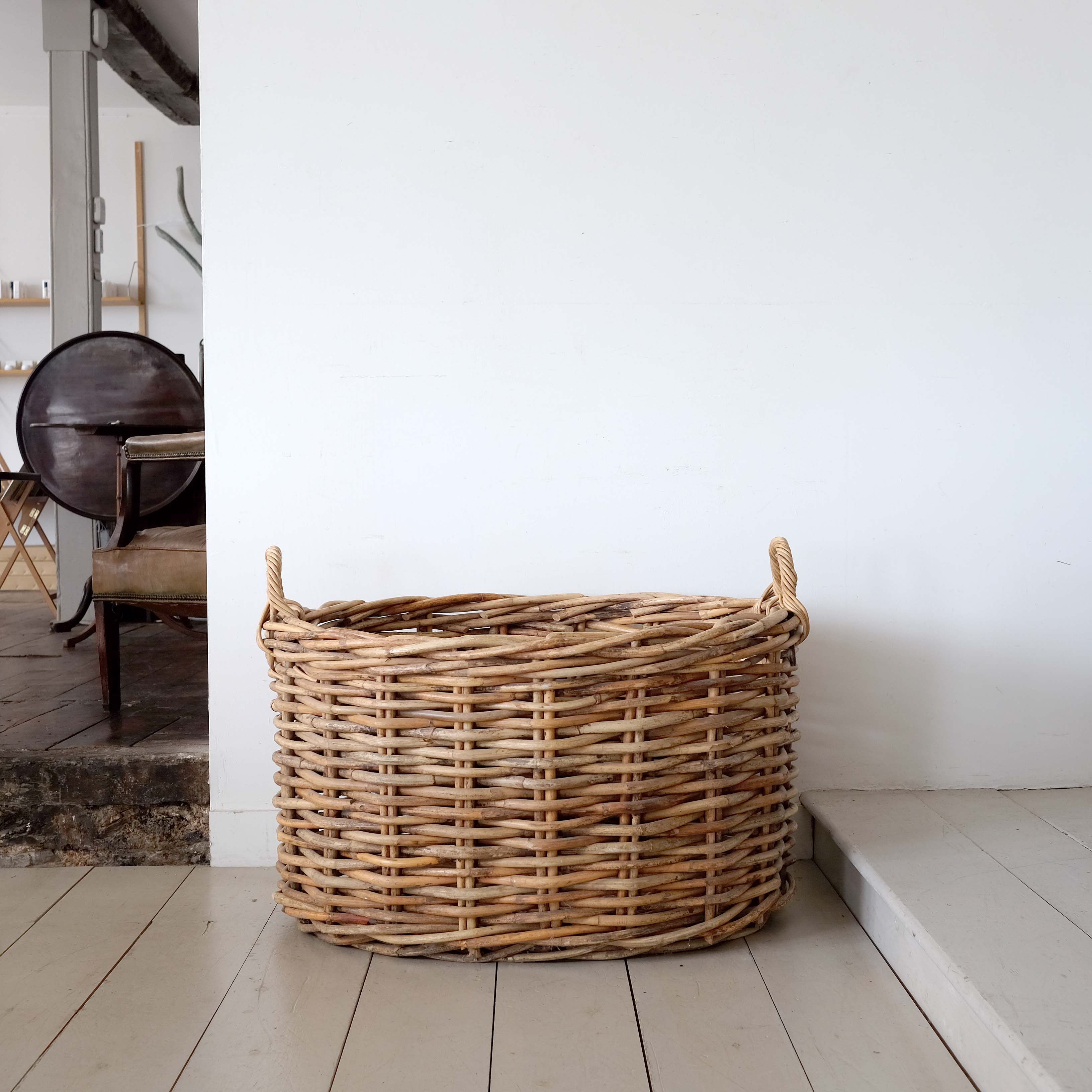 A large scale country house log basket, early 20th century, unusual oval form woven in willow. In good condition and perfect for storing logs.