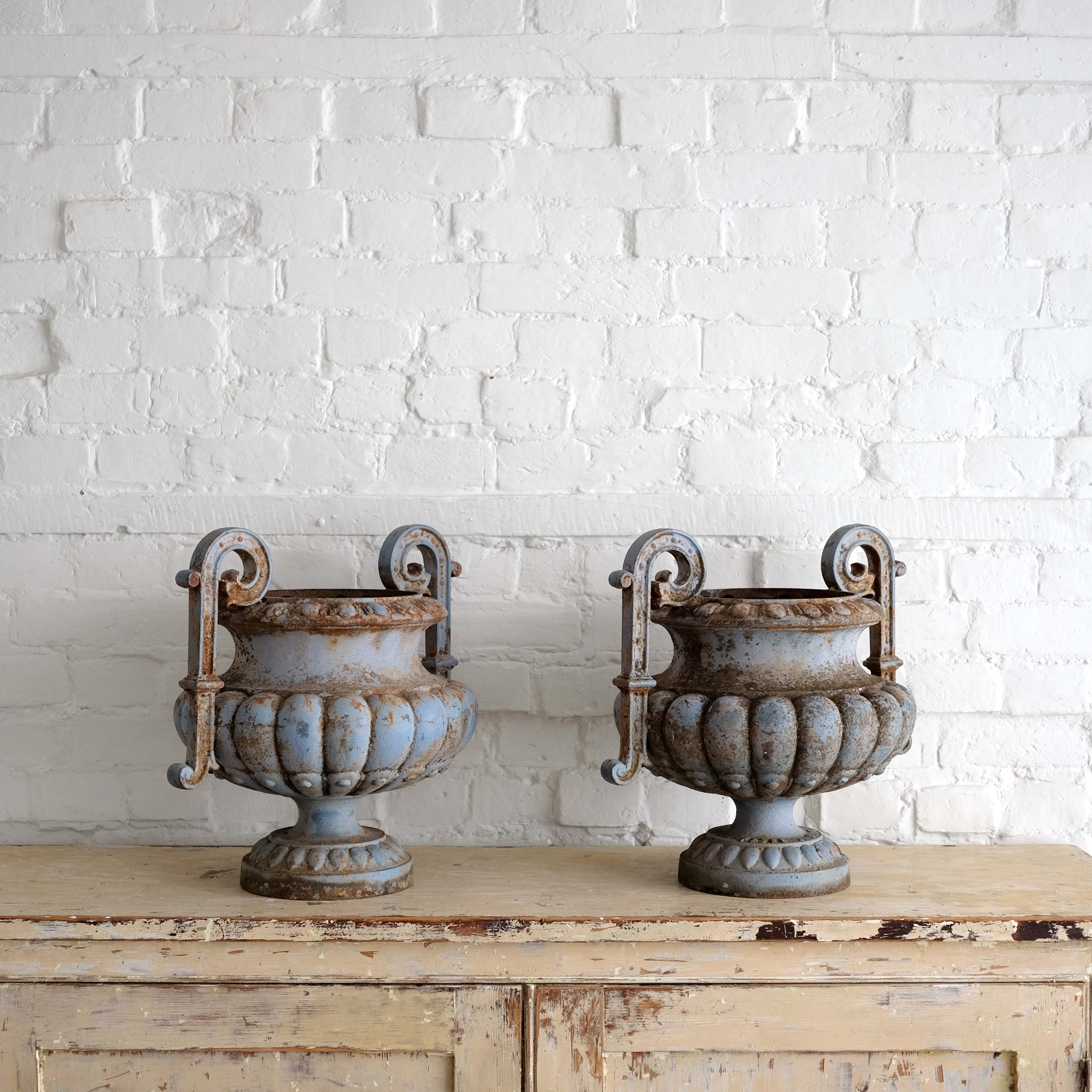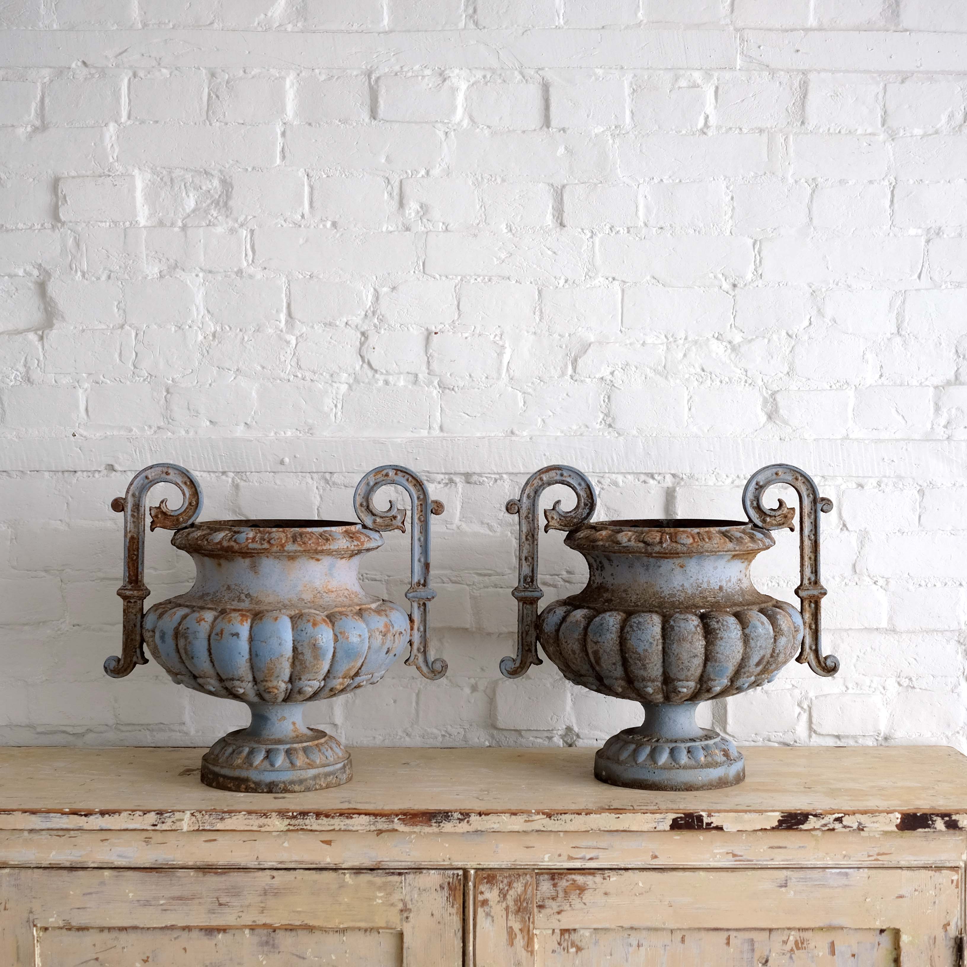 An antique pair of French cast iron urns, circa 1890. Elegant neo classic form with remnants of the lovely and unusual blue paint.