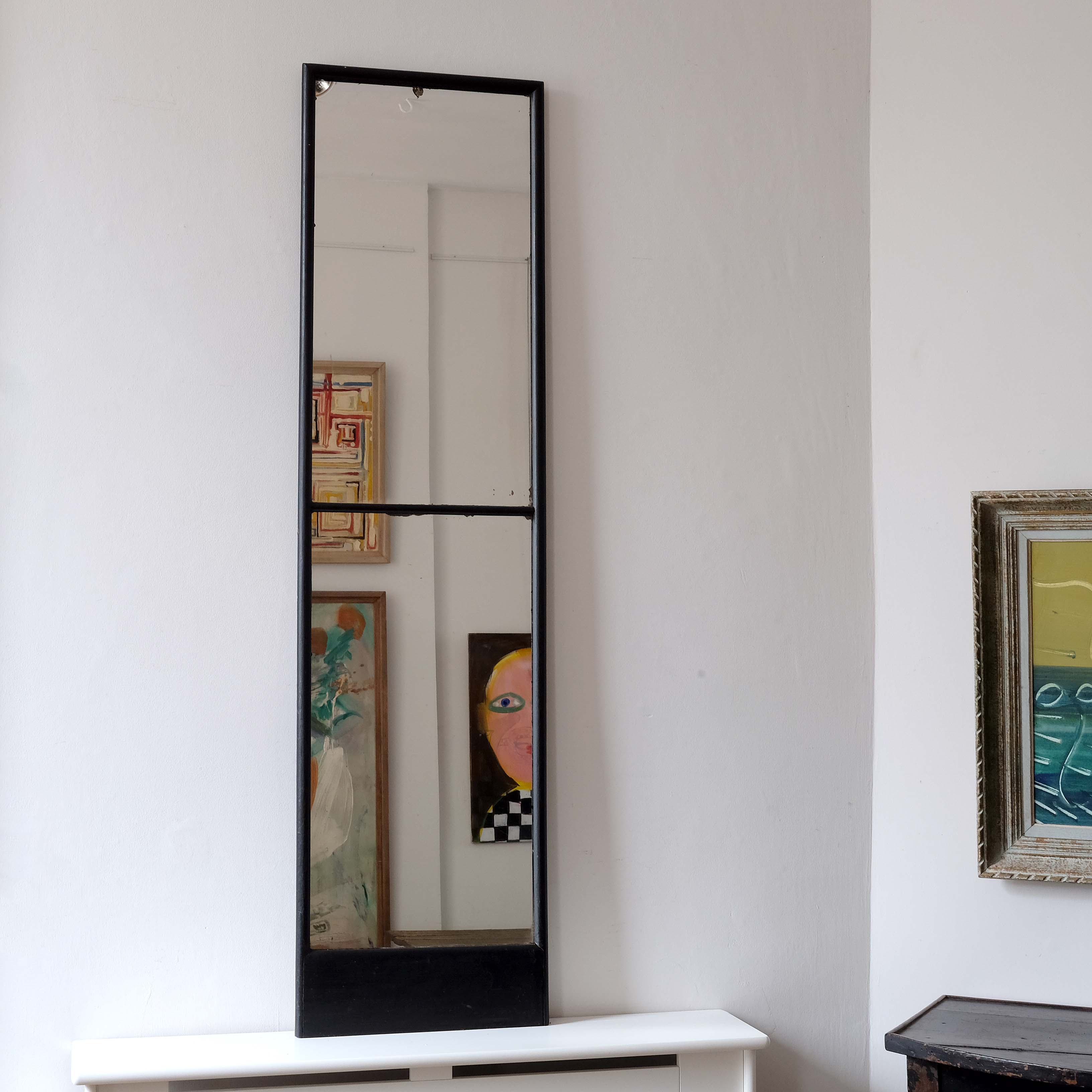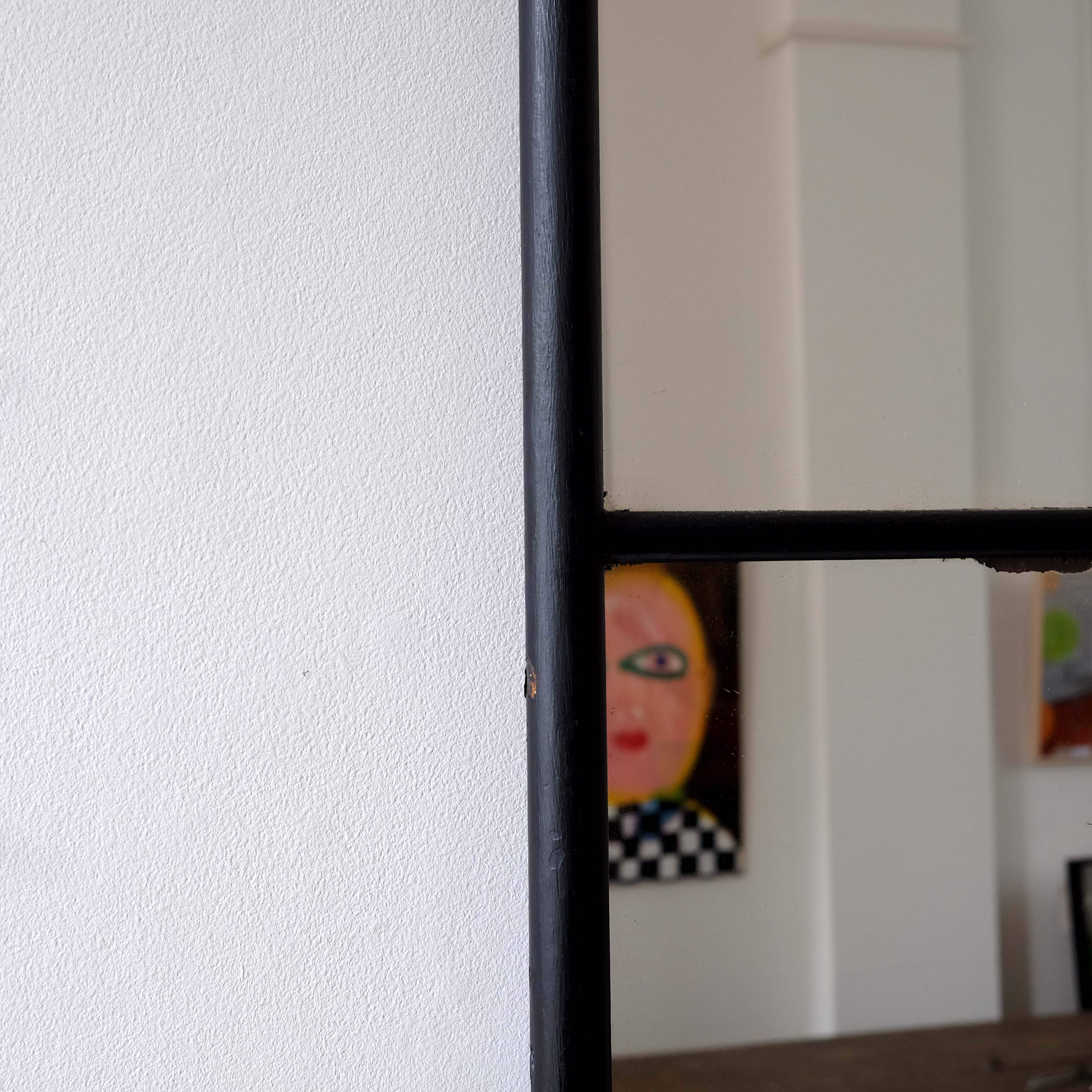 An early 20th century French shop mirror, original plates and back, elegant bull nose frame, unusual sectioned design. Accompanied by a similar 19th century English shop mirror with original sparkly mercury plates. They were bought independently of each other but we feel they work well as a pair. Sold separately.