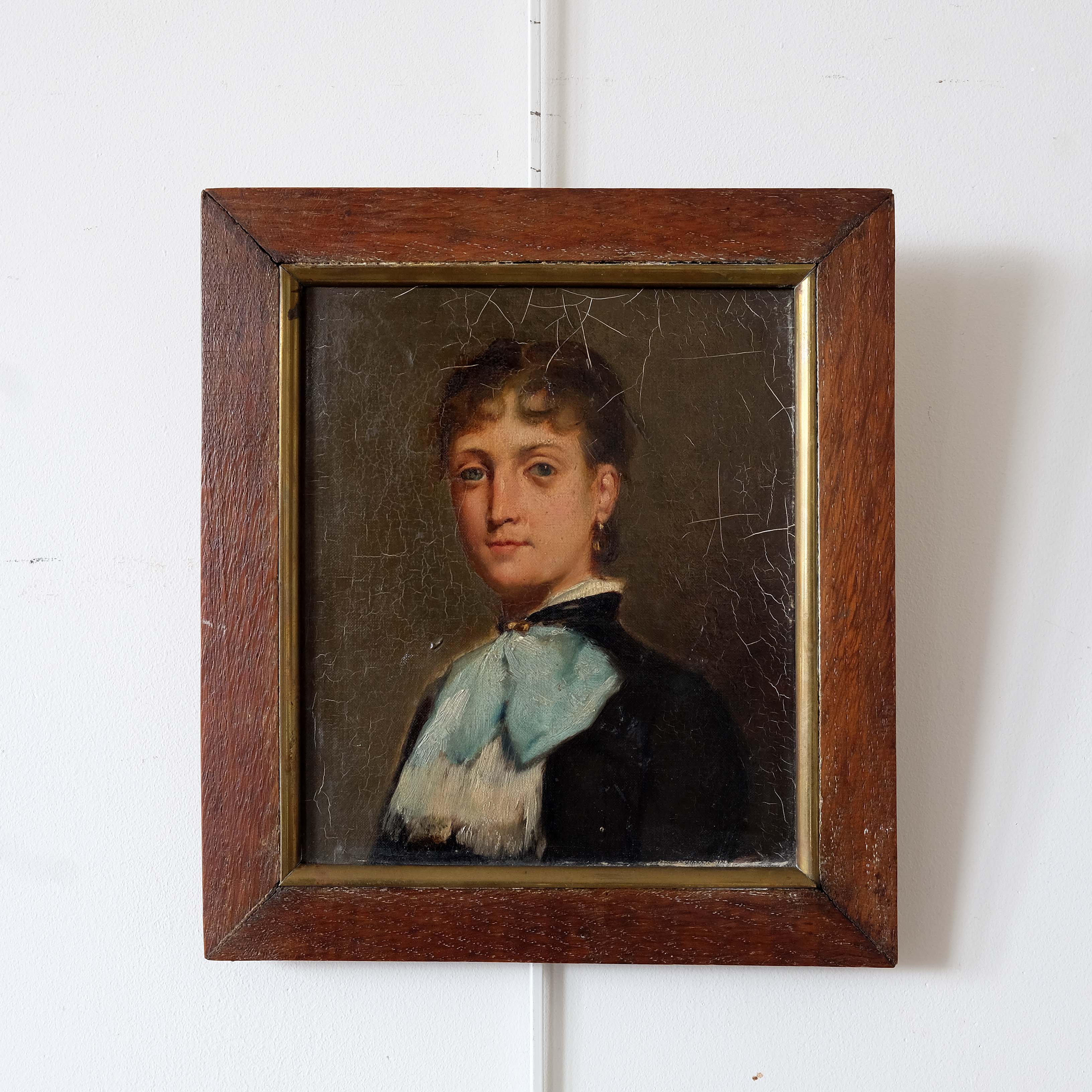 A very arresting portrait of a young French lady, oil on board, in an antique frame. Sitter and artist unknown but well executed capturing the sitters kind features.