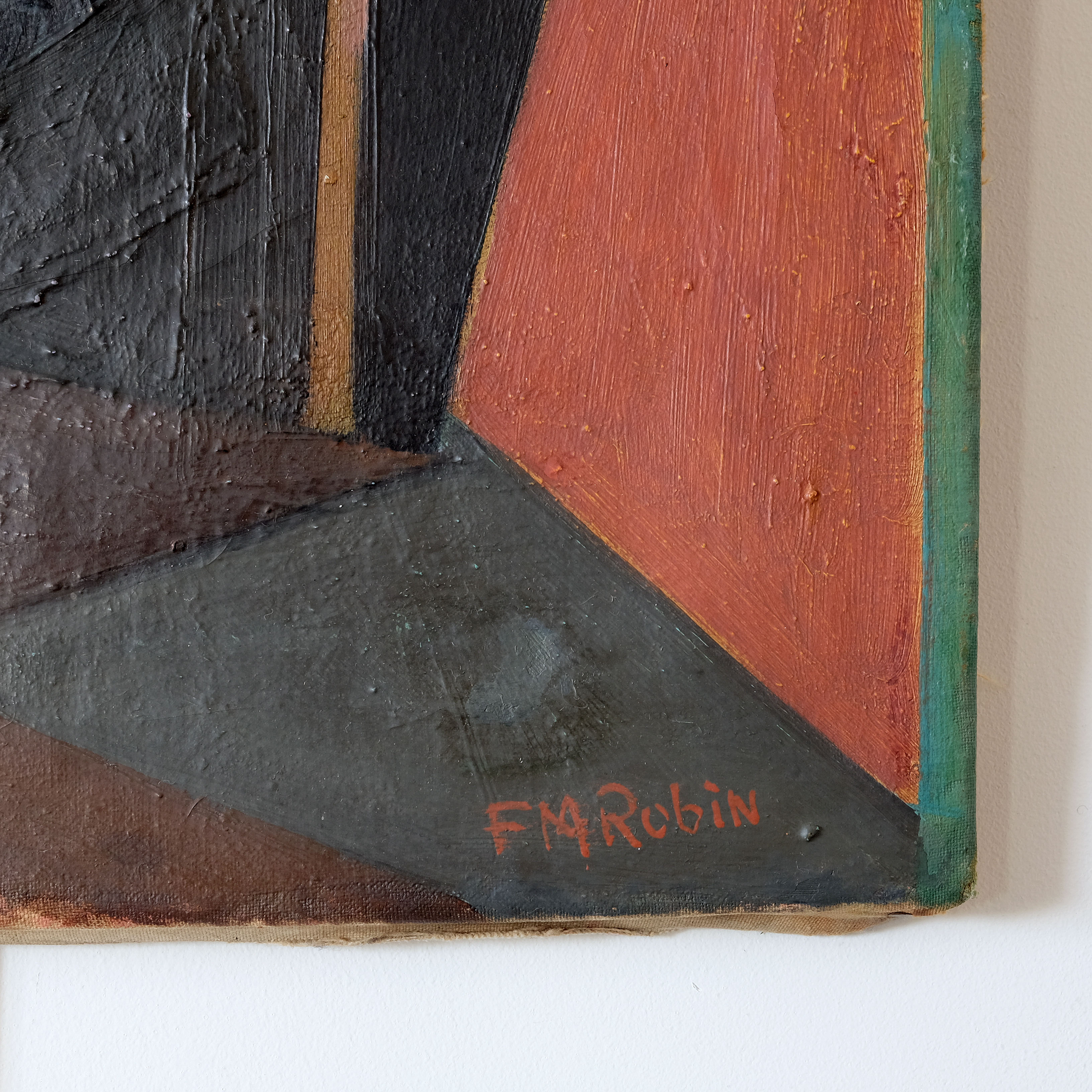 A very striking French abstract cubist composition, mid 20th century, oil on canvas, signed FM Robin. Artist unknown but confidently executed with a strong palette and subtle notion that it could be a portrait.