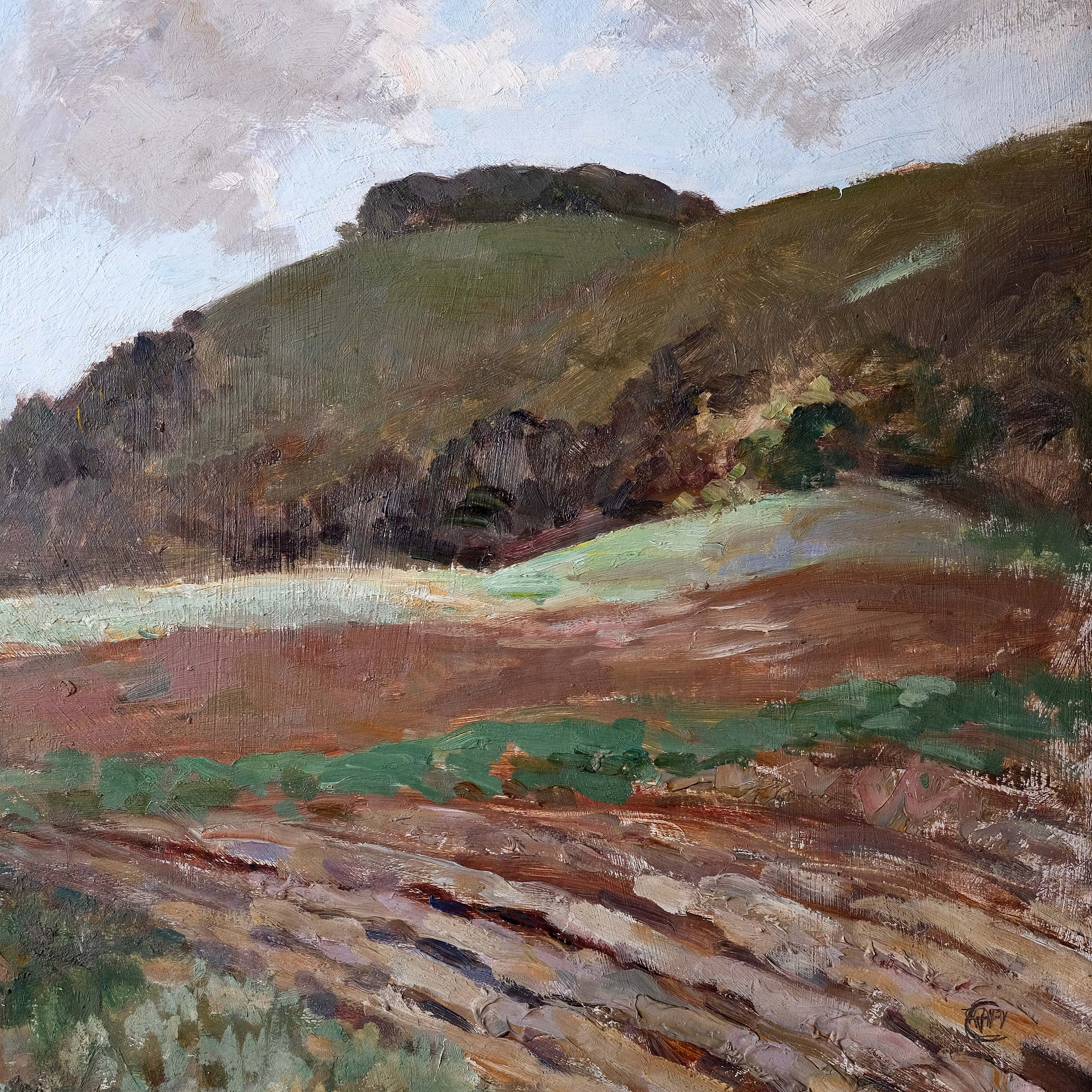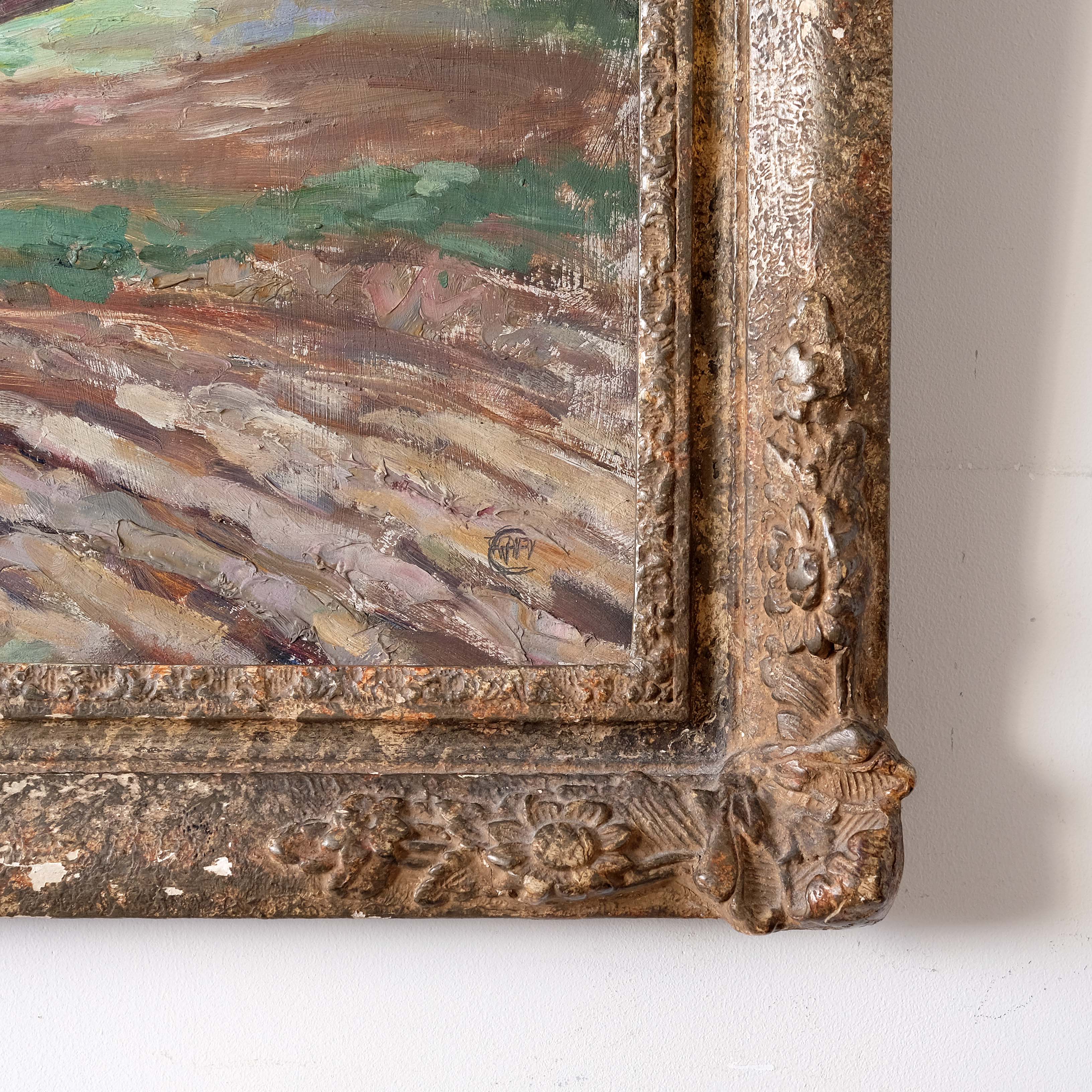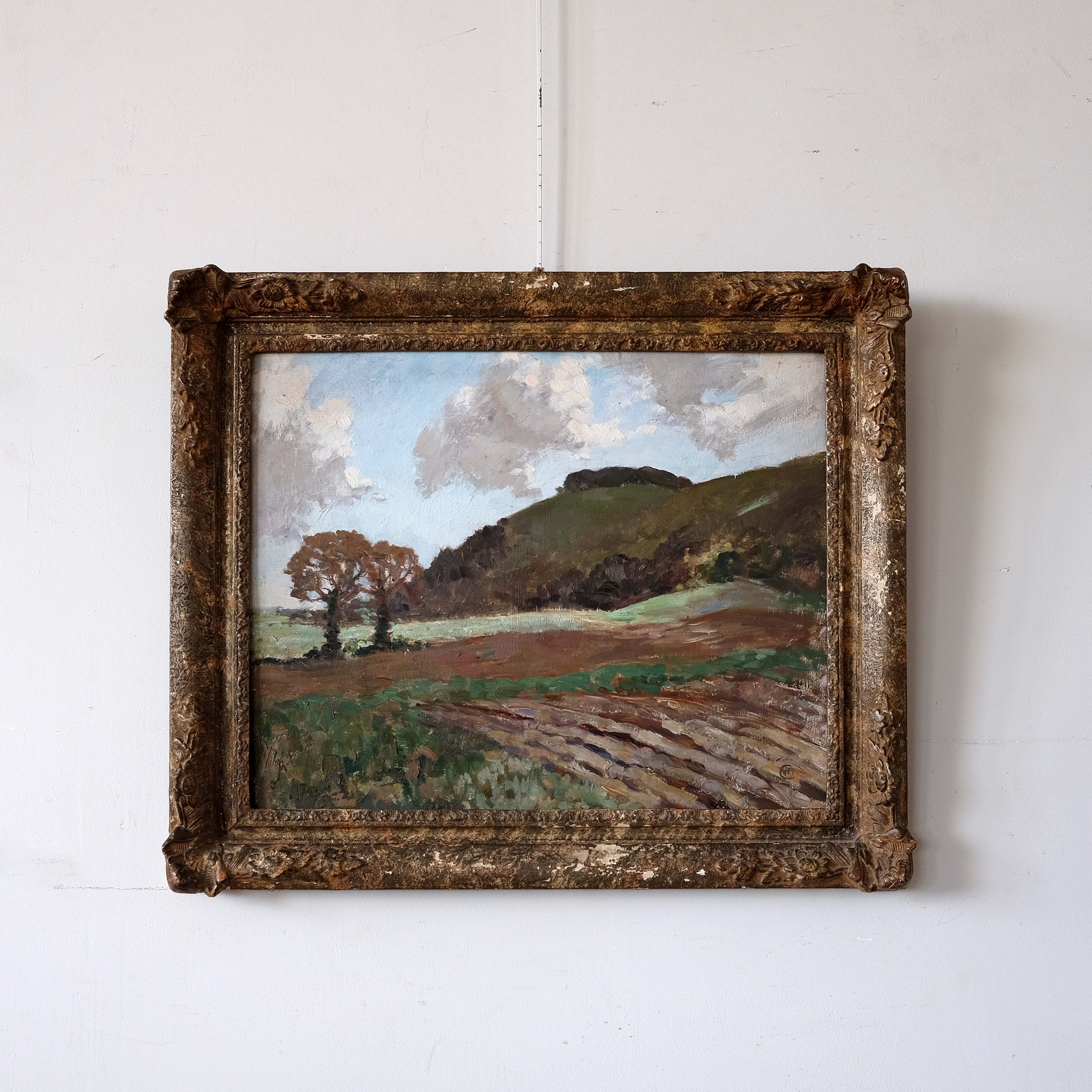 A beautiful landscape painting depicting Chantonbury Ring, Steyning, South Down National Park. Oil on board in a hand carved and gilded antique frame. Artist unknown but initialled bottom right and labelled verso.