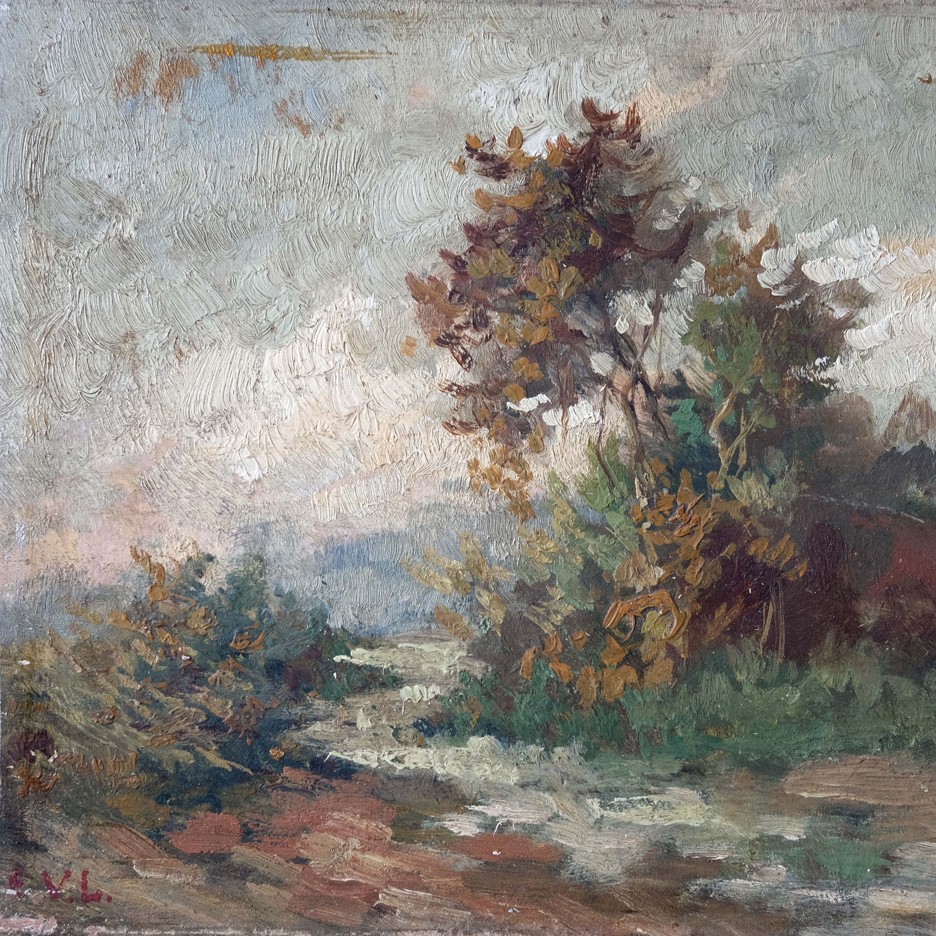 A very charming English rural scene, oil on board depicting a cottage overshadowed by a large tree, English, late 19th century, initialled E.V.L, mounted in an antique French frame.