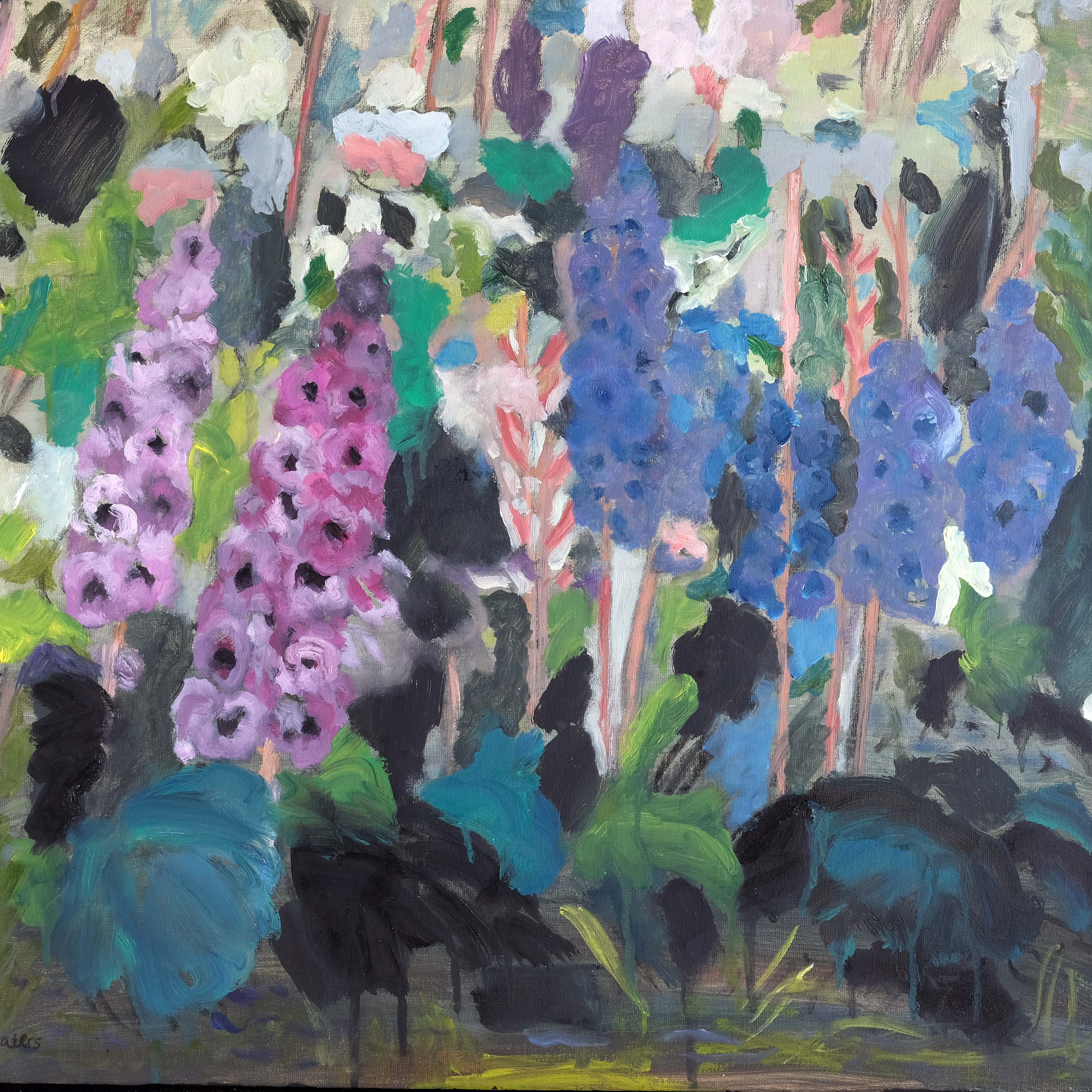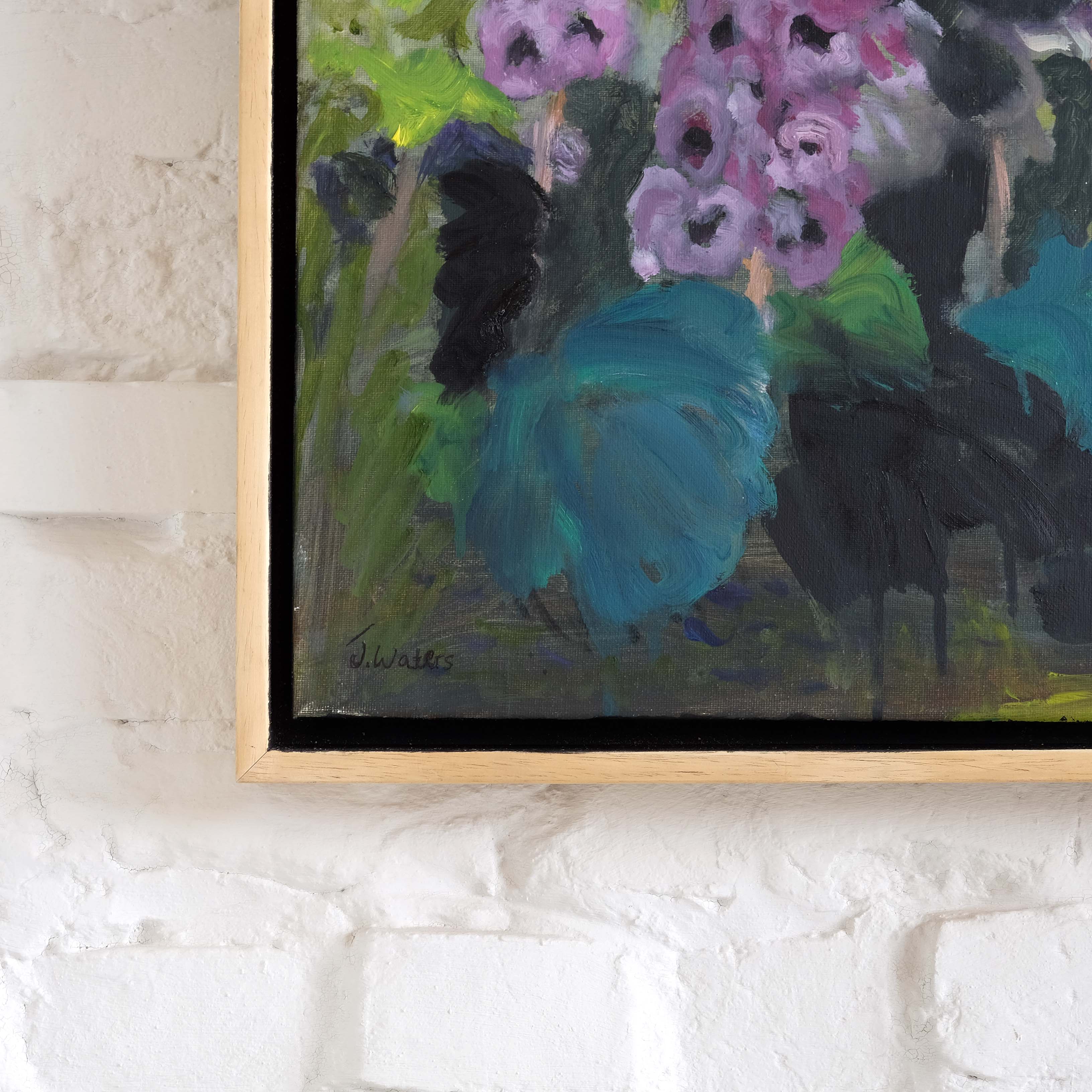 'Hollyhocks' by Jane E Waters, oil on canvas in a contemporary tray frame.