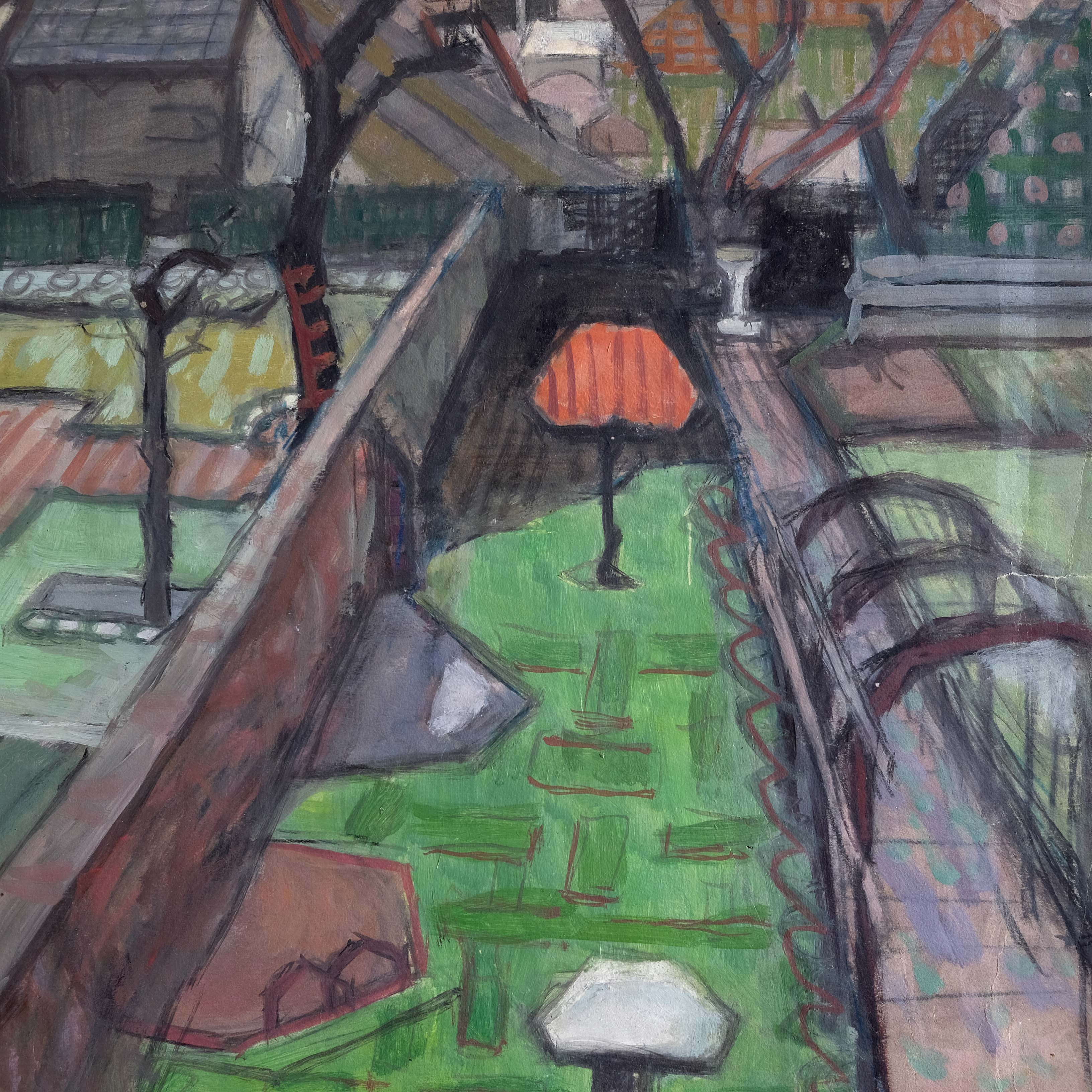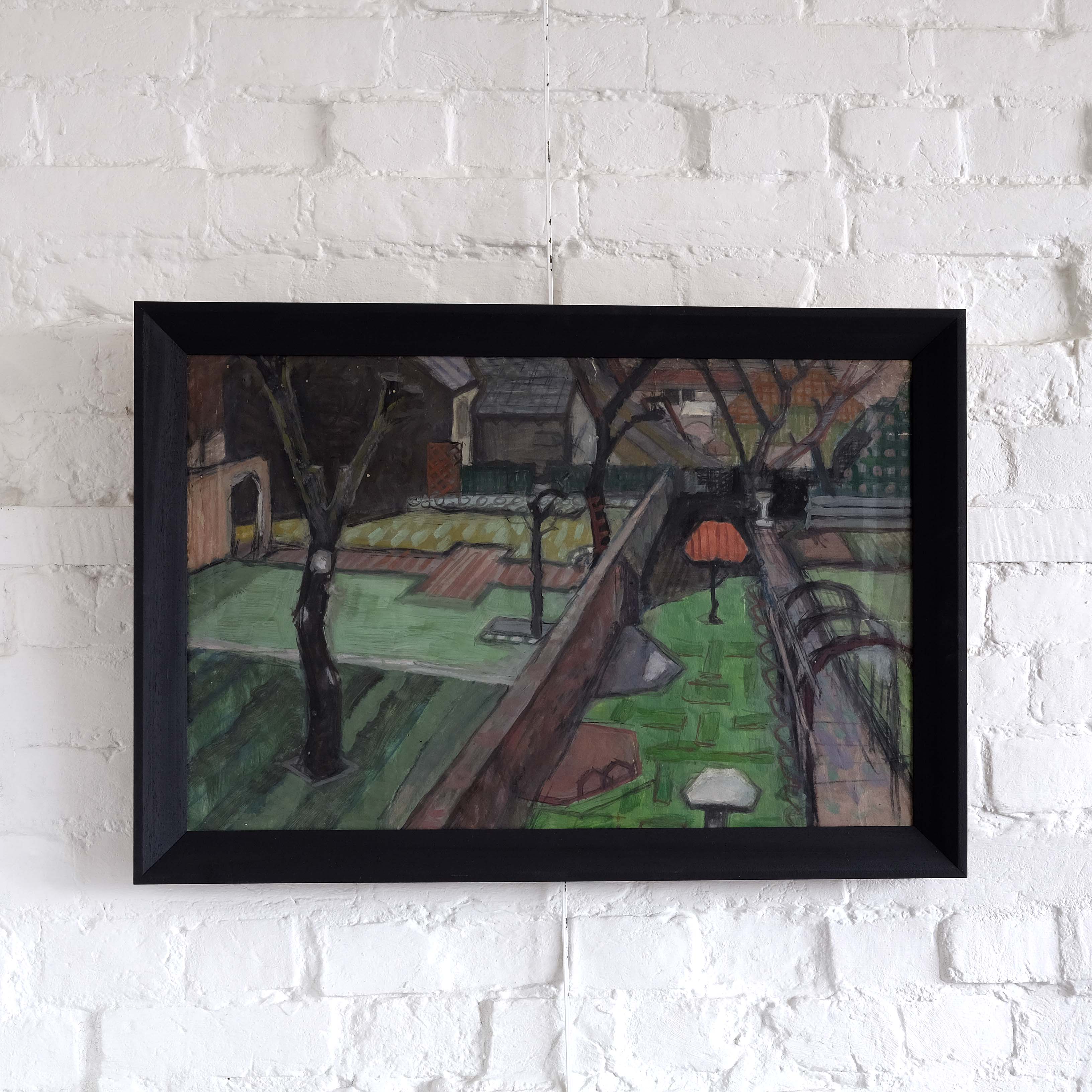 A mid 20th century British School artwork depicting gardens from a elevated window view. Oil on card in a contemporary frame. Artist unknown but a stylish sketchy execution and slightly off kilter perspective with muted palette.