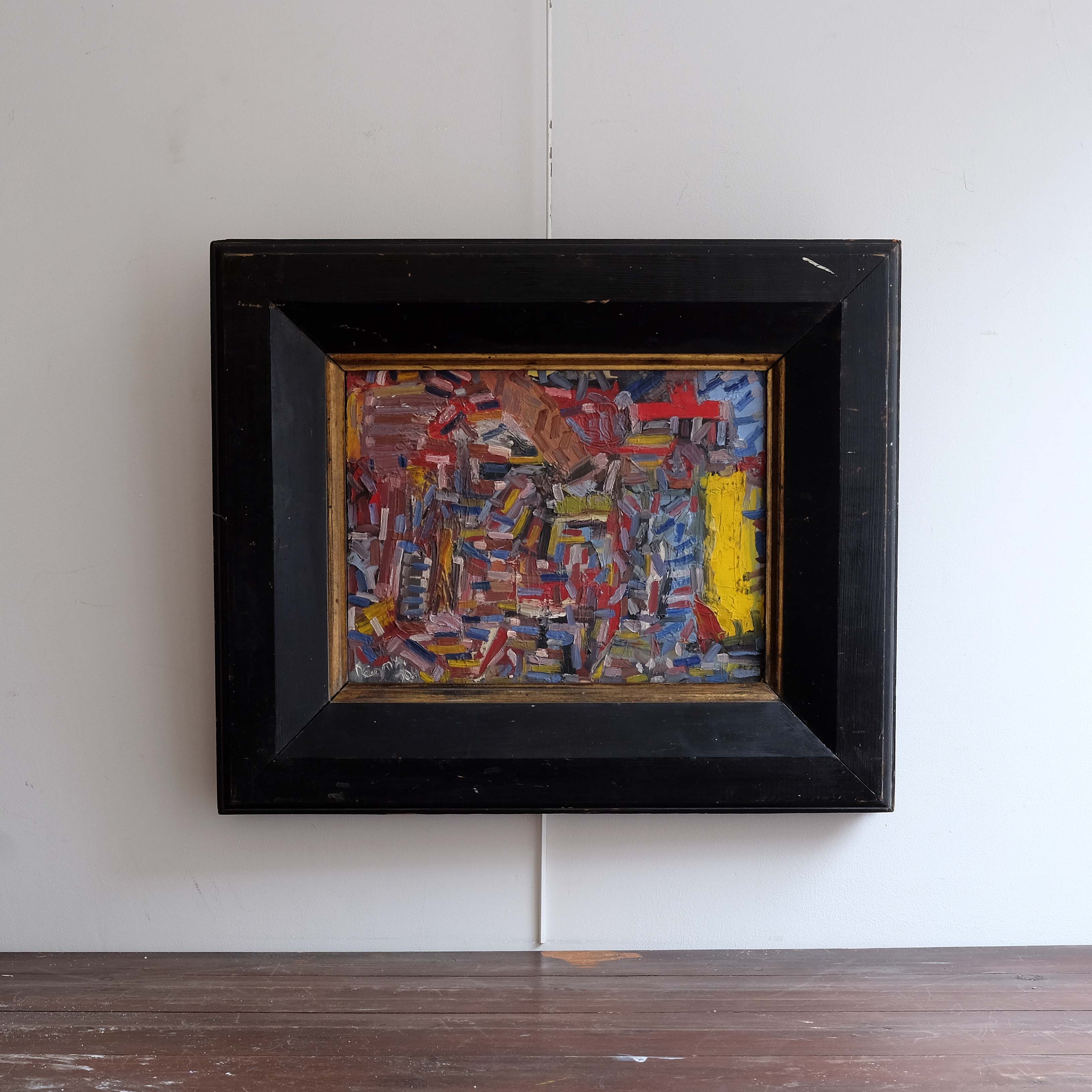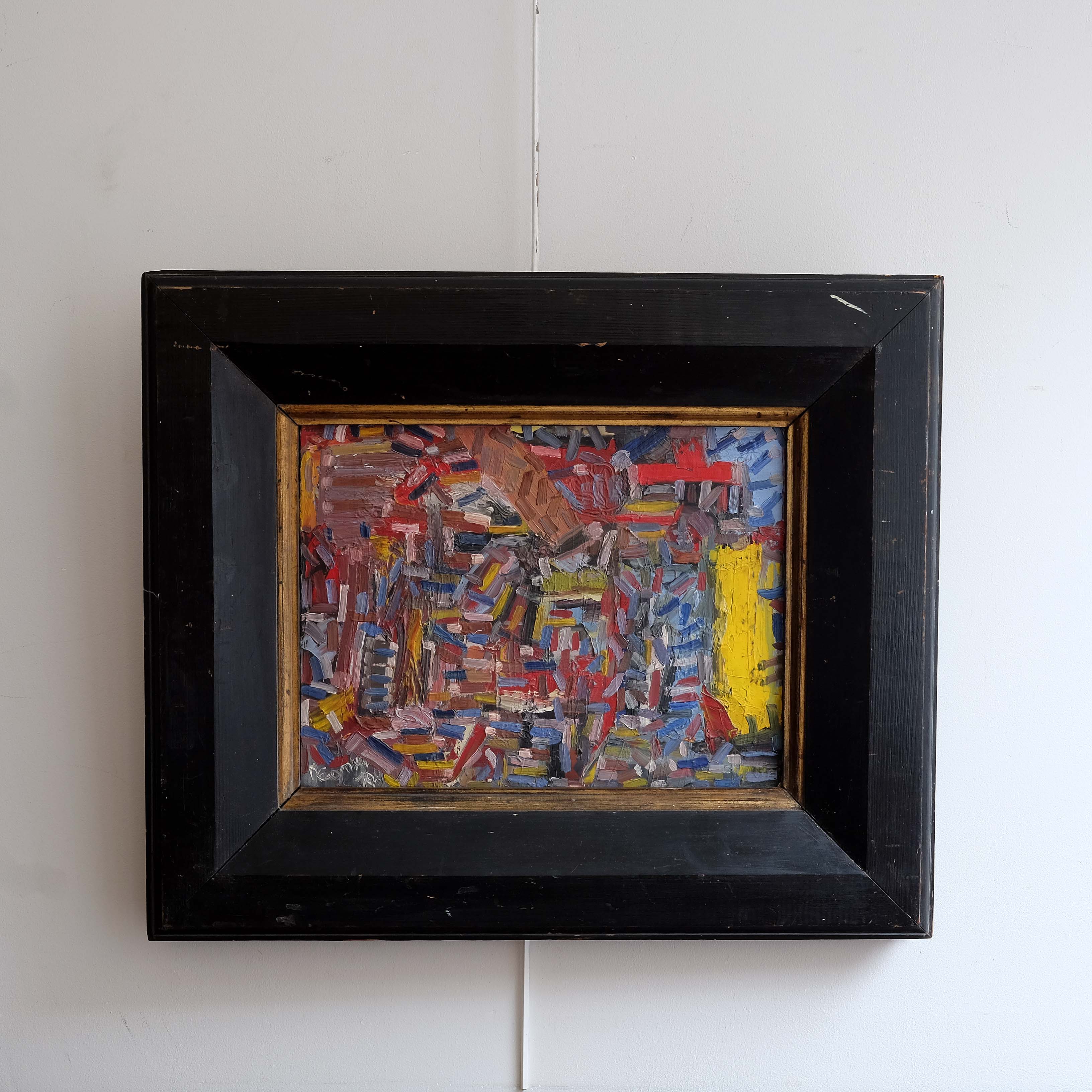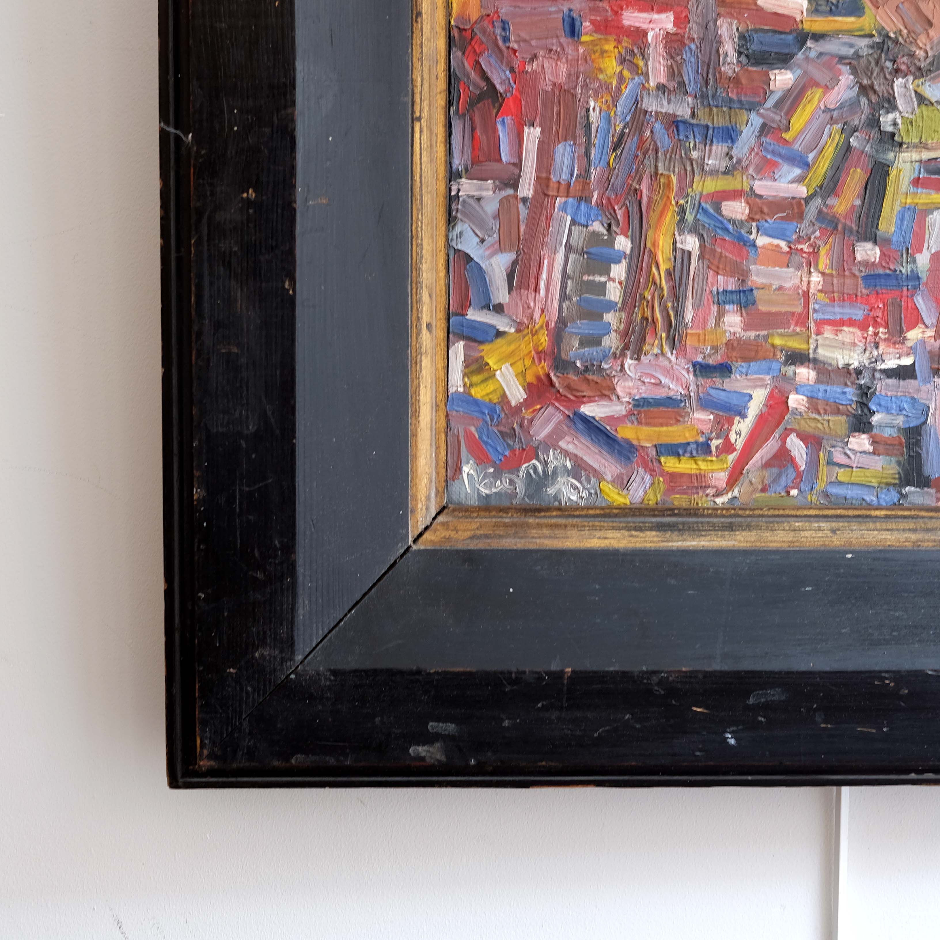 Mid 20th century abstract composition, oil on canvas, paired with a substantial antique frame. Scribed verso 'La Chaise de Venue' signed and dated 1951. Confident mark making with a very striking colour palette.