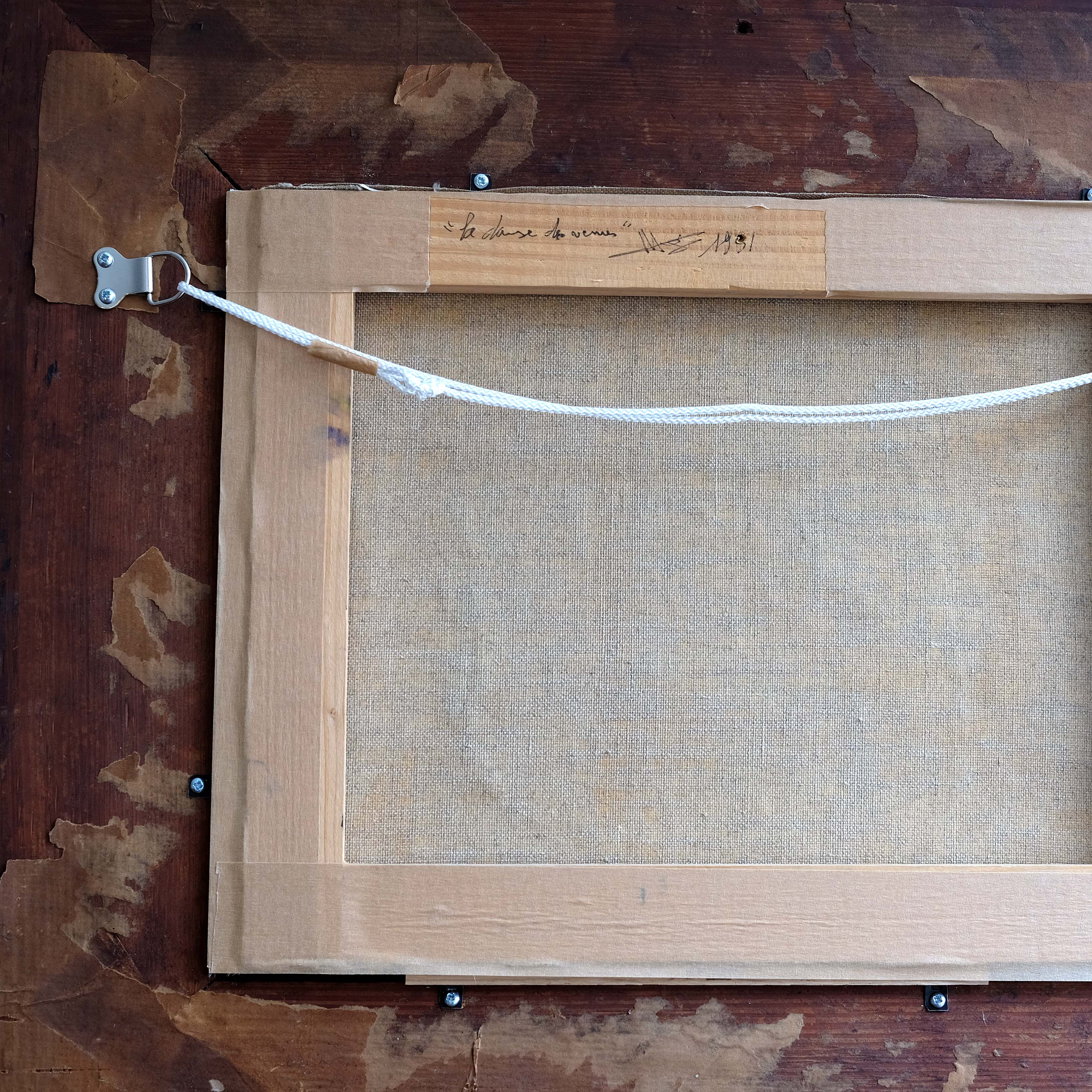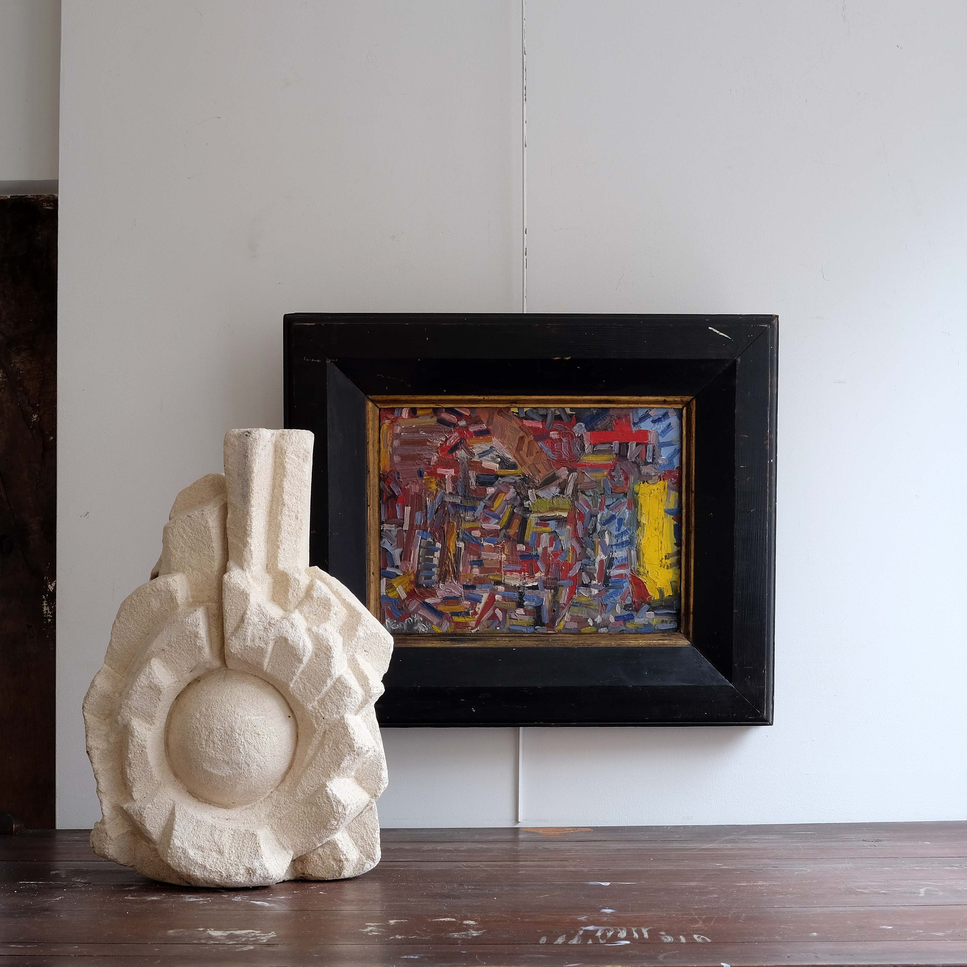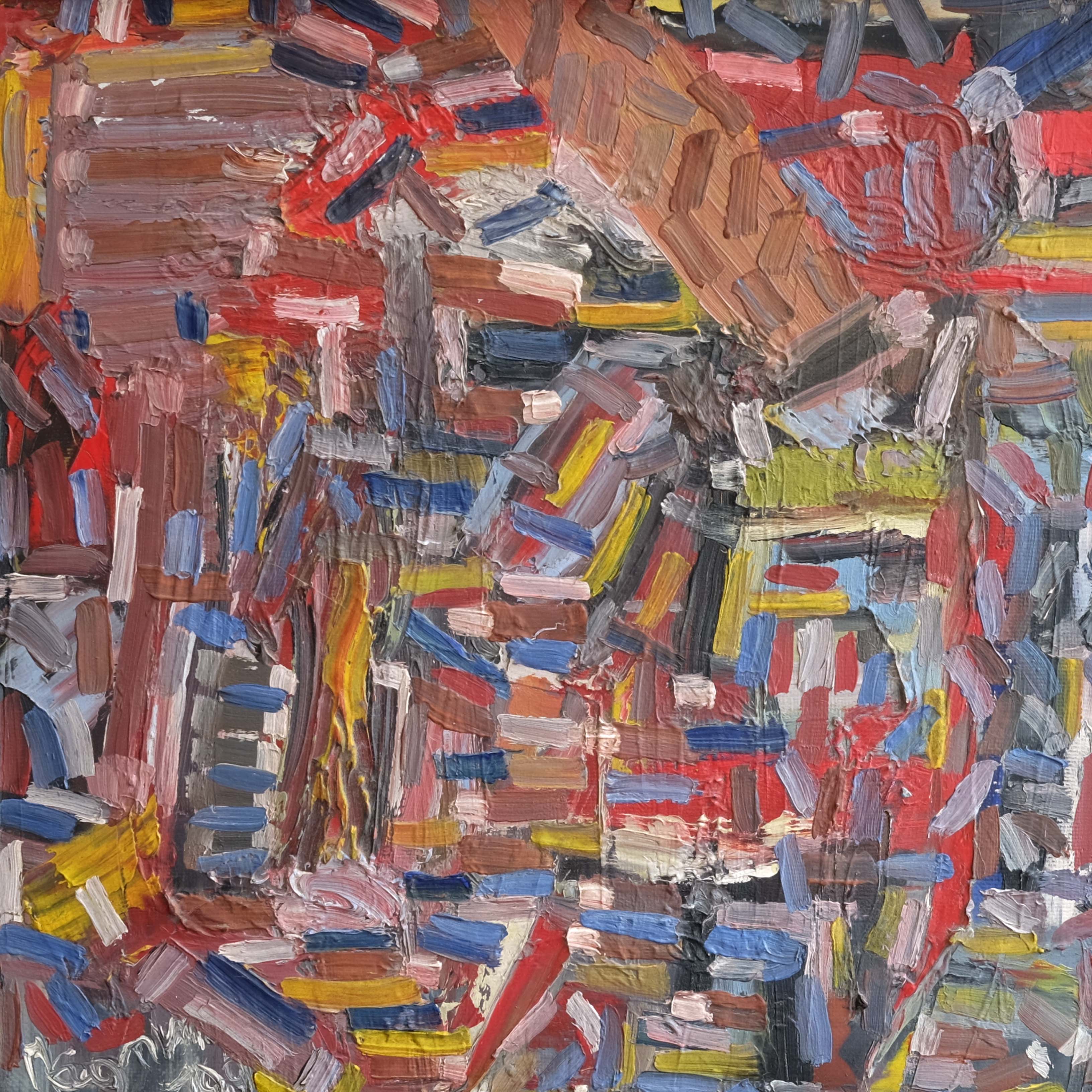 Mid 20th century abstract composition, oil on canvas, paired with a substantial antique frame. Scribed verso 'La Chaise de Venue' signed and dated 1951. Confident mark making with a very striking colour palette.