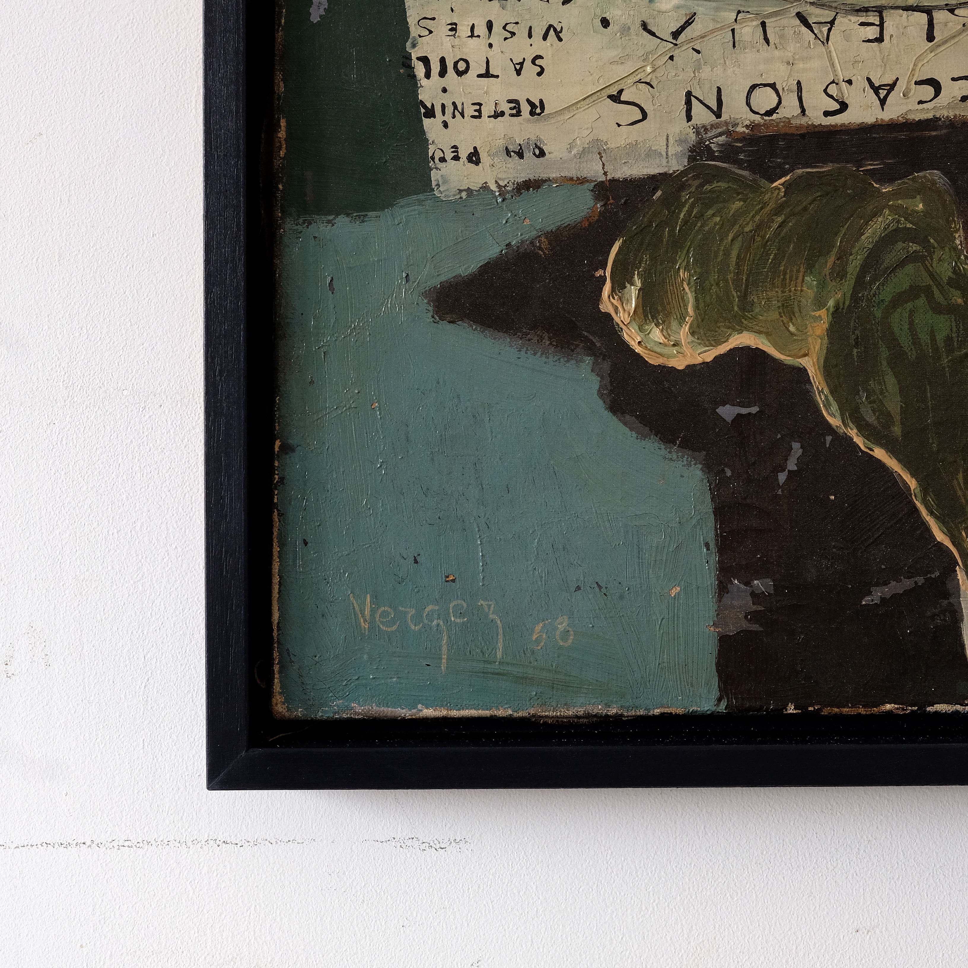 Mid 20th century oil on canvas depiting a fish and other items, oil on canvas, France, signed Vergez .58. A great piece and wonderful cubist abstract execution that almost gives the feel of a collage. Framed in a contemporary tray frame.