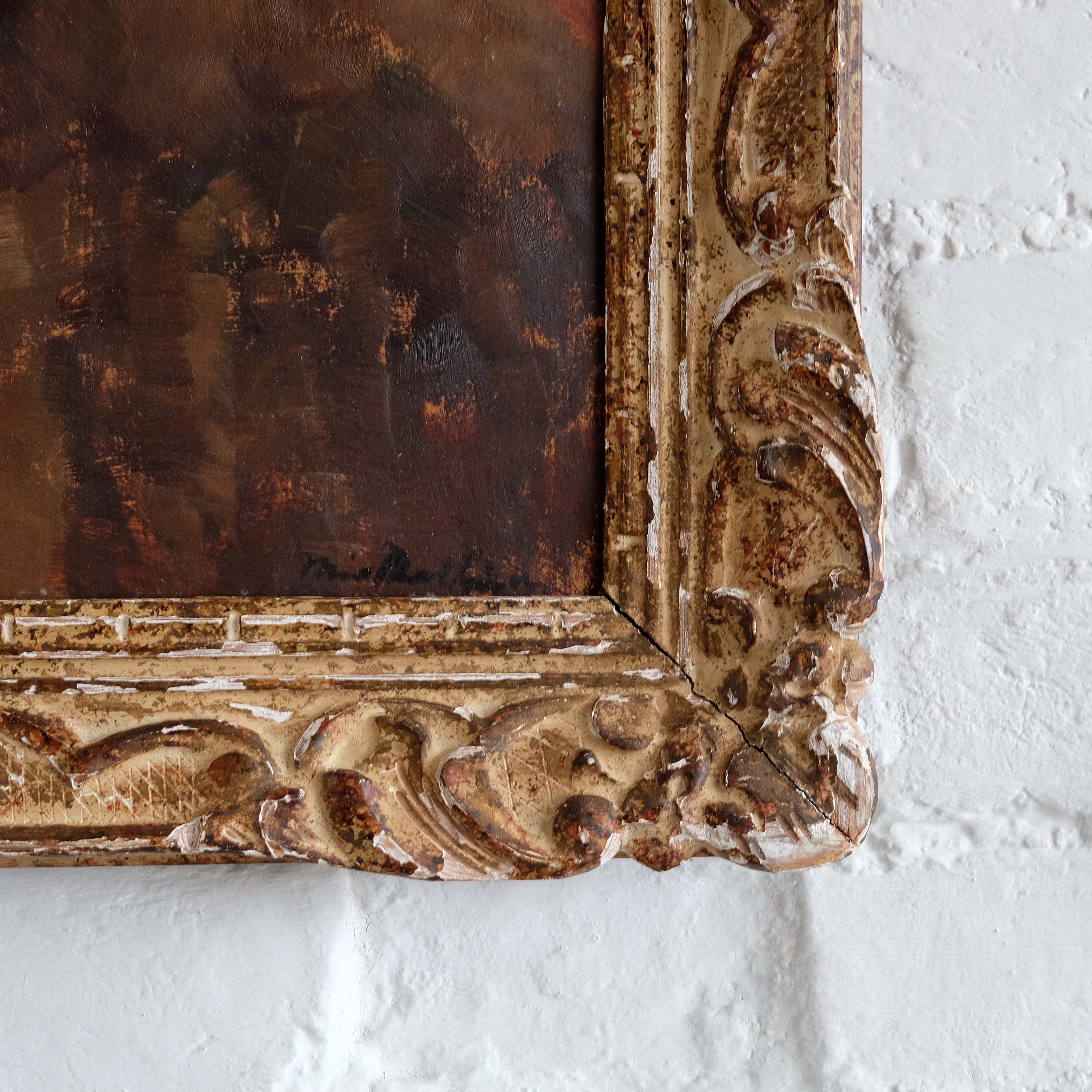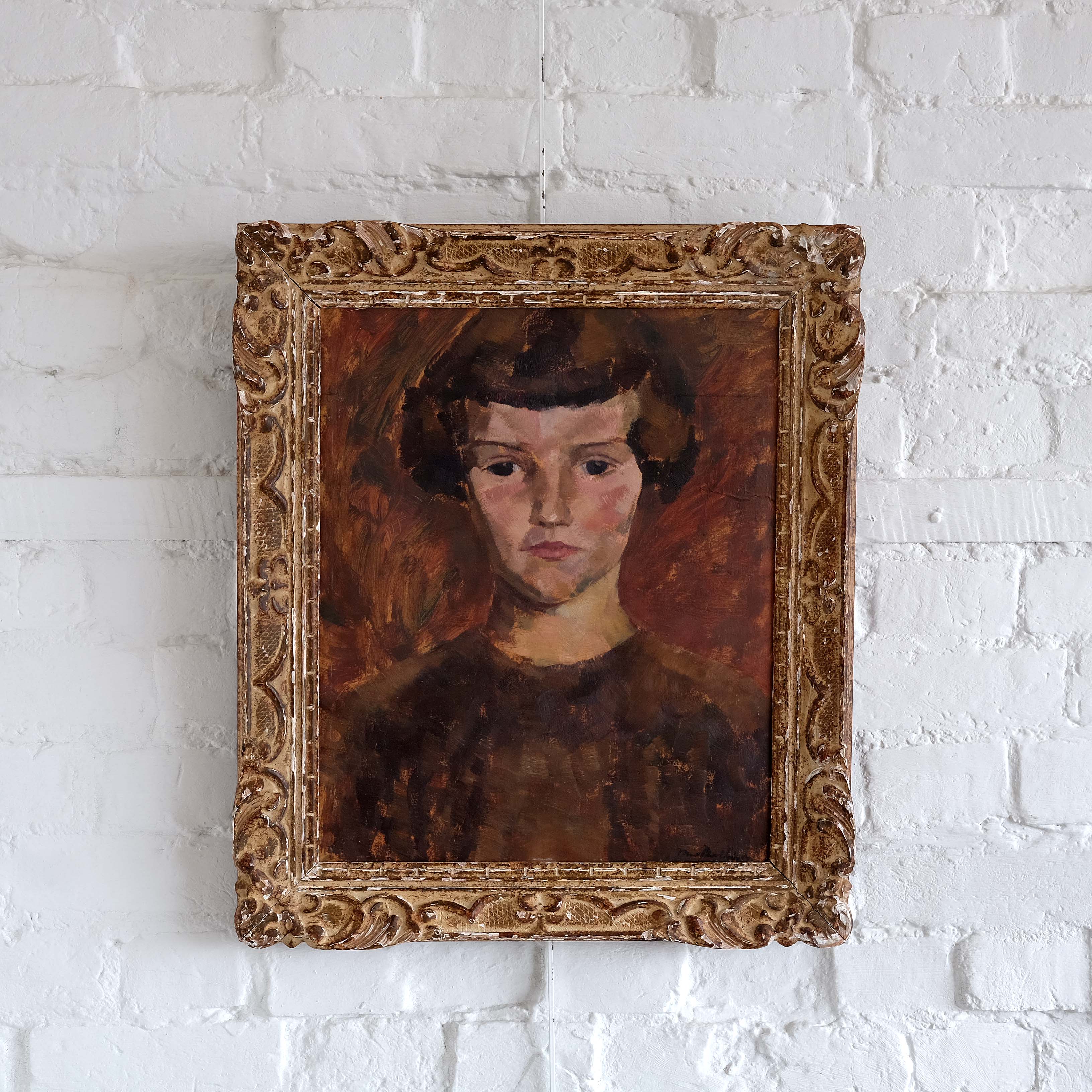 A striking early - mid 20th century French portrait of young lady, oil on card, paired with a French Montparnasse frame. Indecipherable signature bottom right but confidently executed in the modernist style.