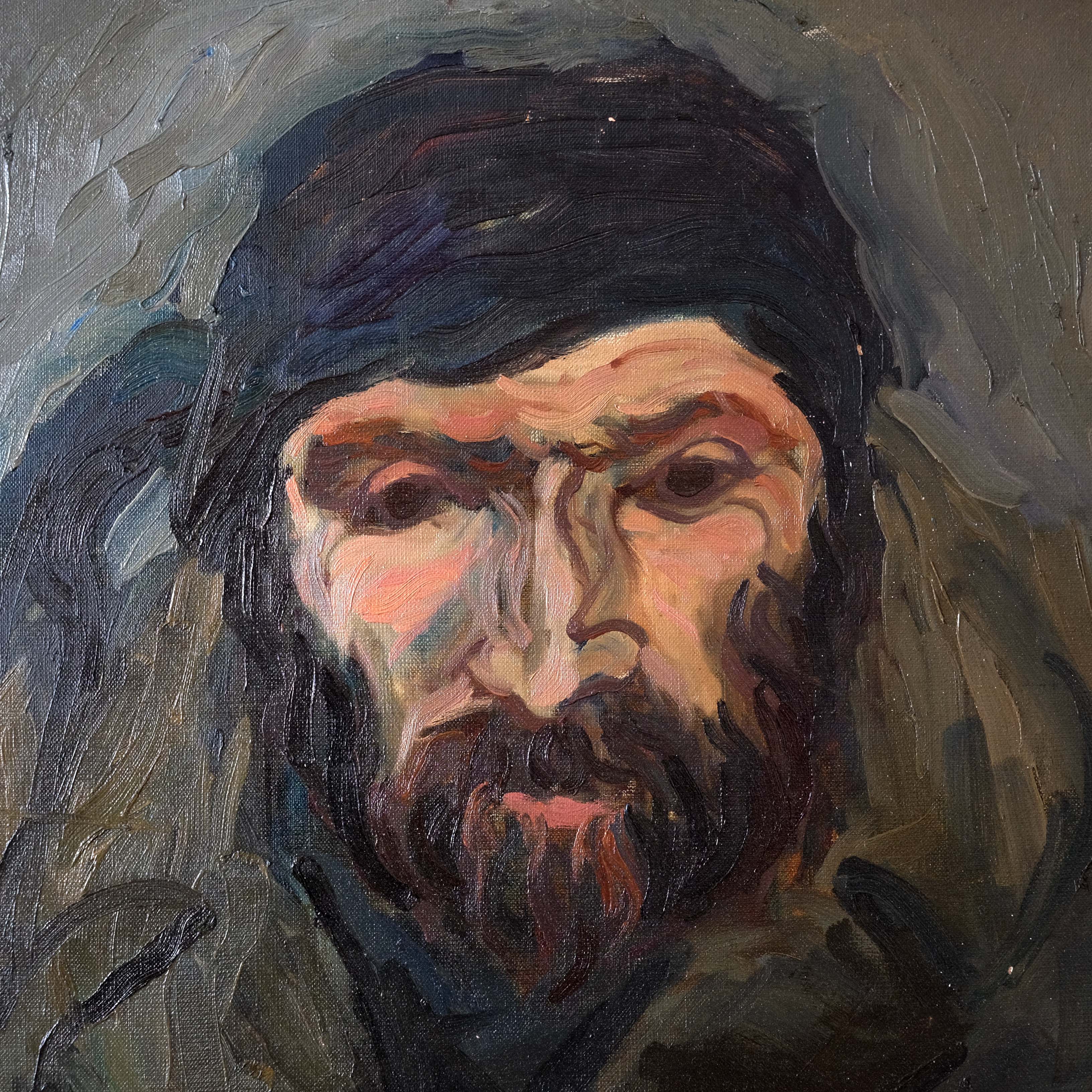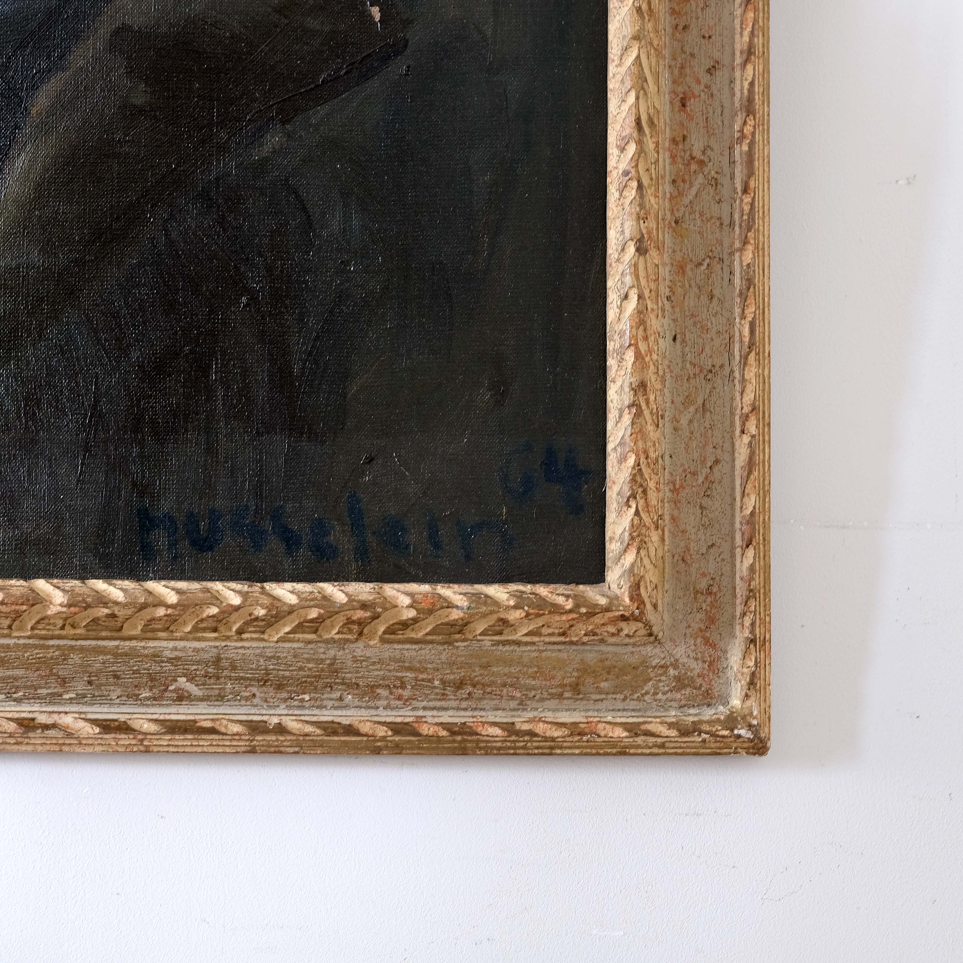 A striking and captivating portrait of a French working man, oil on canvas paired with a vintage French frame. Signed Musselain or Musselein and dated .64. The name originates from France so we think this work probably originated from Northern France.