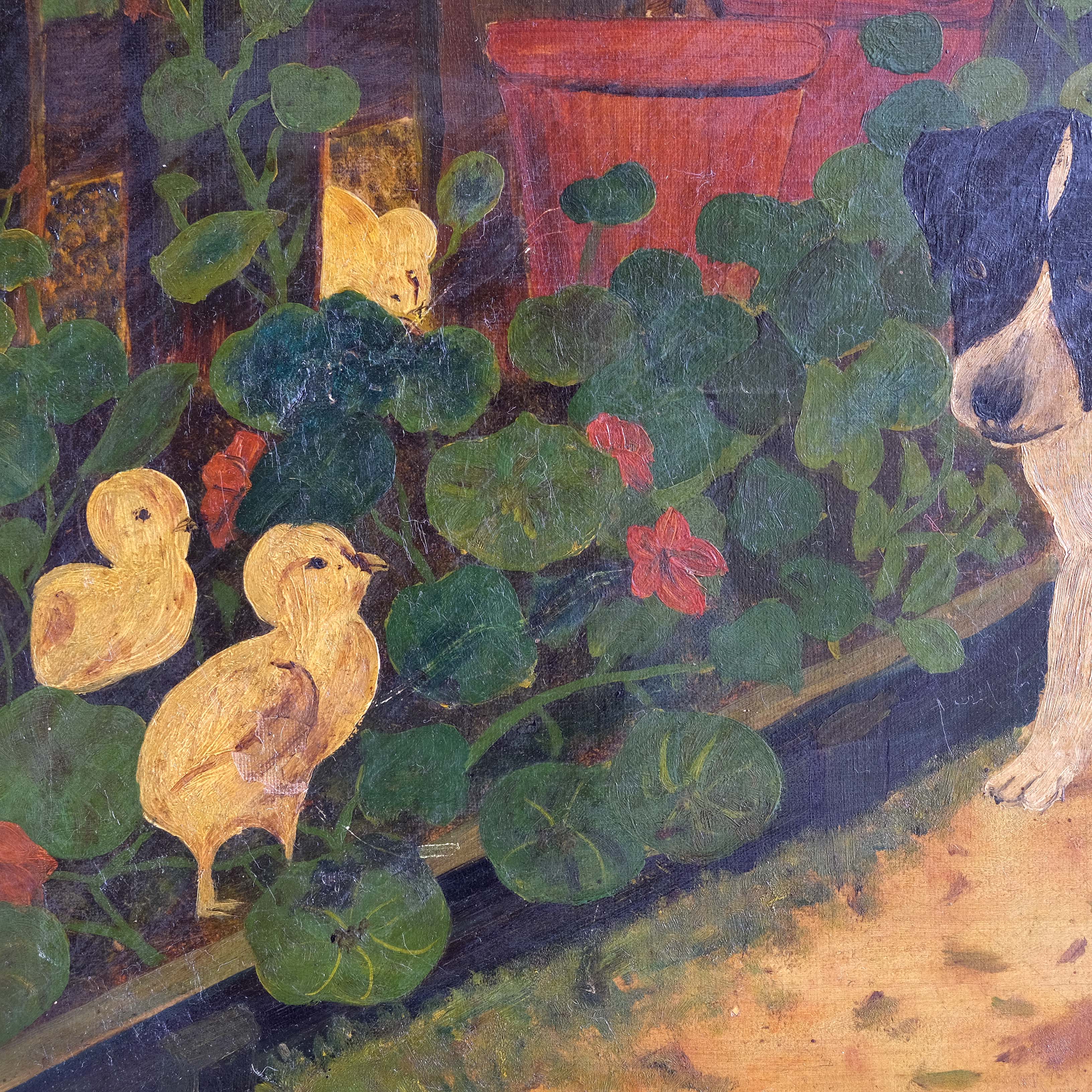 A very charming 19th century Folk Art painting depicting a terrier puppy playing with ducklings that appear to have entered the garden through gaps in the fence! Oil on canvas in the original frame. Initialled C.P.S. Naive execution that adds to the charm. Minor paint loss that has been touched in.