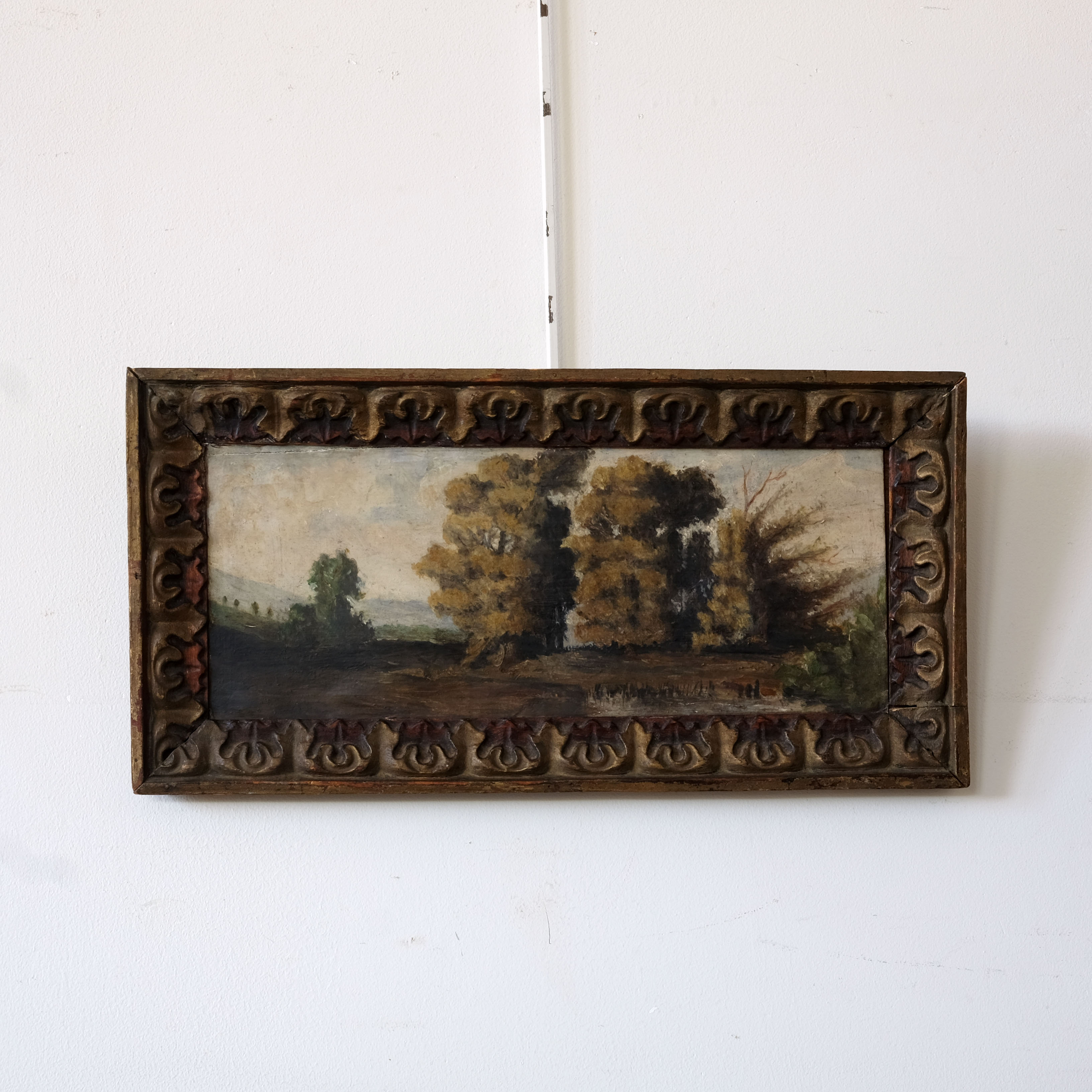 A very charming 19th century French landscape depicting a woodland scene, oil on board, in a lovely antique Folk Art frame.