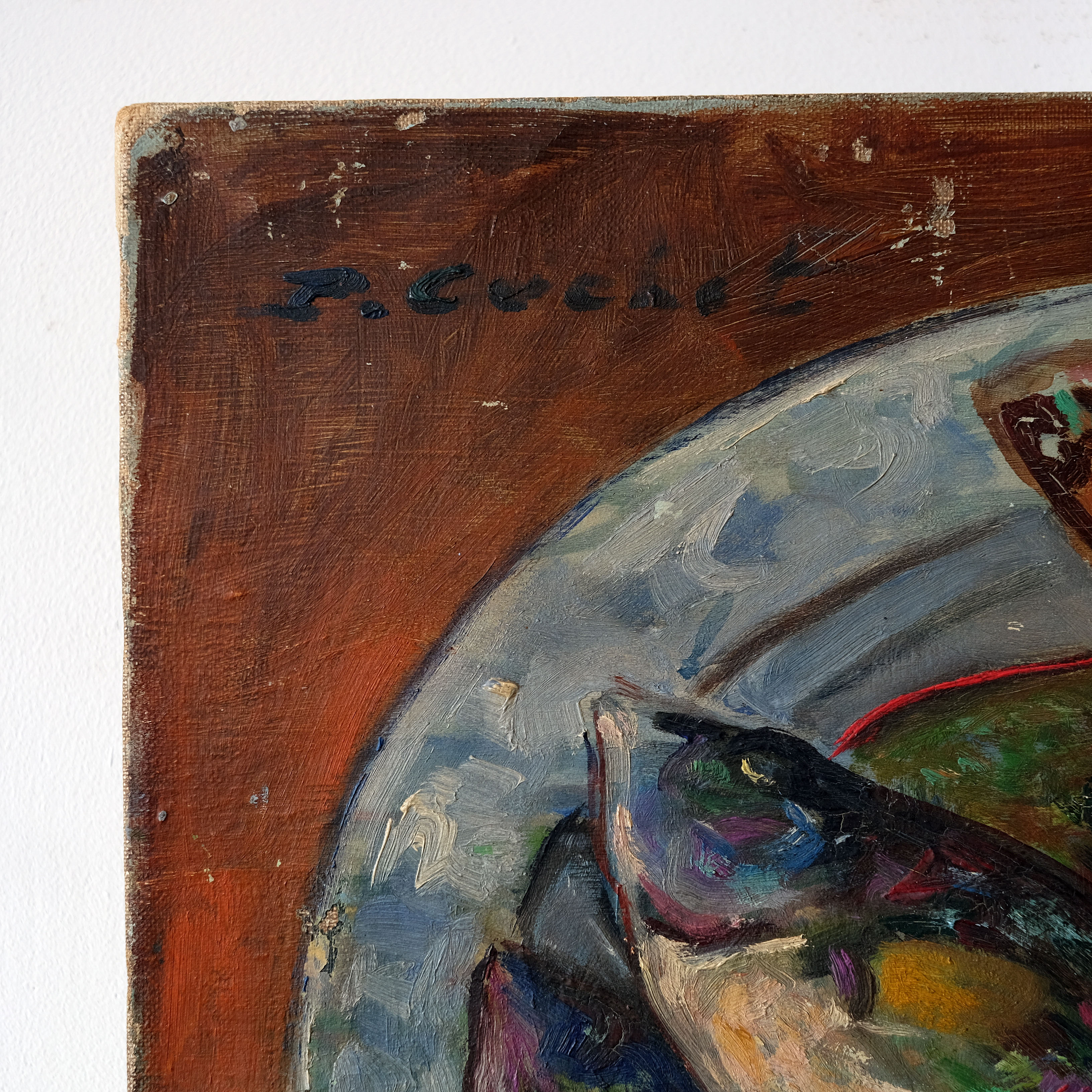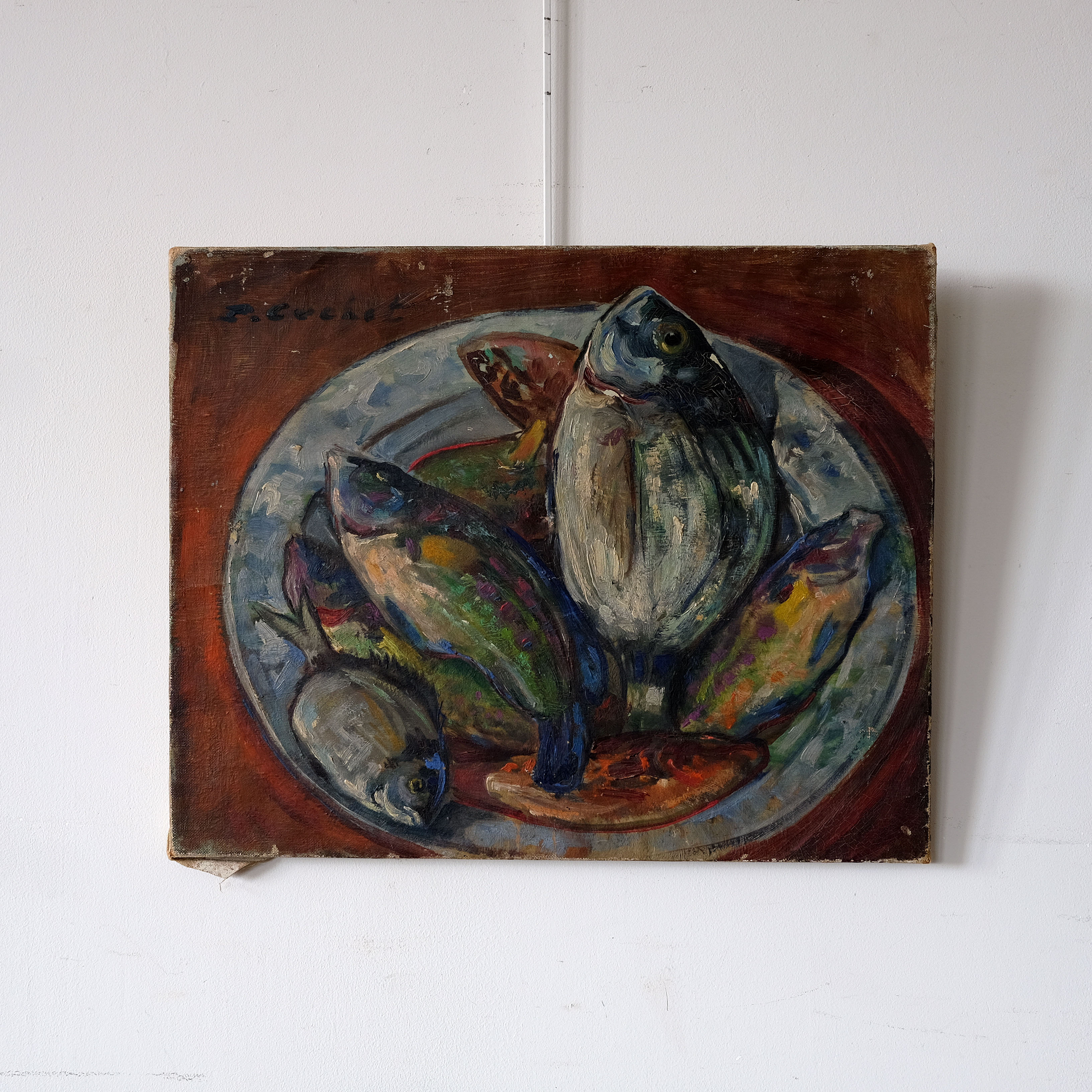 A striking early - mid 20th century still life artwork, oil on canvas, depicting a platter of fish. Well executed with a vibrant palette. Signed 'P. Cuchet' - Paul Cuchet 1895-1986. A few minor flecks of paint missing but this does not detract from the piece.