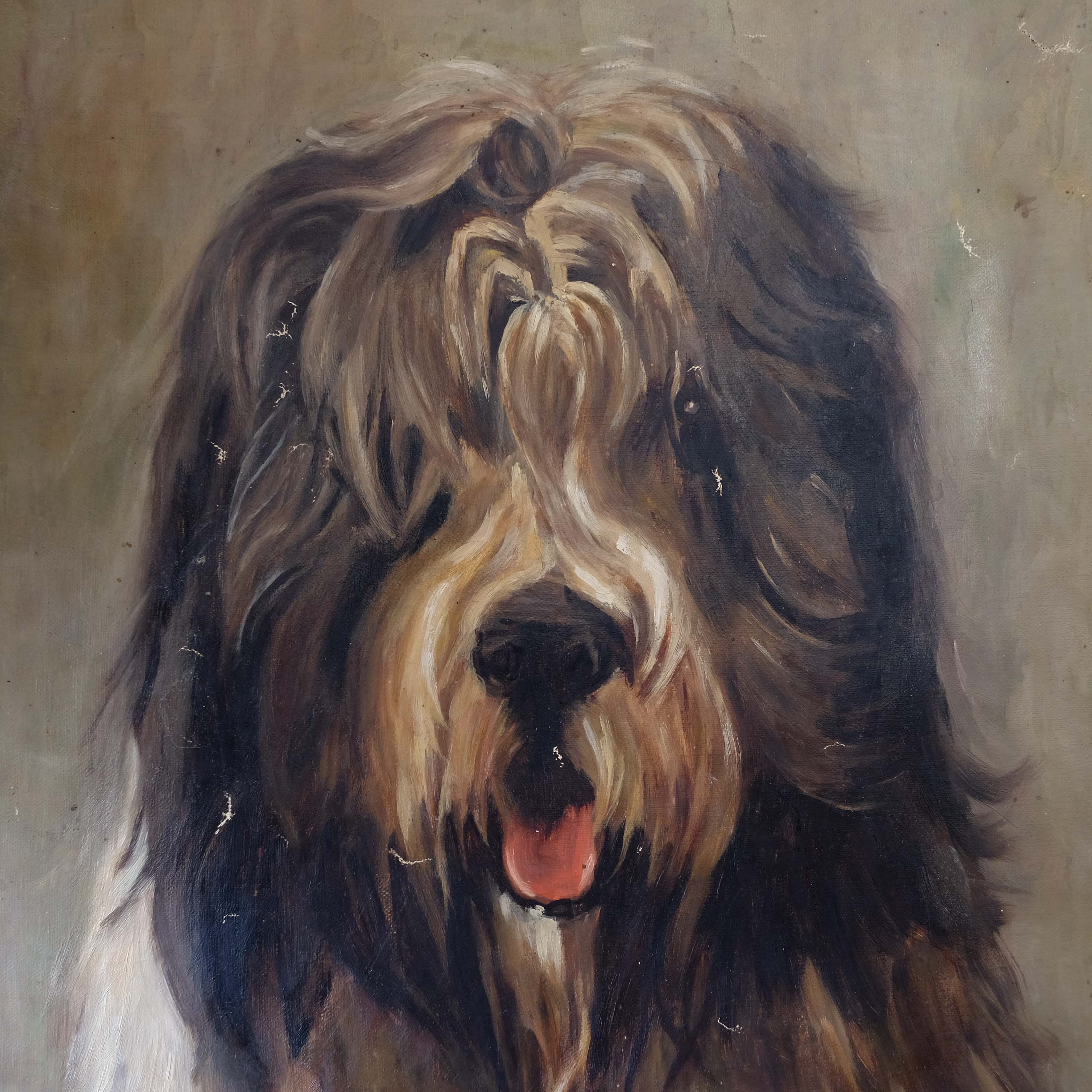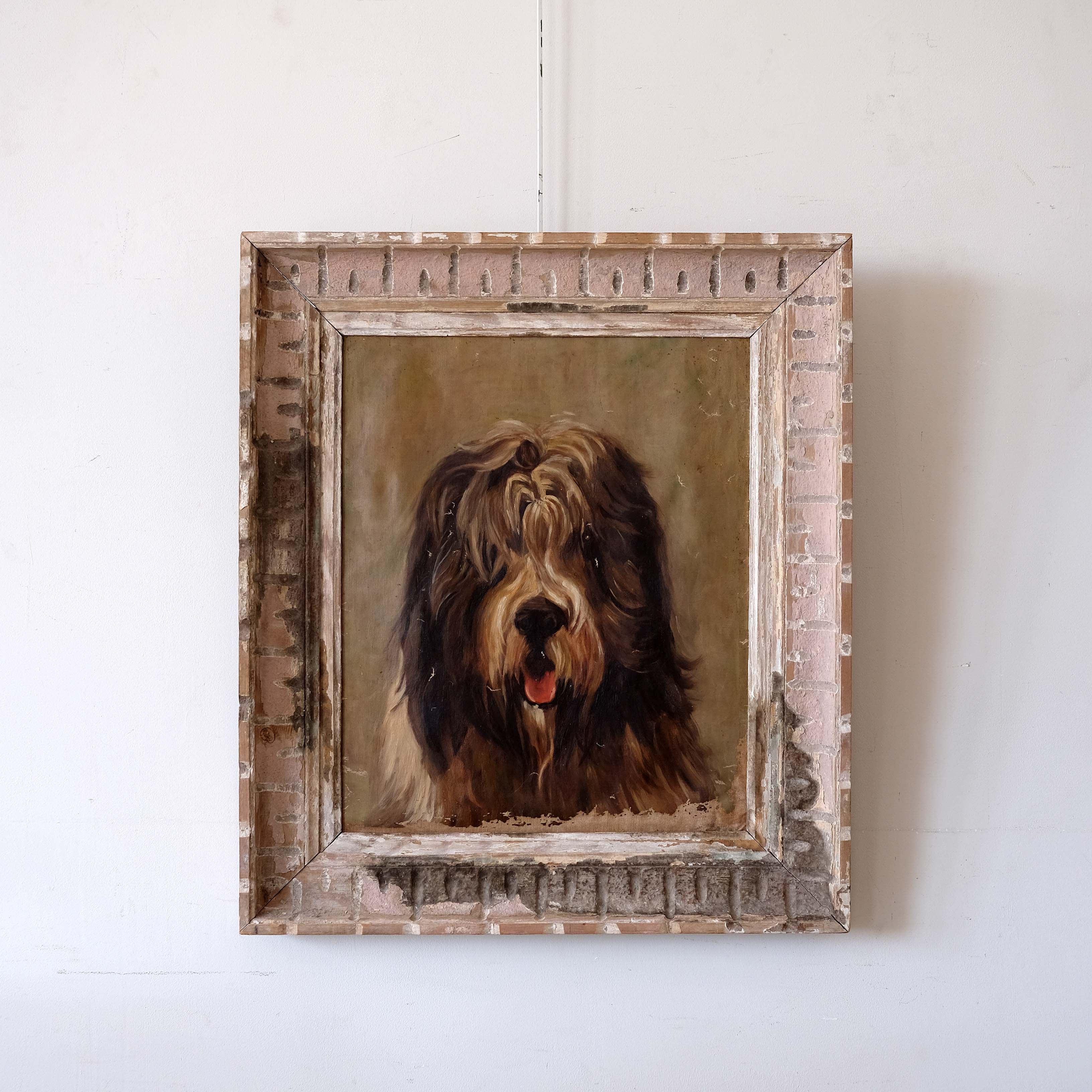 Wonderful study of a Bearded Collie or similar breed, happy to be corrected on this! Oil on canvas mounted on board and paired with a hand carved antique French frame. Some paint loss around the edges but otherwise the canvas is in good condition.