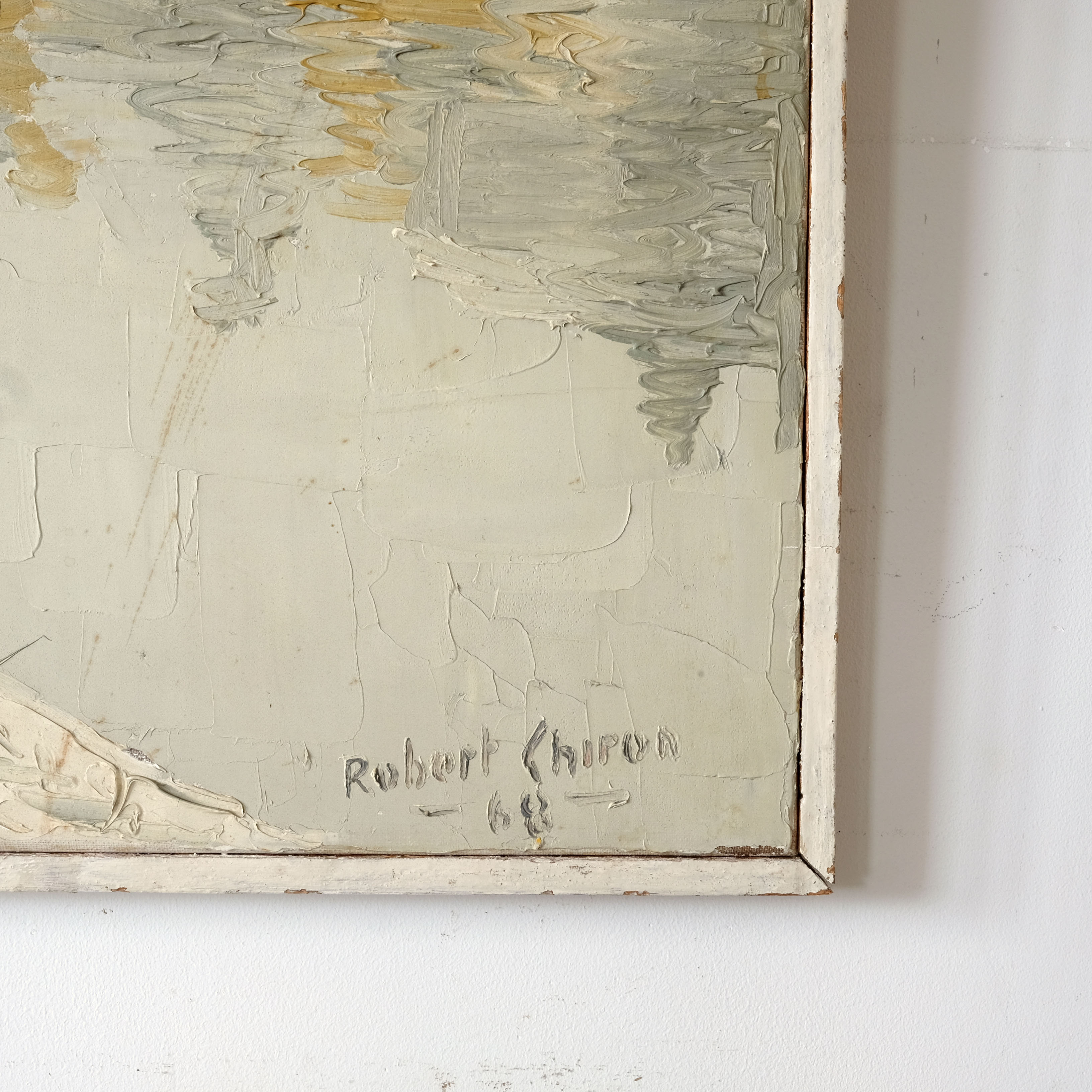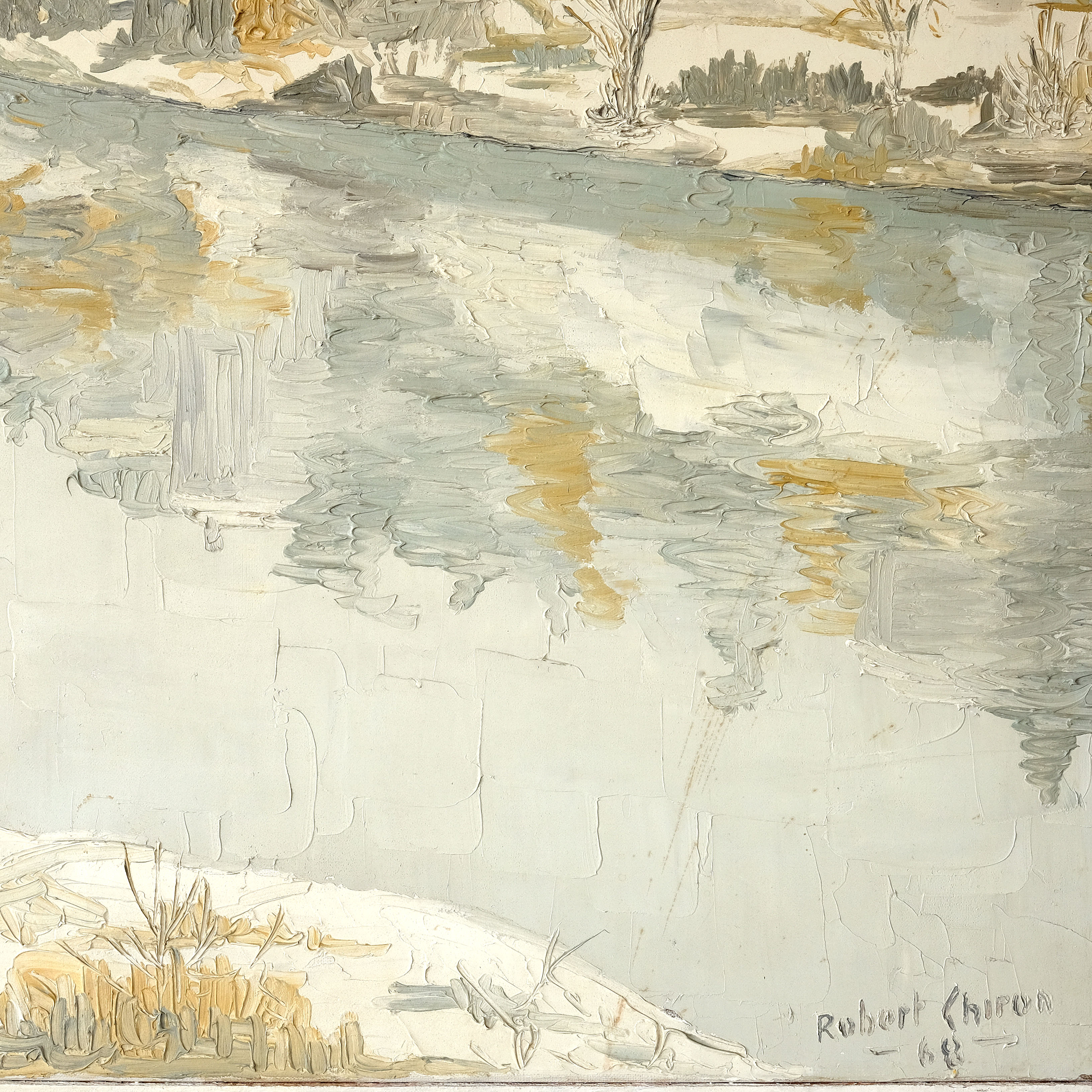 A very calming French wintery river landscape, French, oil on canvas, in the original artist's tacked on frame, signed Robert Chipon and dated .68. Executed in a lovely muted palette.