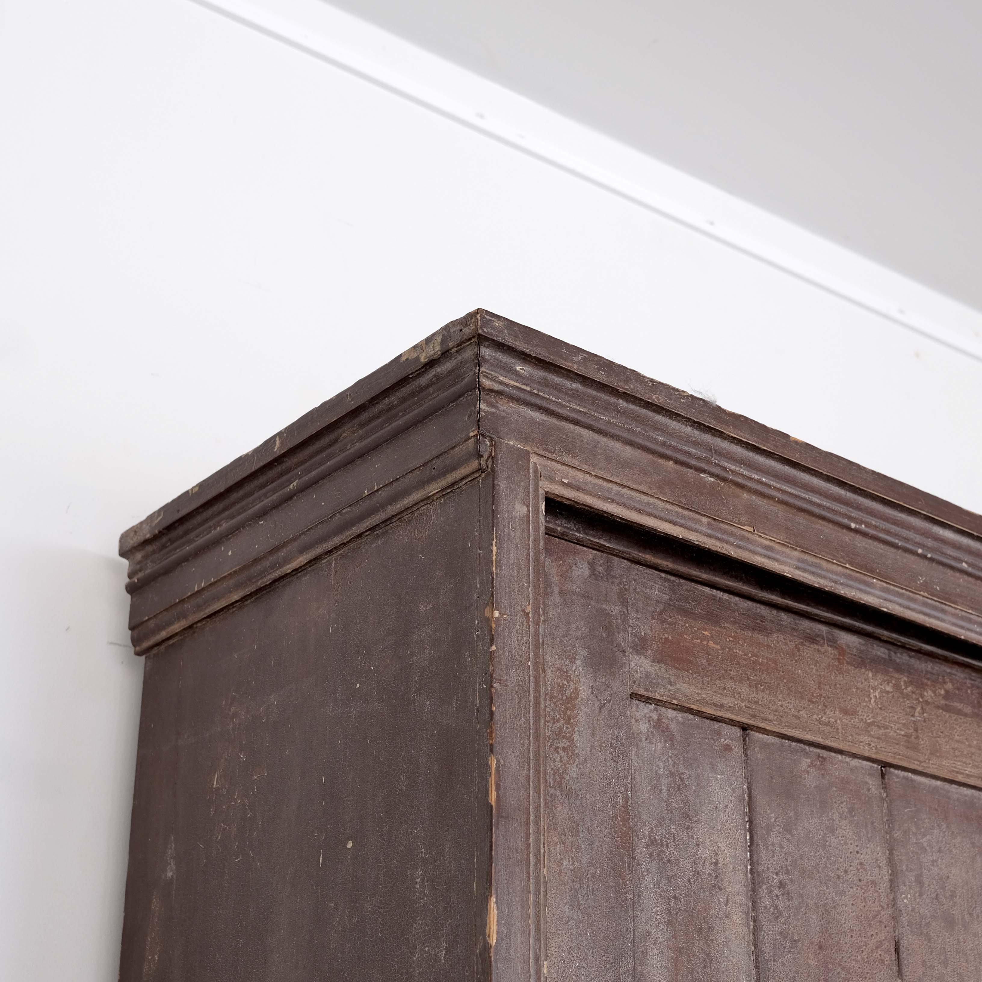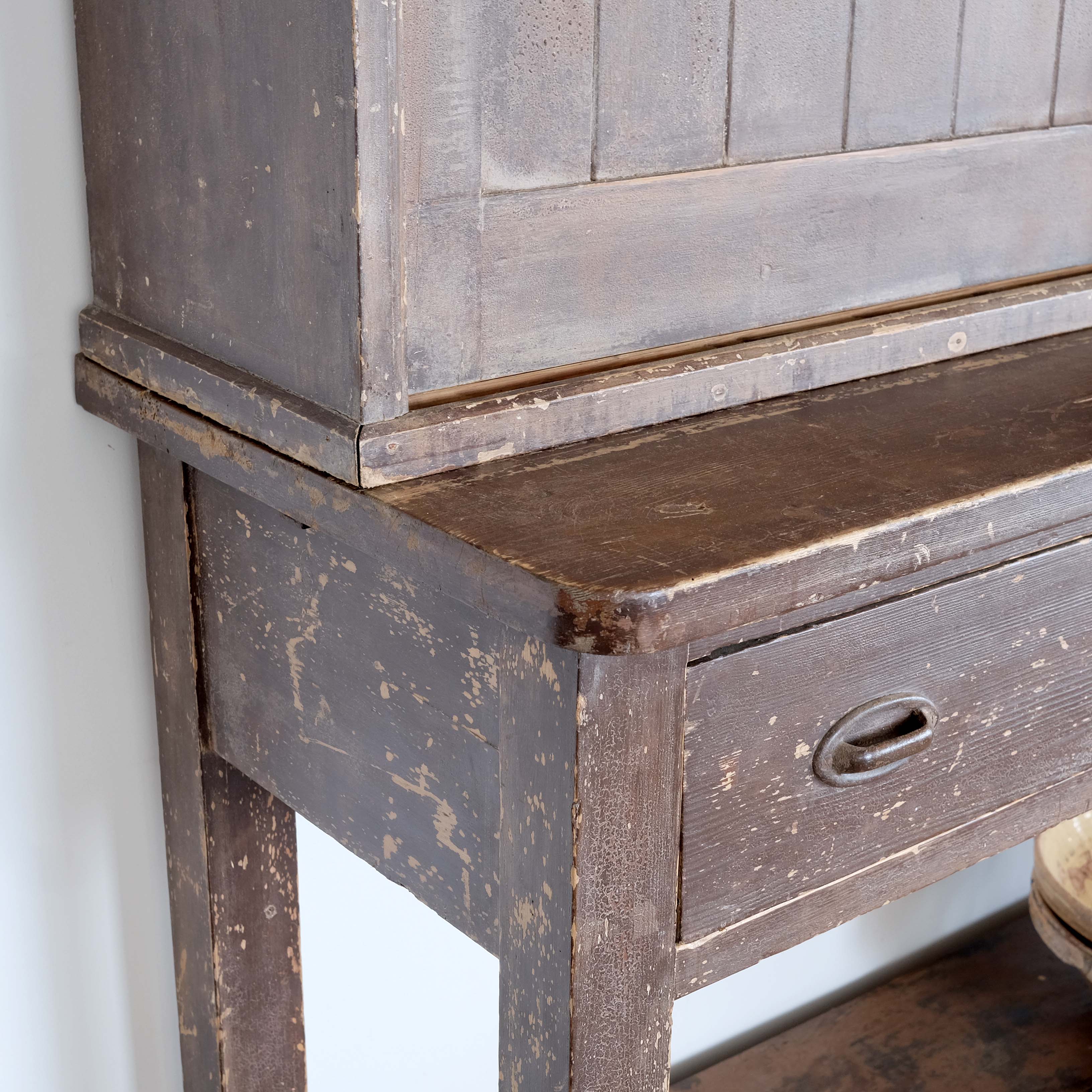 Mid 19th century English country house larder/ dresser constructed in pine in the form of a cupboard with sliding doors over a dresser base. We do not think that the top is original to the base but they have been paired together for over 100 years. The old/ original paint and surface match exactly so they probably came from the same country house or estate and then later paired together. Either way this is a great looking and useful piece.