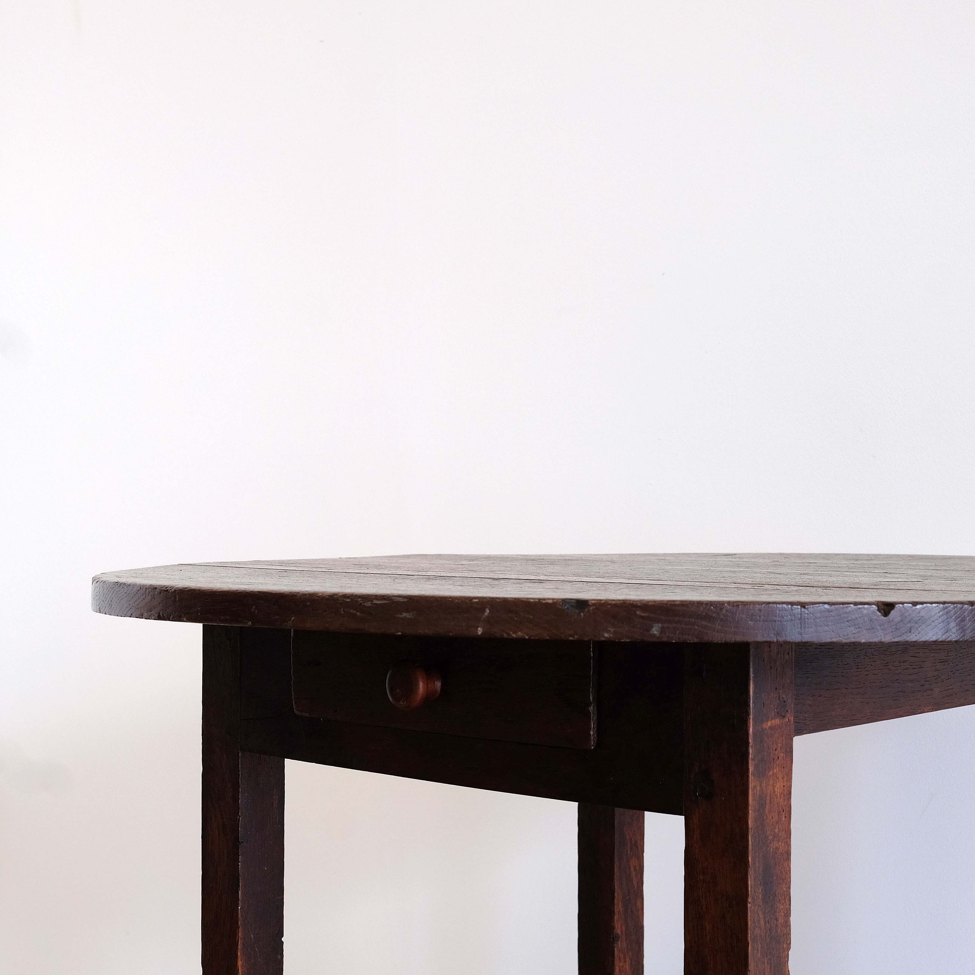 An early 19th century English country side table in oak. A characterful piece with lovely signs of age and a cute little drawer. Simple pleasing form and lovely colour.