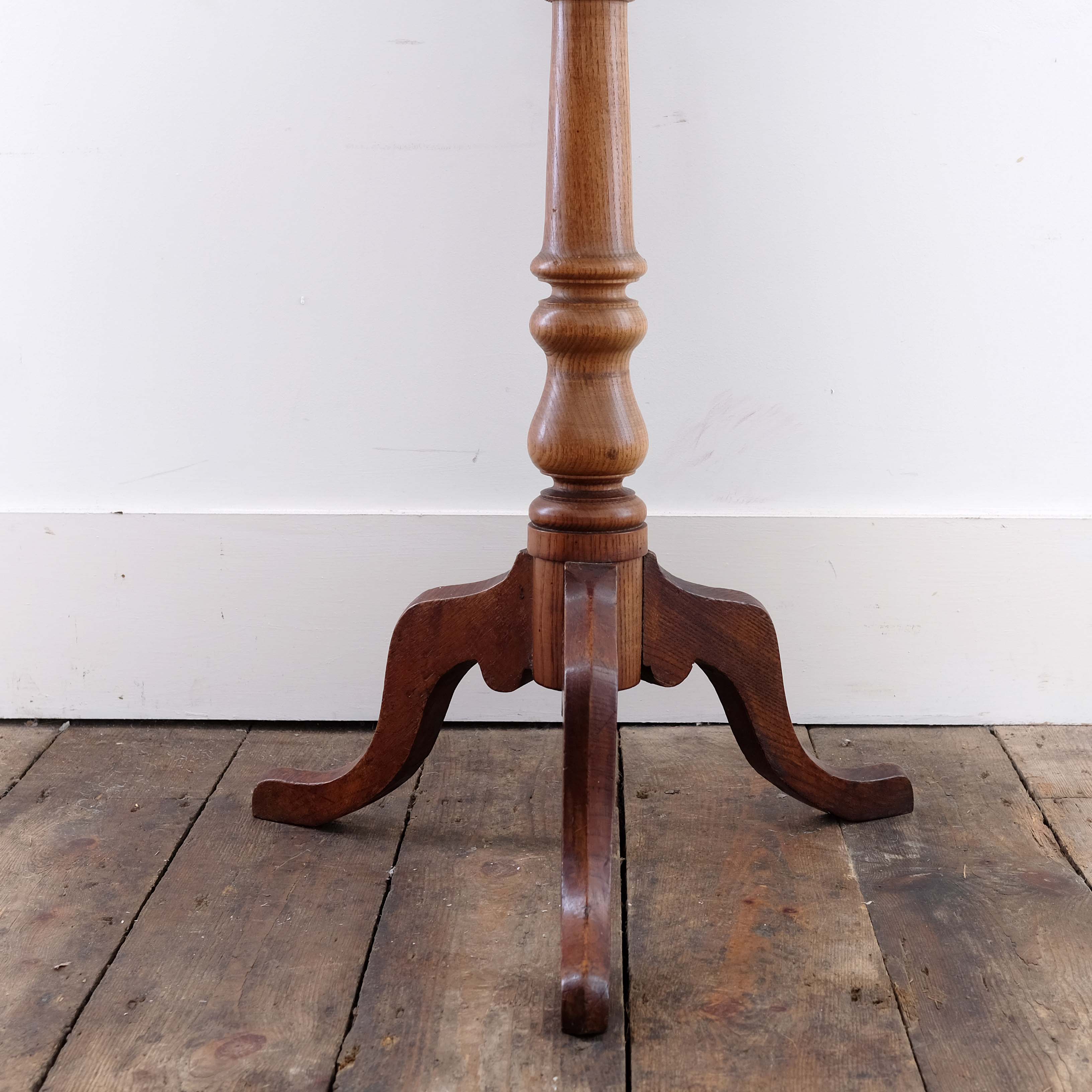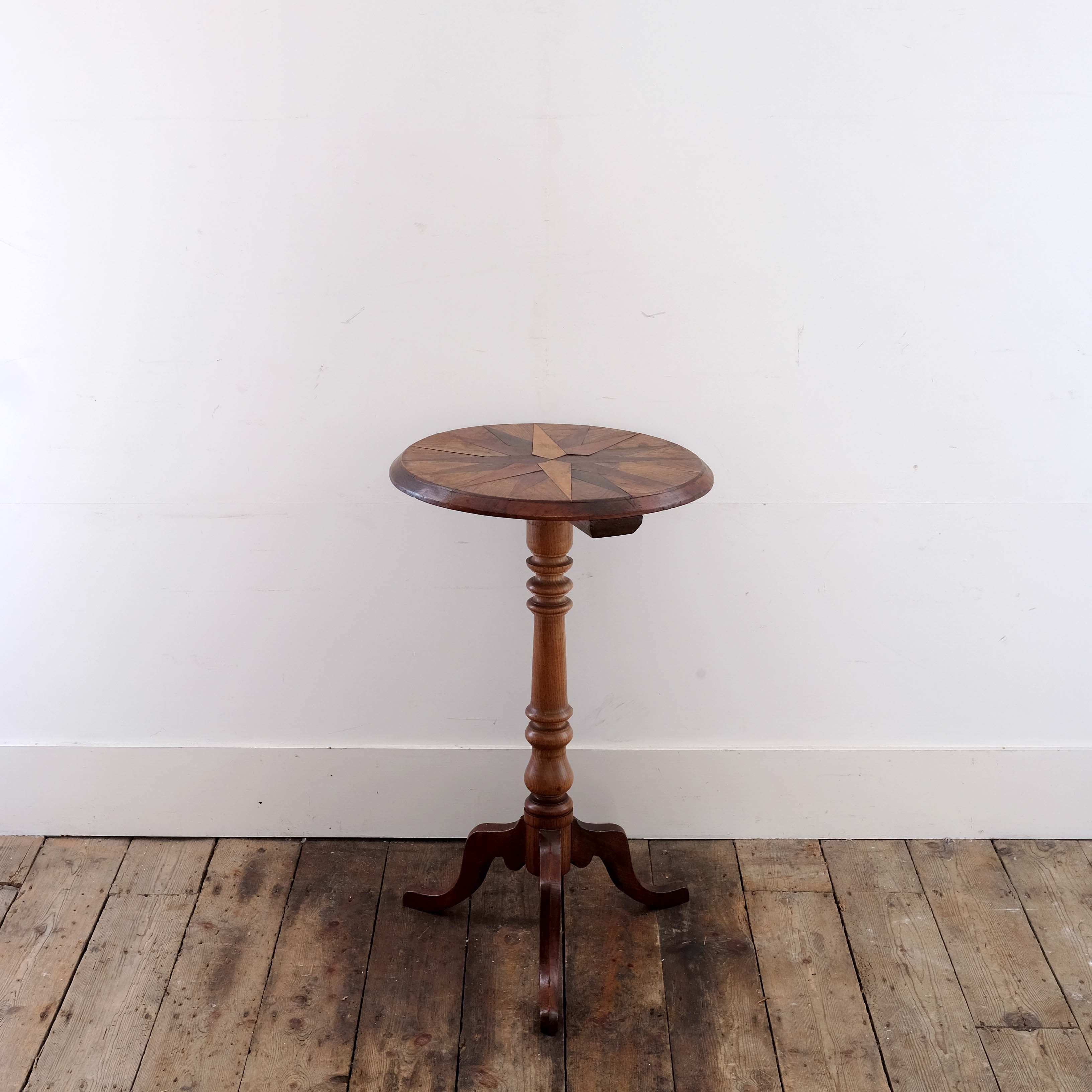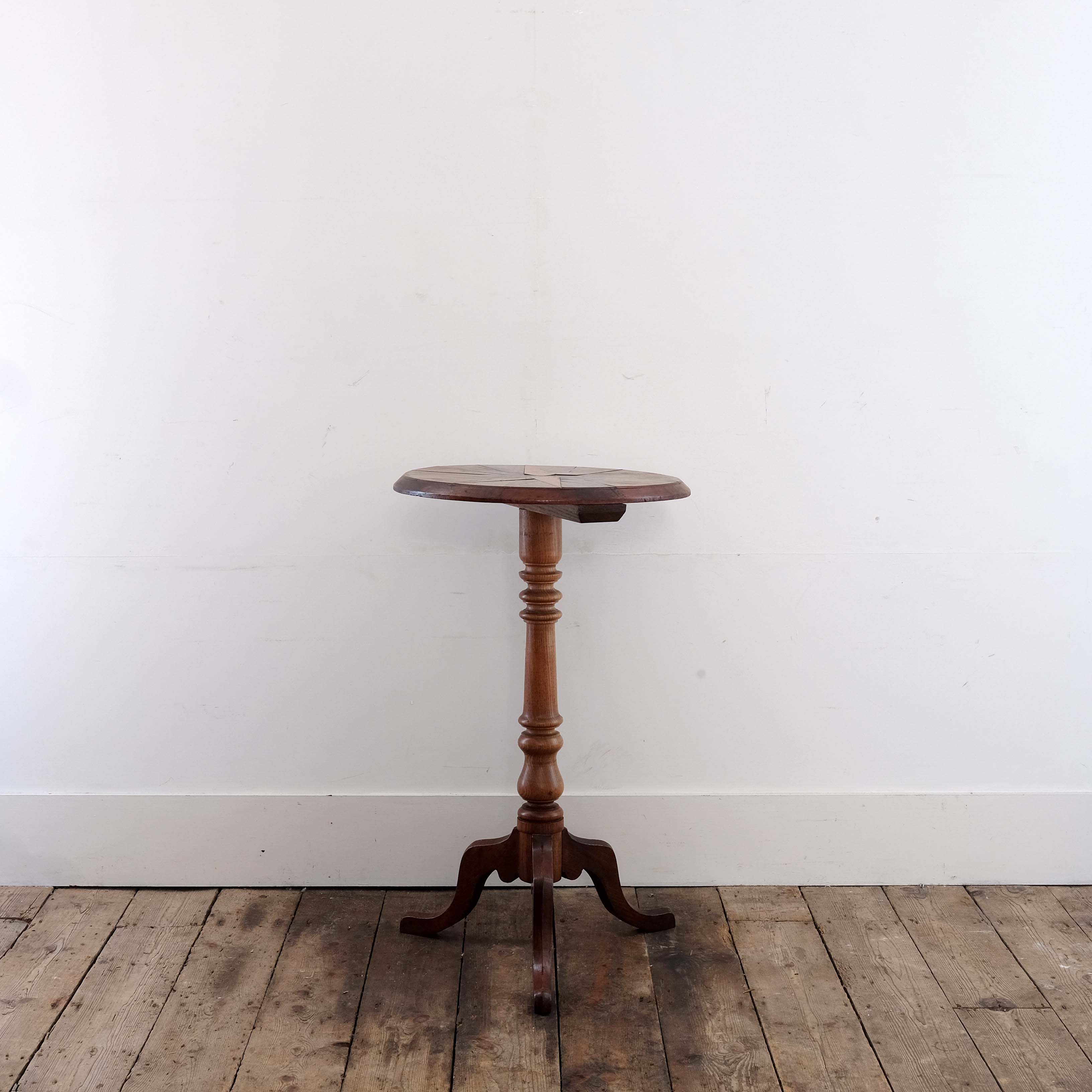 An early 19th century English specimen top side table. The top is veneered in a star motif with oak, elm, pear, mahogany and rose wood. Supported on a pedestal base turned in elm.