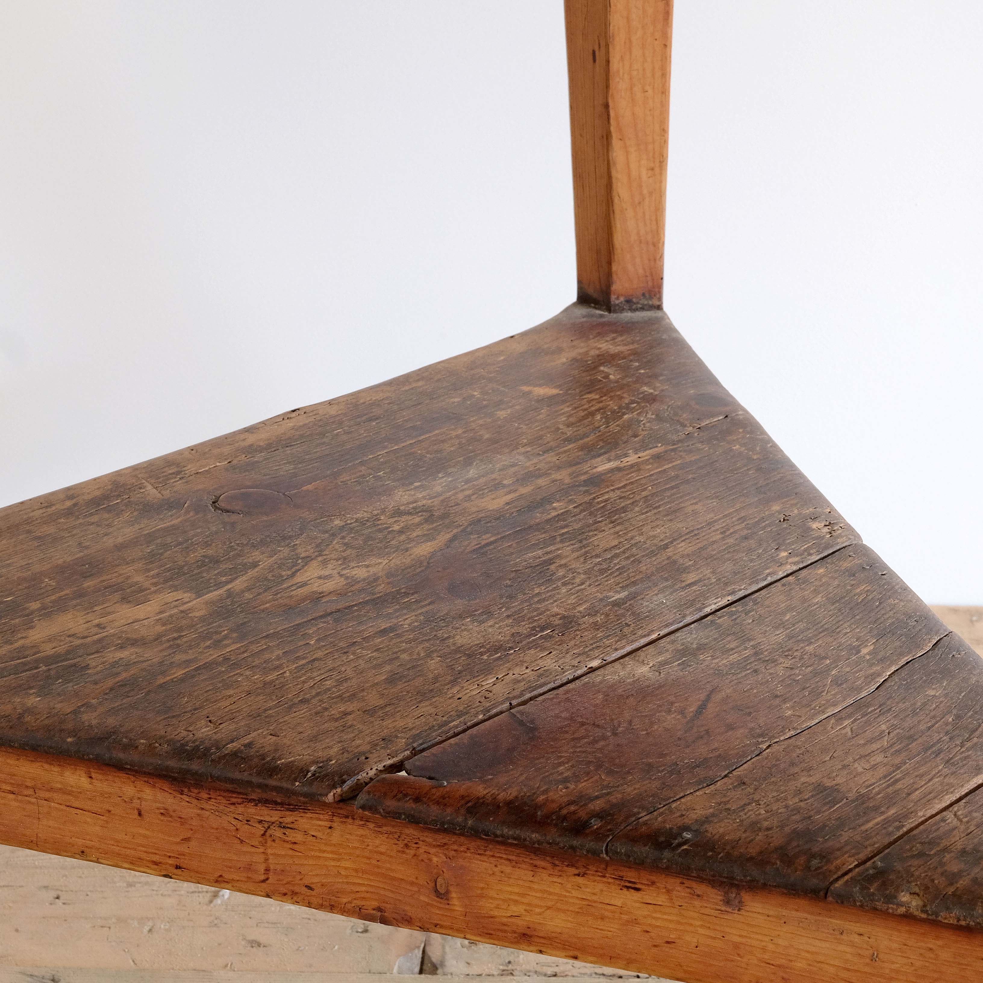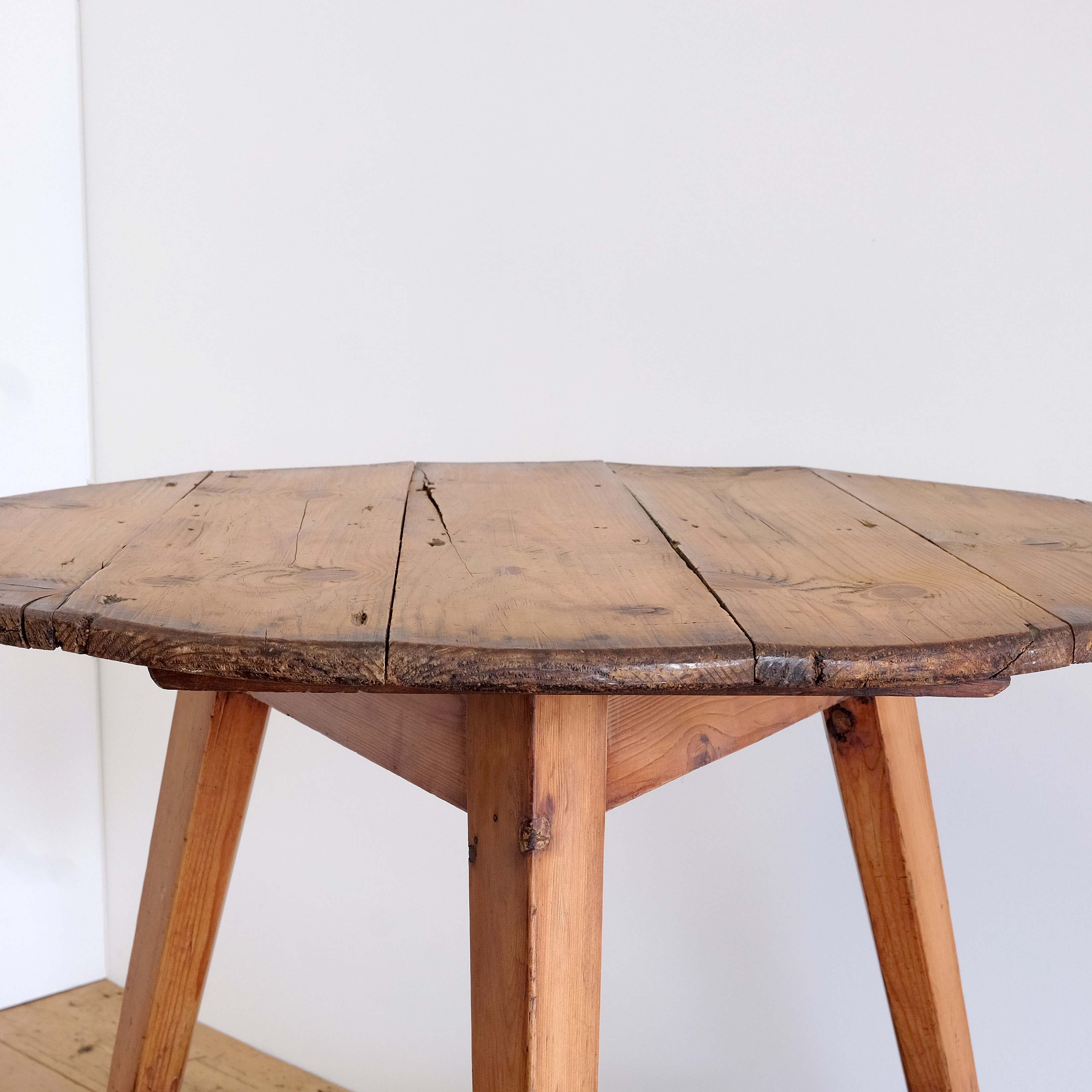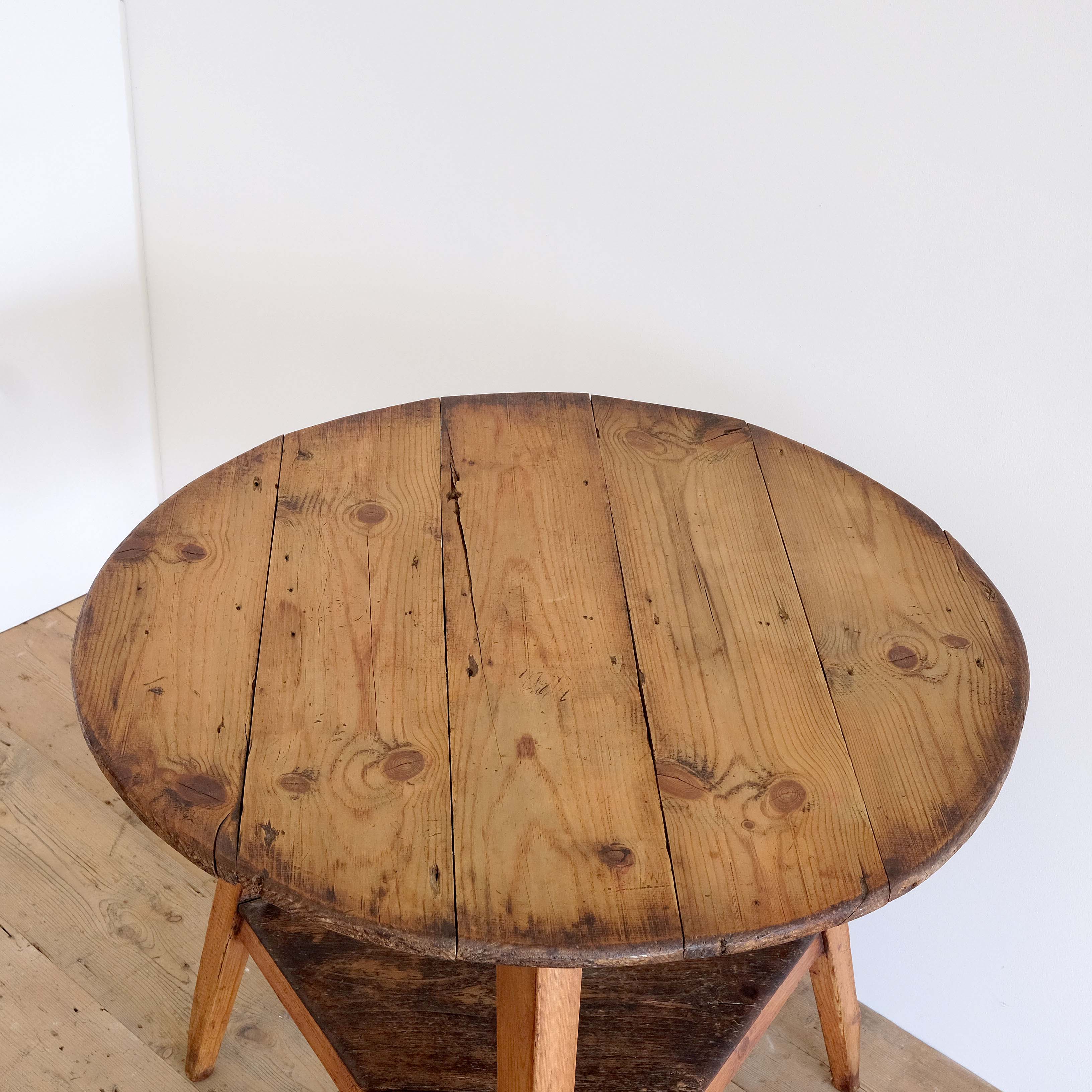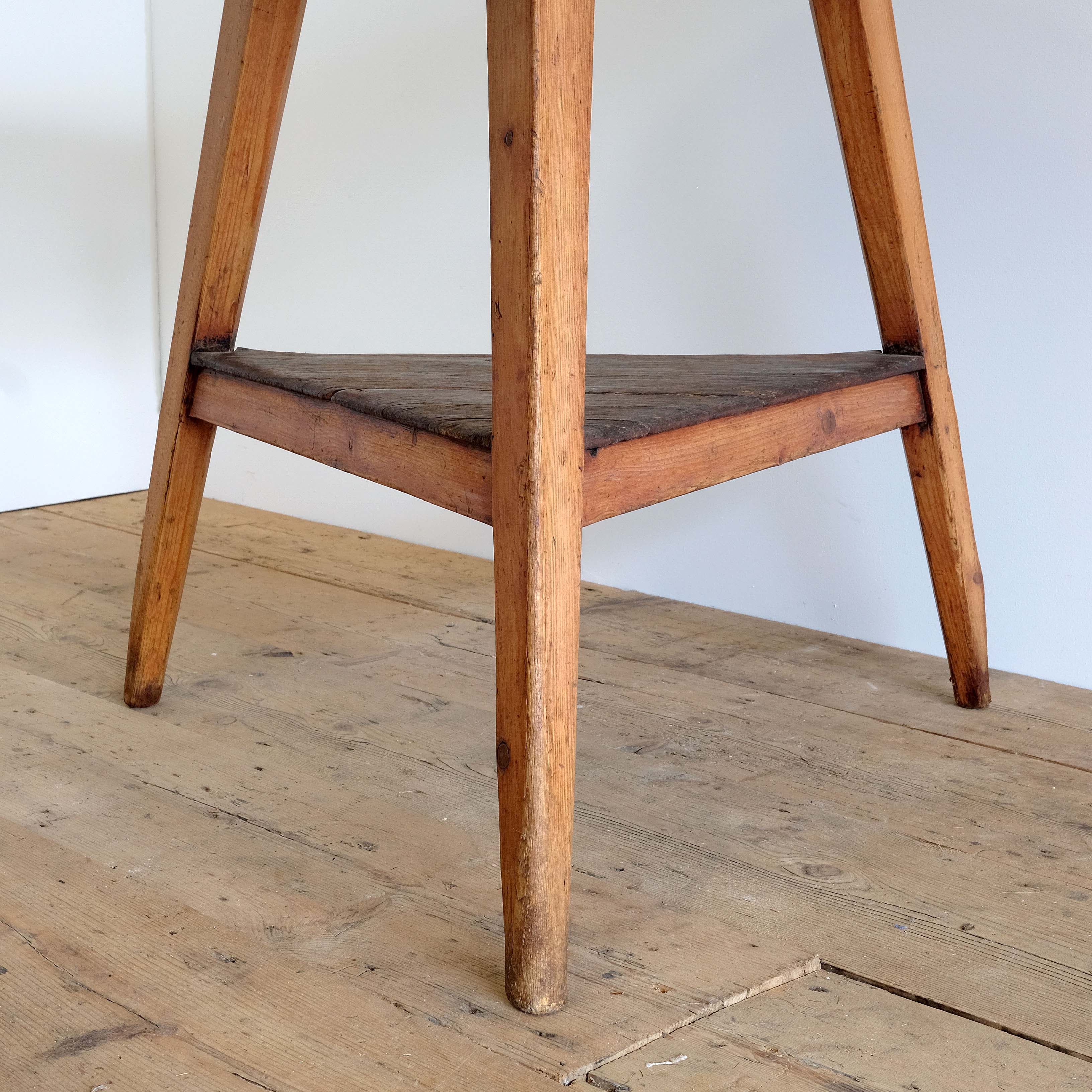 An early 19th century English tavern cricket table in pine. Great form and colour. Lovely historic patination to the shelf. The top has been scrubbed back some time ago but now shows some signs of wear and character. Timeless classic design.