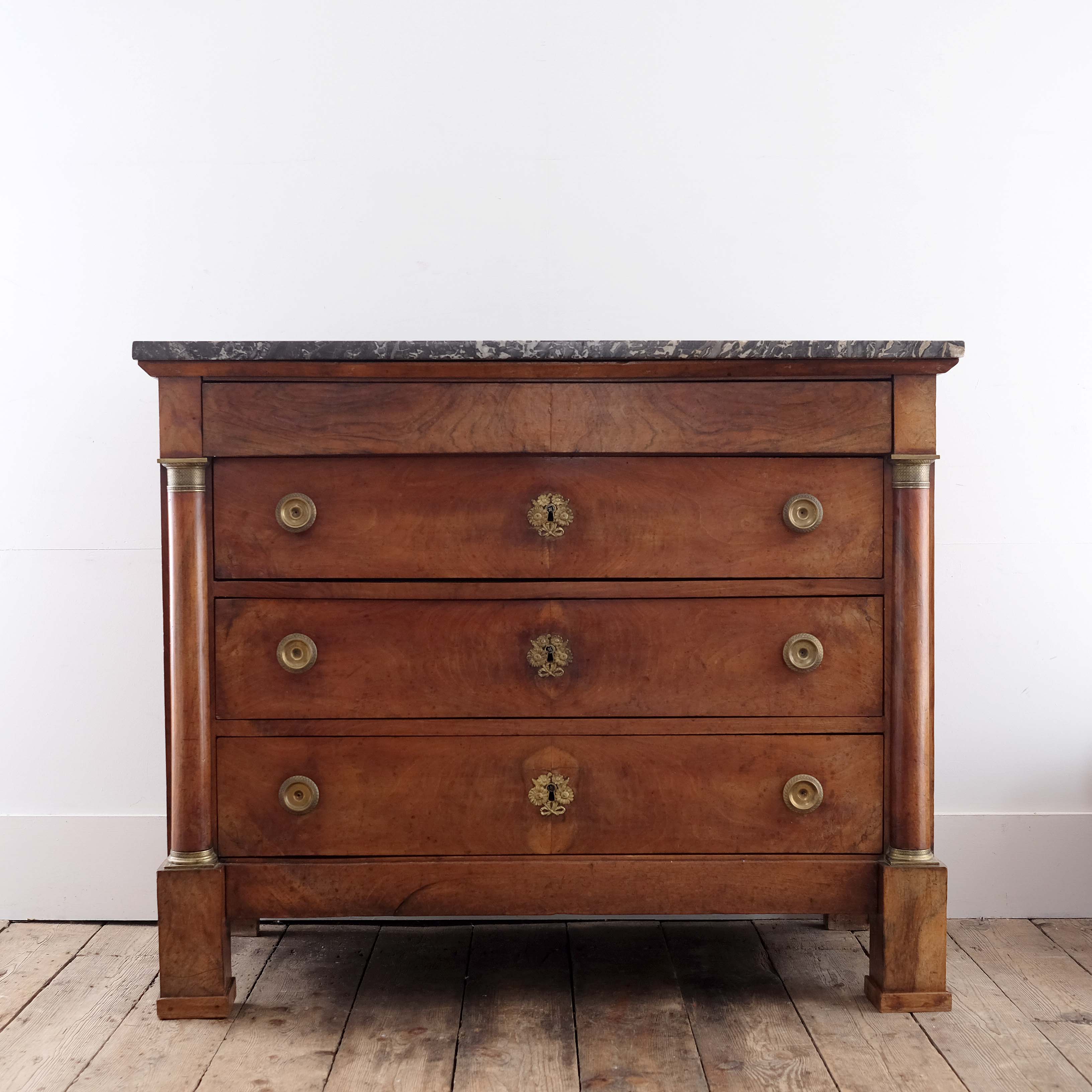 A very smart Empire period French marble top commode, circa 1810. Pine carcass with lovely burr walnut veneers and a fabulous original marble top. Good quality brass hardware and neo classical details. Great form and useful 'not too large' size.