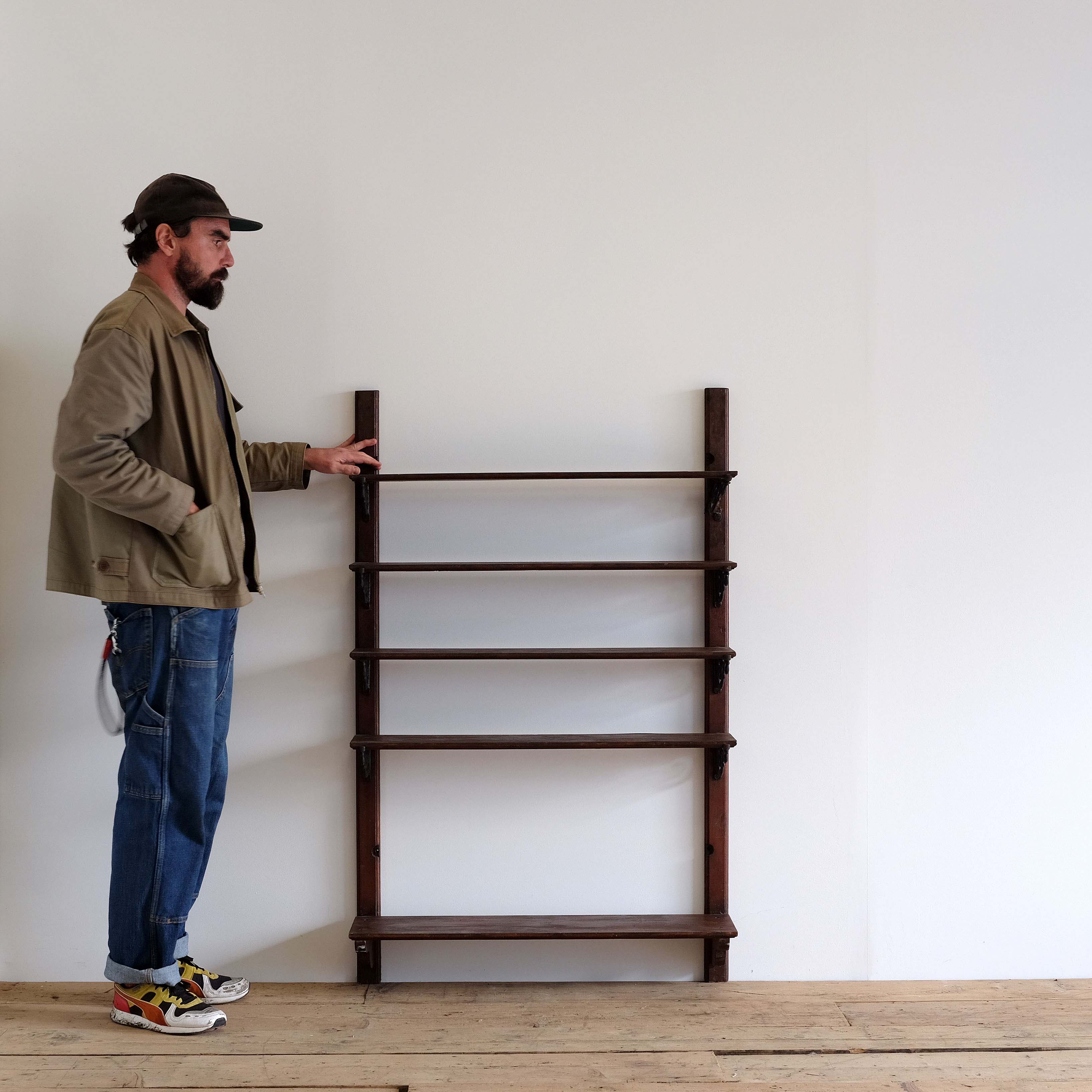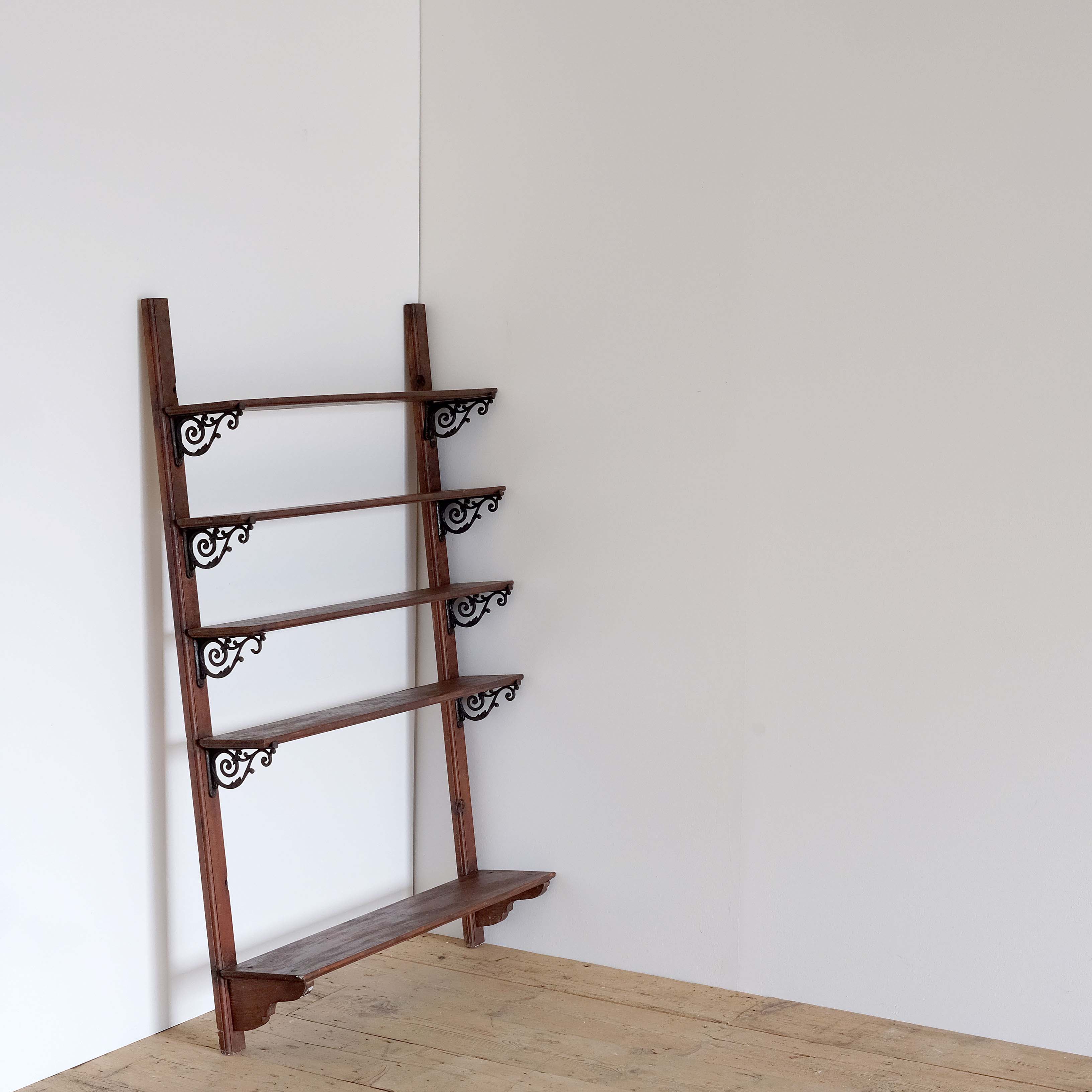 Late 19th century French bistro shelves in pine with remnants of the original patina. Lovely decorative wrought iron shelf supports. Simple, elegant, useful piece.