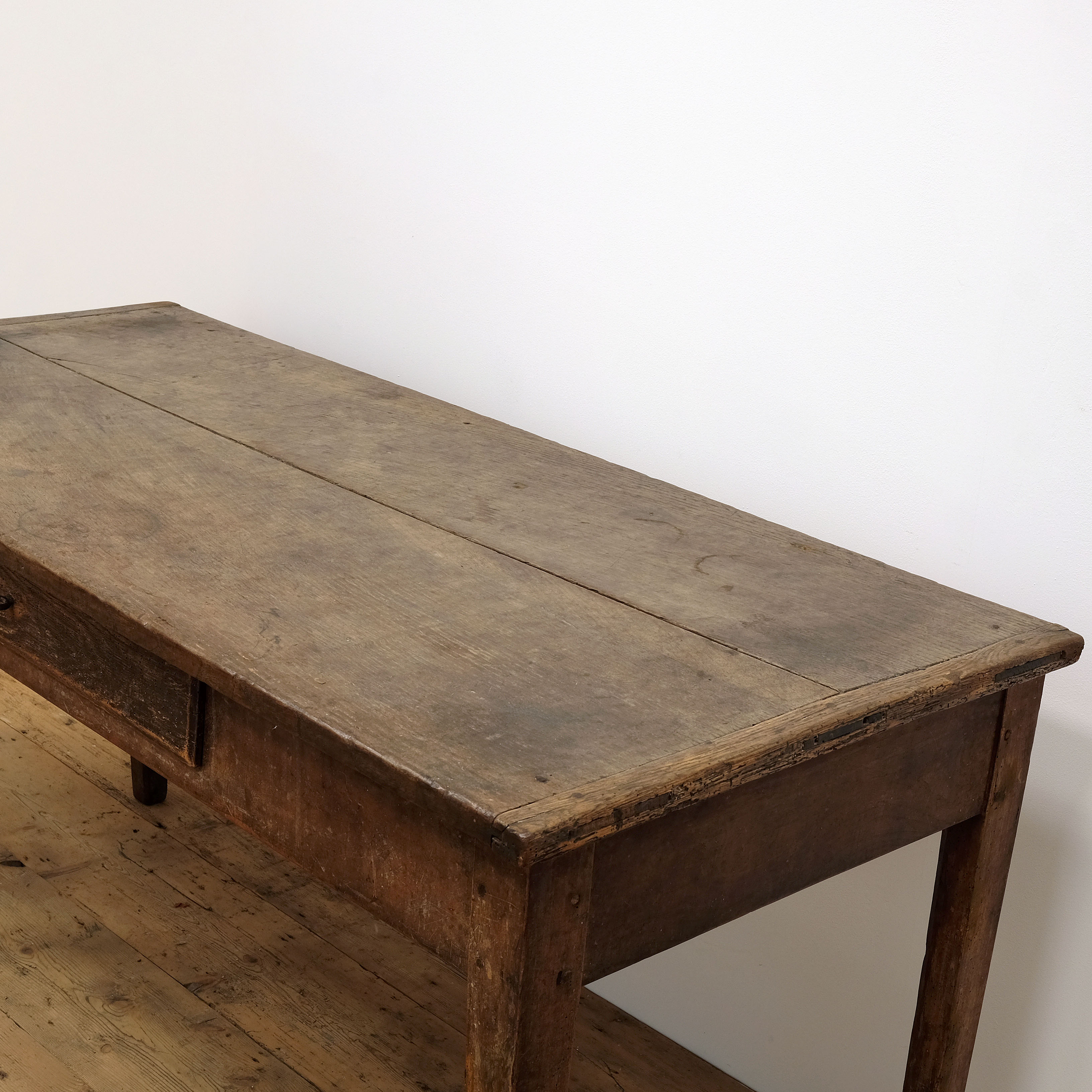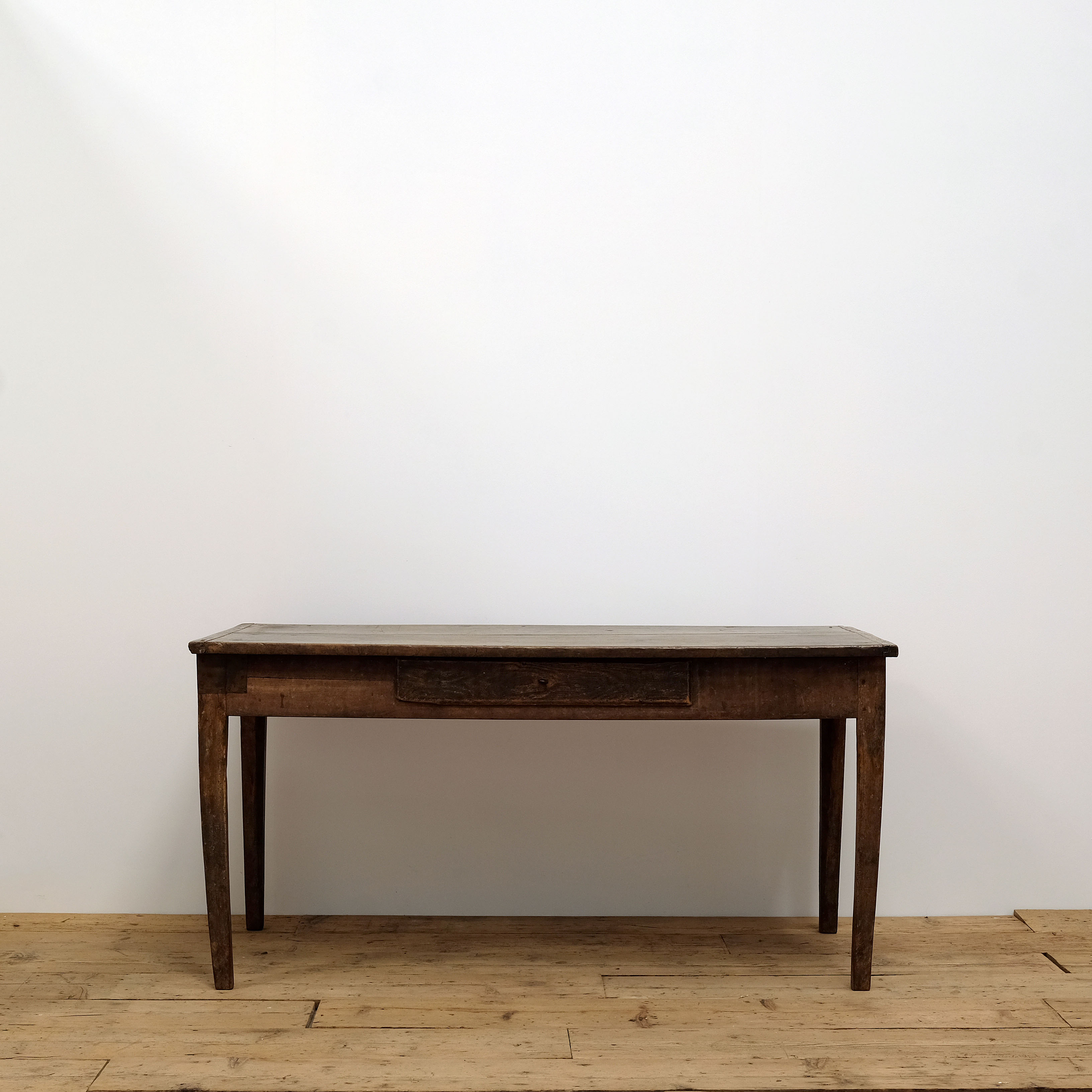 A very charming French 19th century country table in walnut. Two plank top on elegant square tapered legs. Lovely colour and signs of age including honest metal repairs. Useful middle drawer. This piece has been through our workshop so structurally sound and treated.