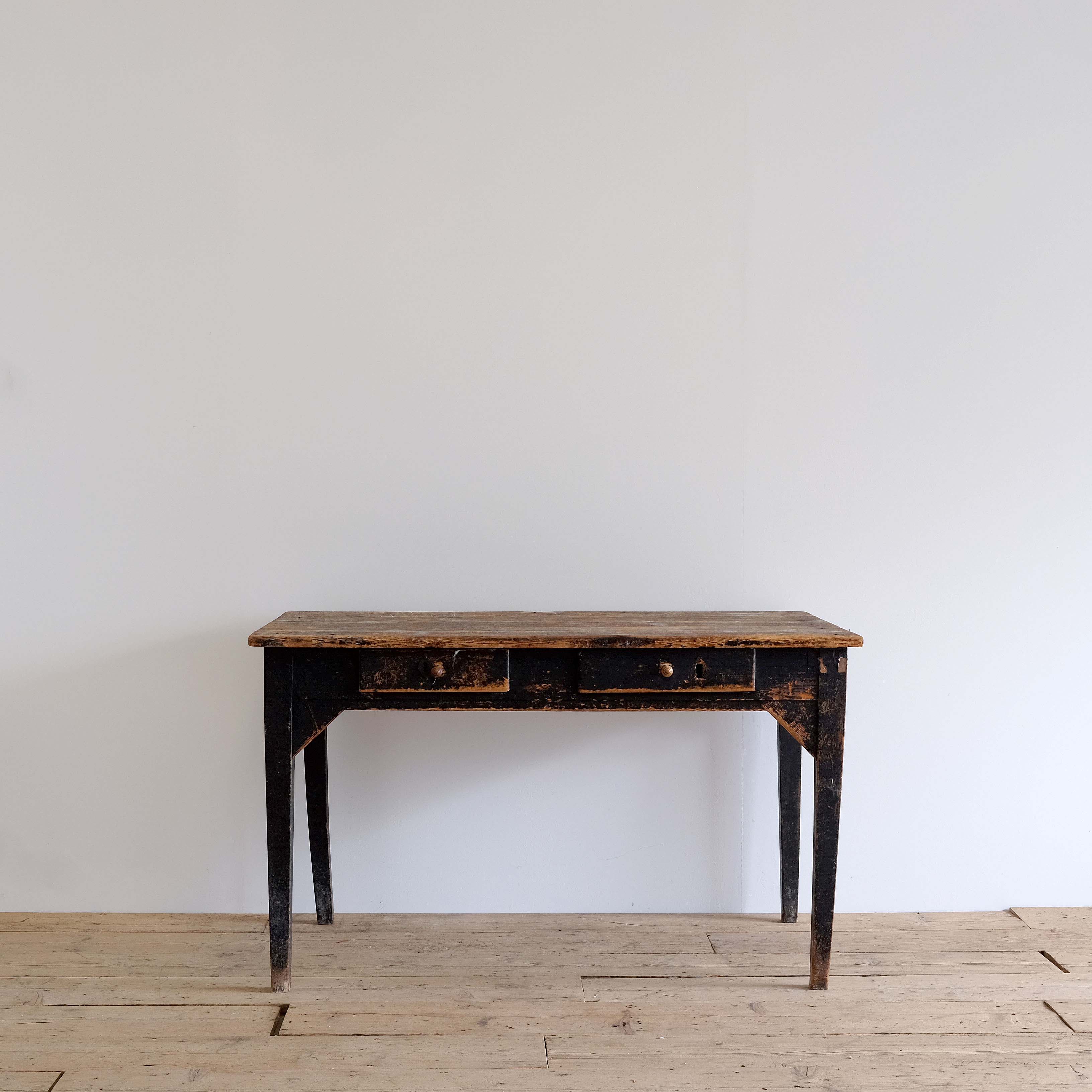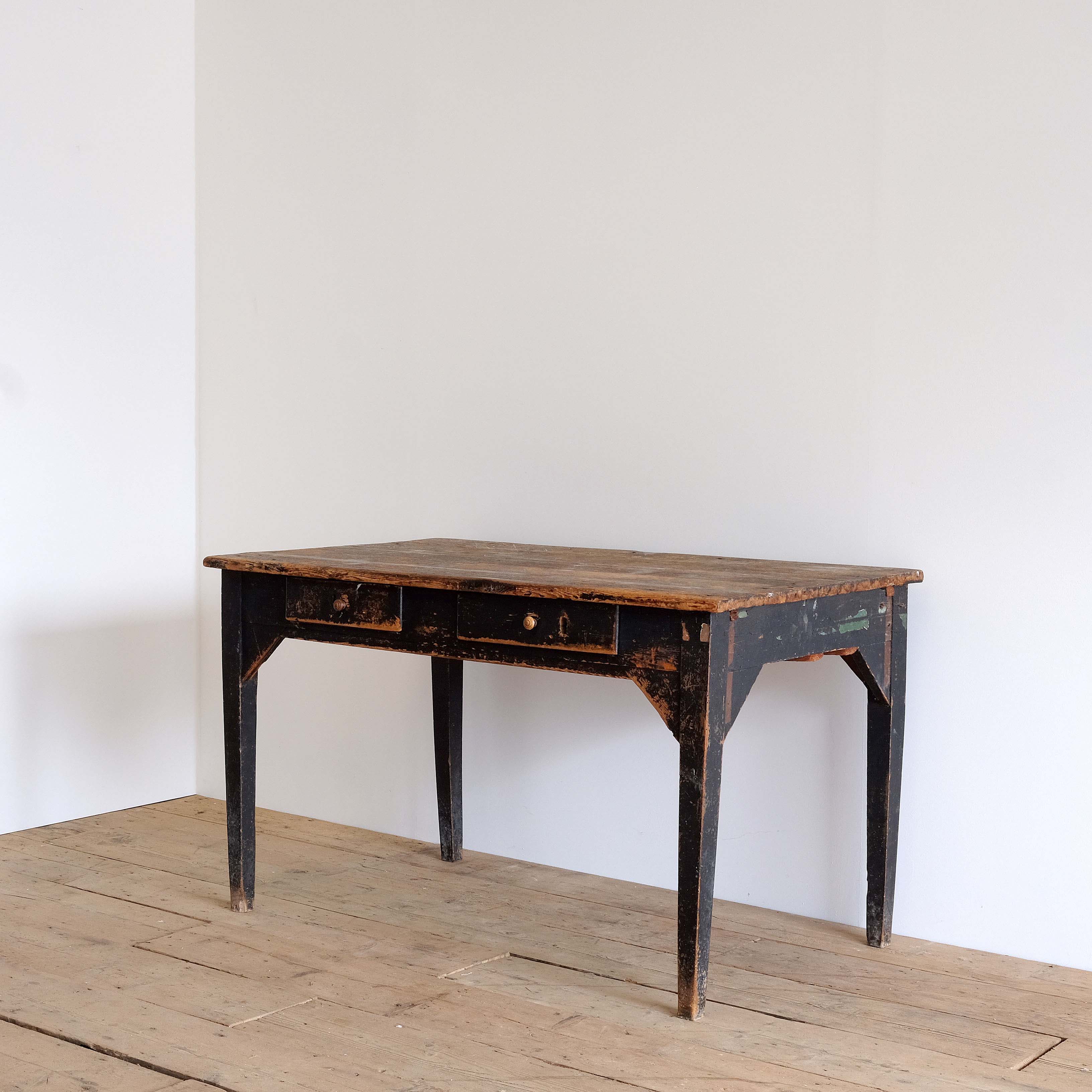 A late 19th century French desk in pine with remnants of the original black paint. Simple but elegant form with square tapered legs and two useful drawers. Our clients may recognise this piece as the desk we have been using in our Lillie Road shop for years. Now available for sale after a reshuffle!