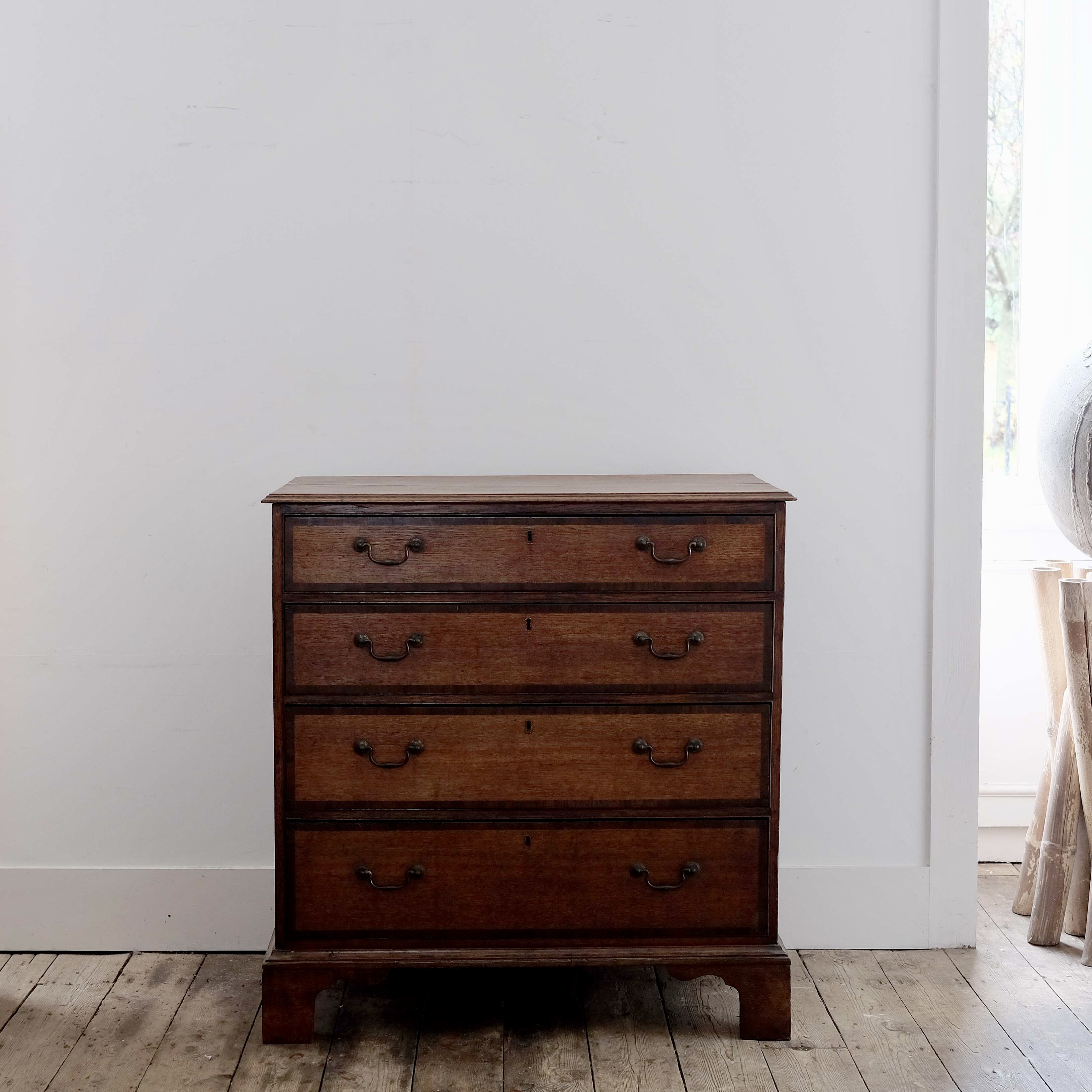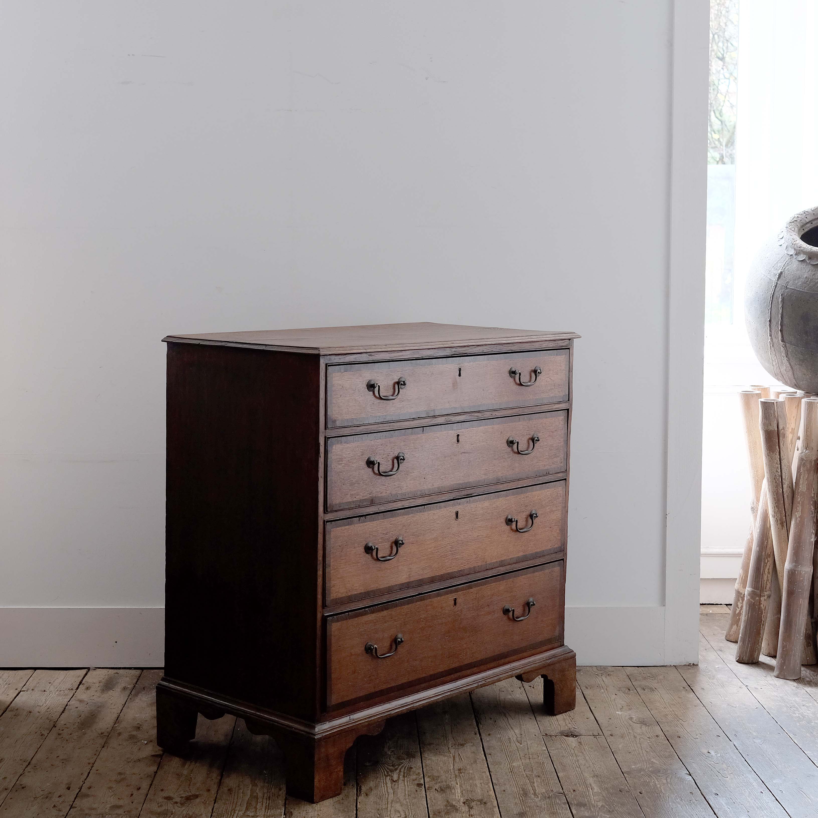 Lovely Georgian chest of drawers in oak, circa 1780. Neat proportions. Lovely honey colour. Bracket feet. Swan neck drawer pulls. Very smart darker inlays framing the drawers.