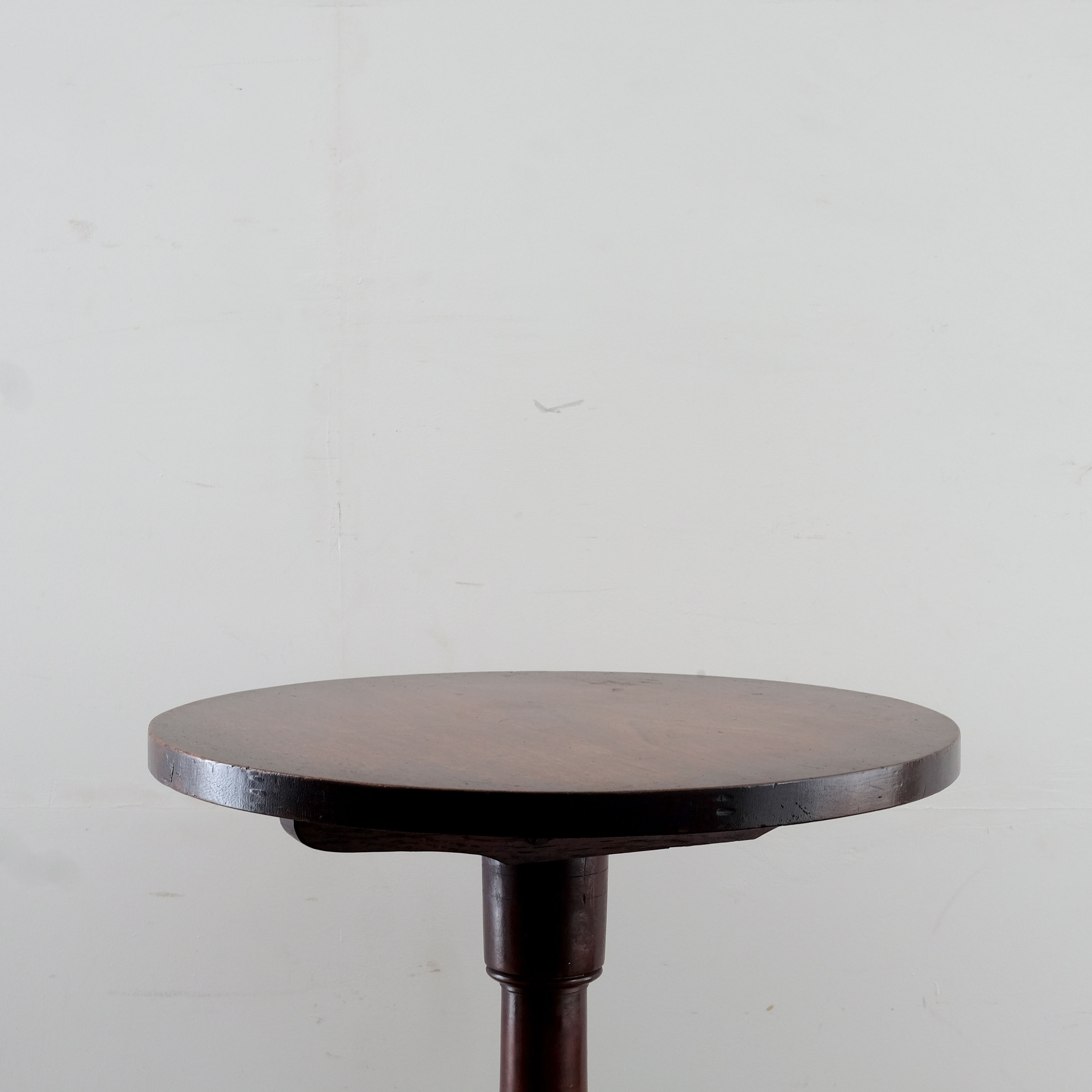 George III side table in oak. Typical 'tip top' design. Chunky oak top on a good quality turned pedestal base with legs that end on pad feet. Lovely dark rich patination.