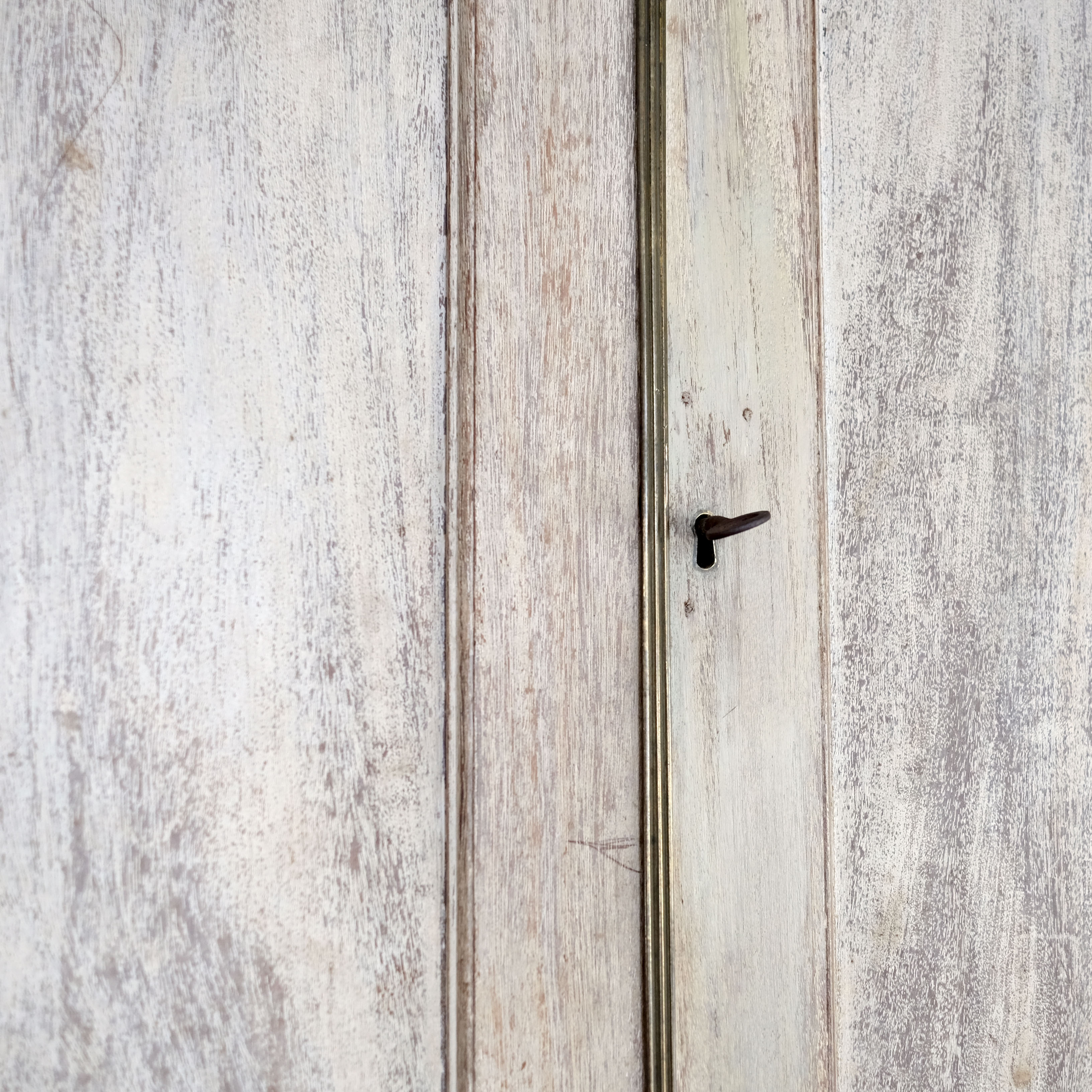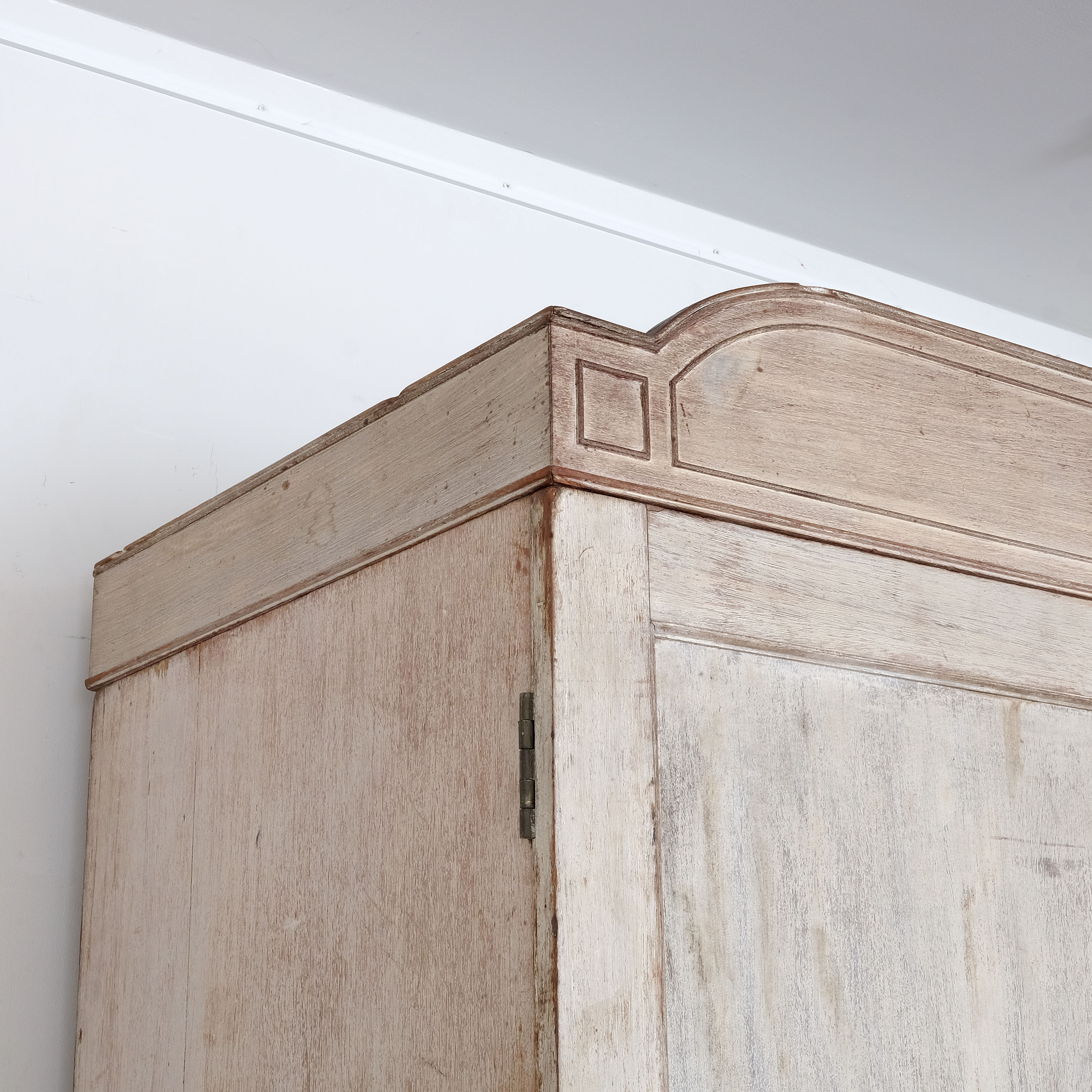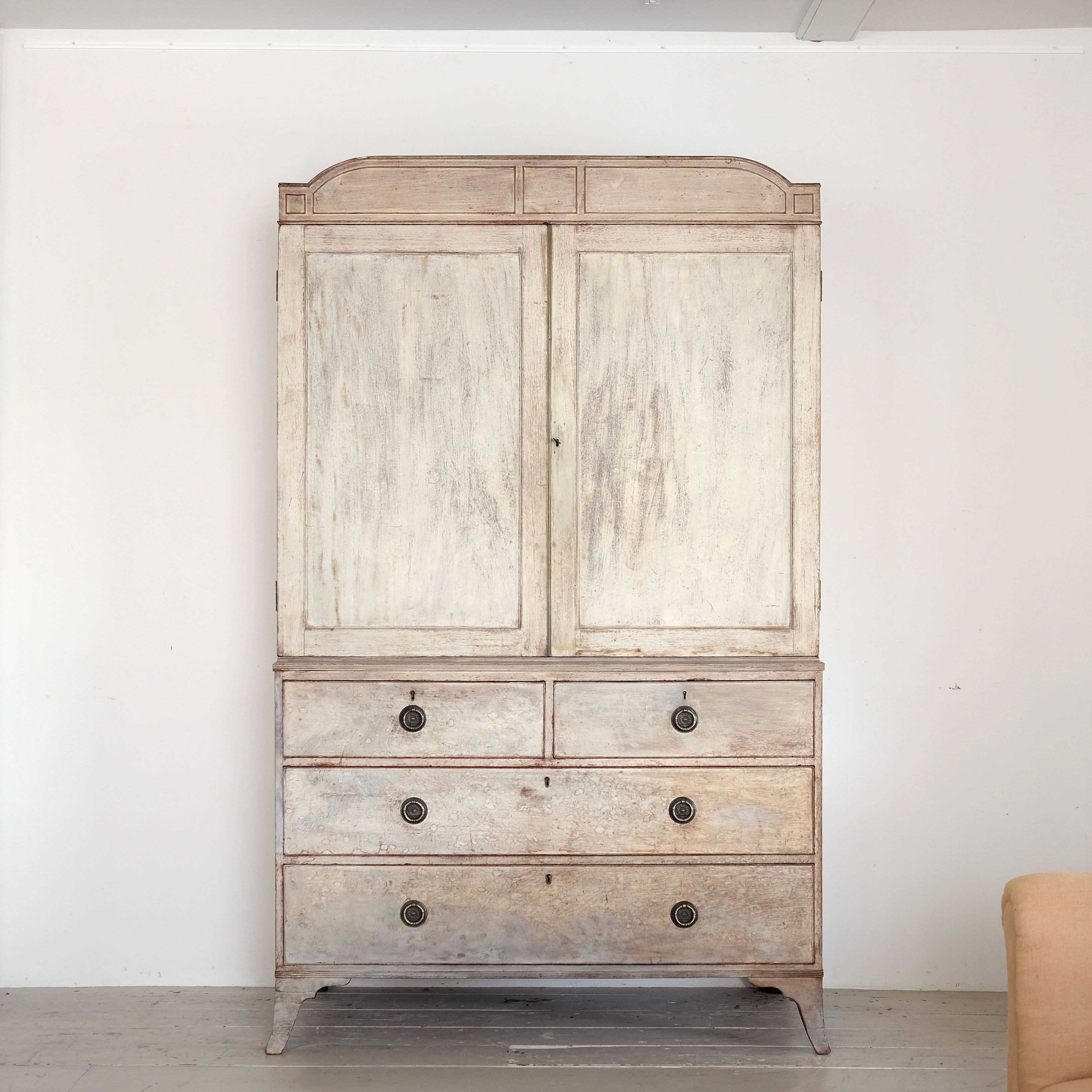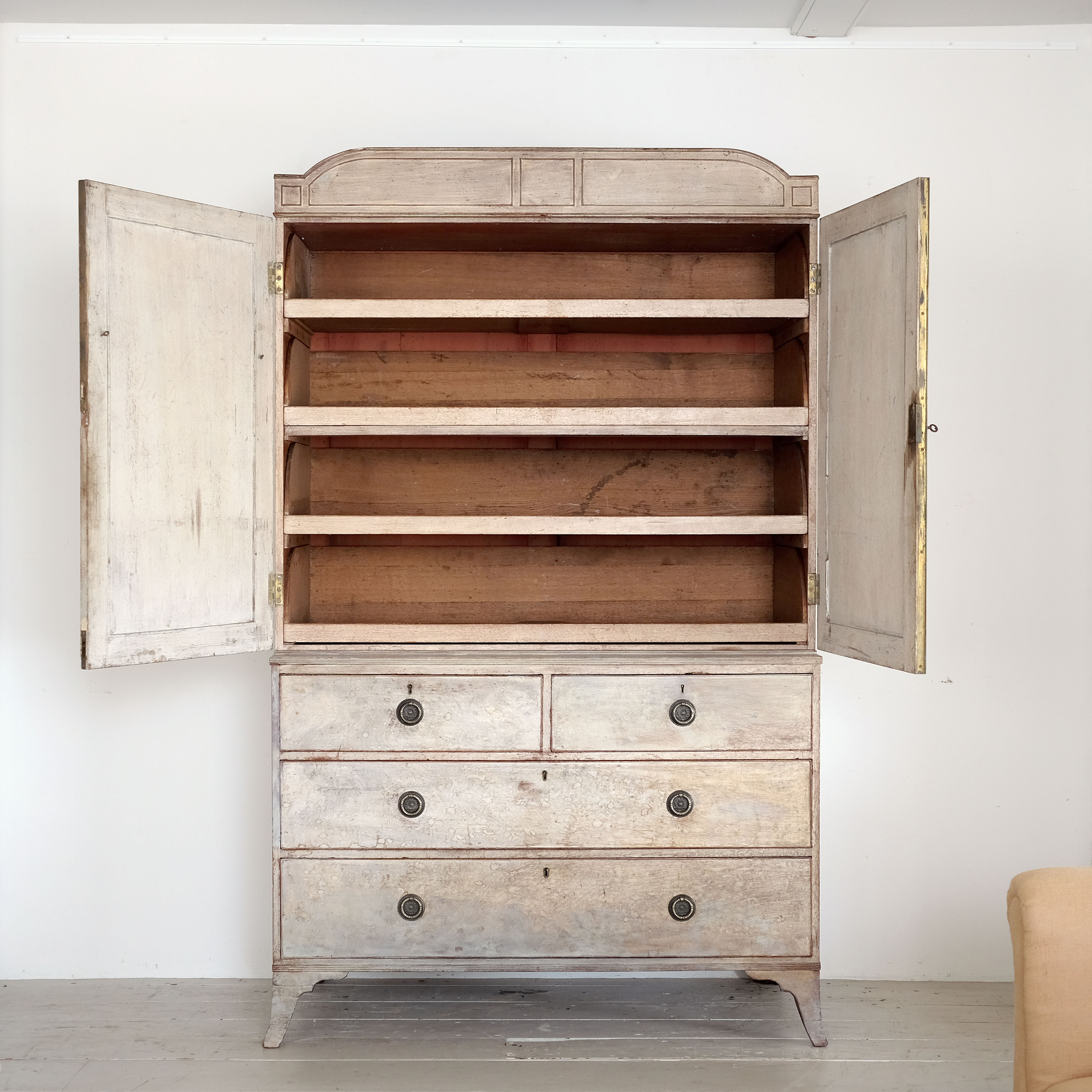 A good quality English Regency linen press, early 19th century, constructed in oak. Lovely architectural cartouche. Original pull out linen shelves on the upper section. Nice brass details. Working lock. Later paint but applied some time ago, probably early 20th century. Great proportions and stands very well.