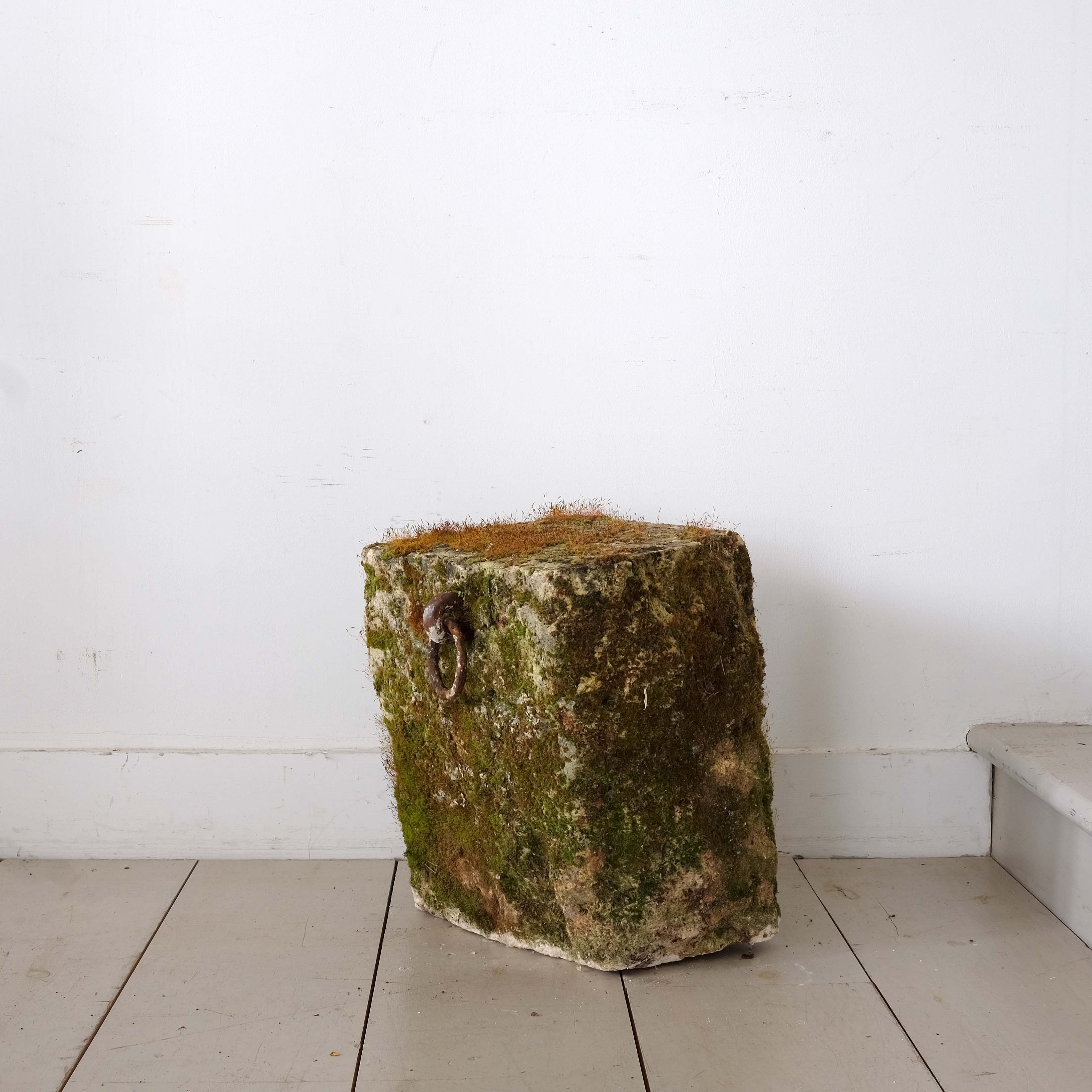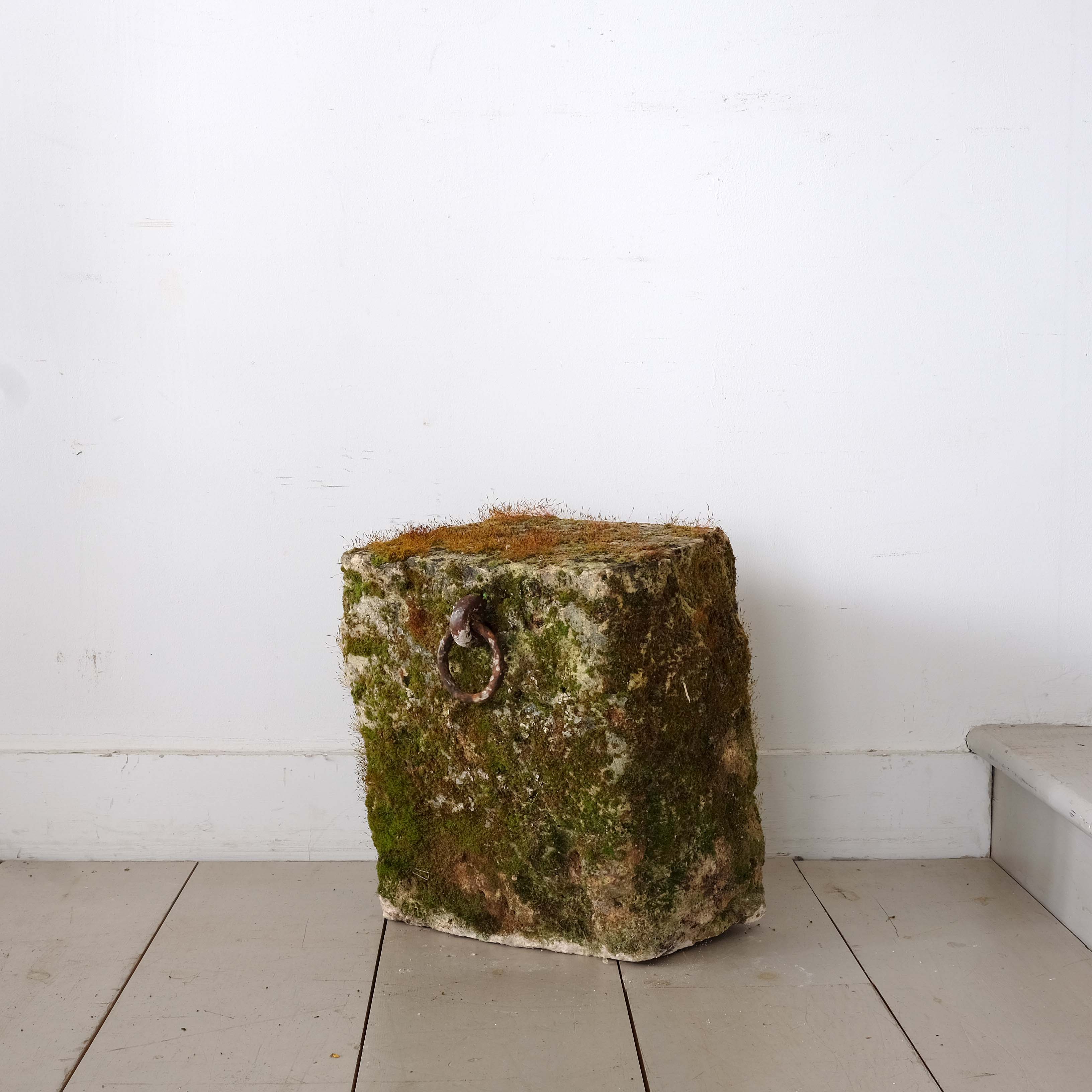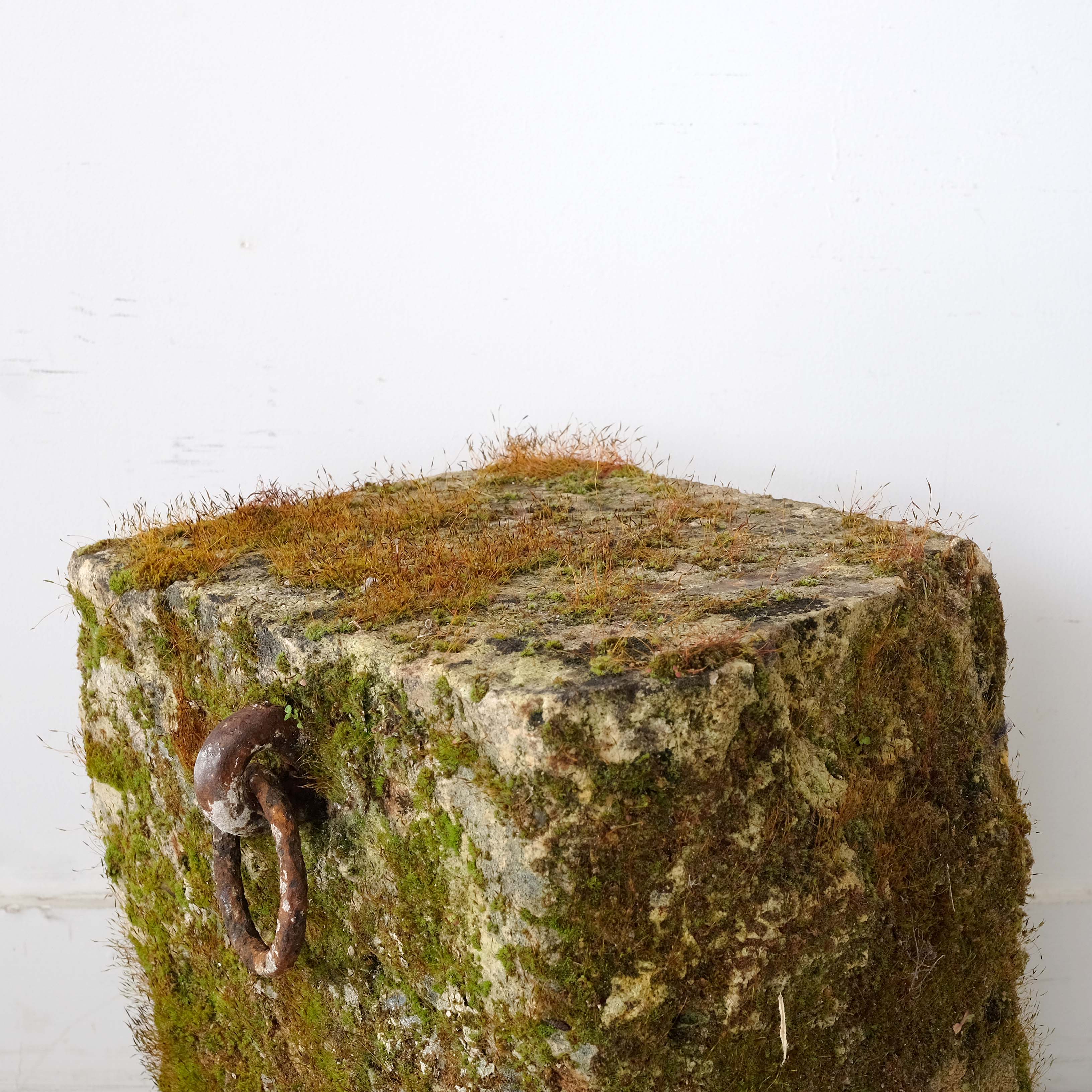 A fantastic 19th century moss covered sandstone tethering block with the original iron mongery set into the stone.