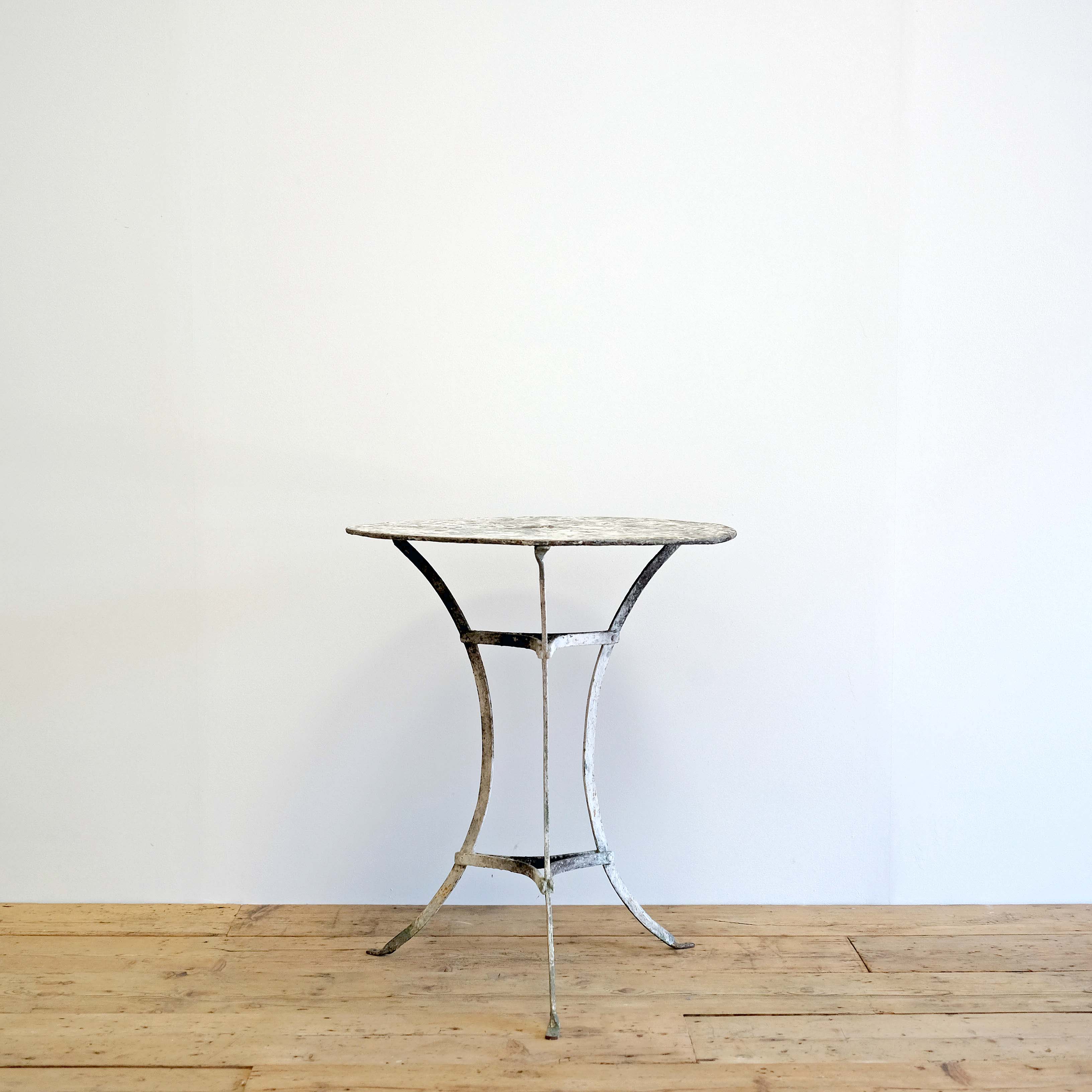 A very pretty late 19th century French bistro table. Sheet metal top on wrought iron legs and supported with wrought iron crossbars. Lovely layers of historic paint.