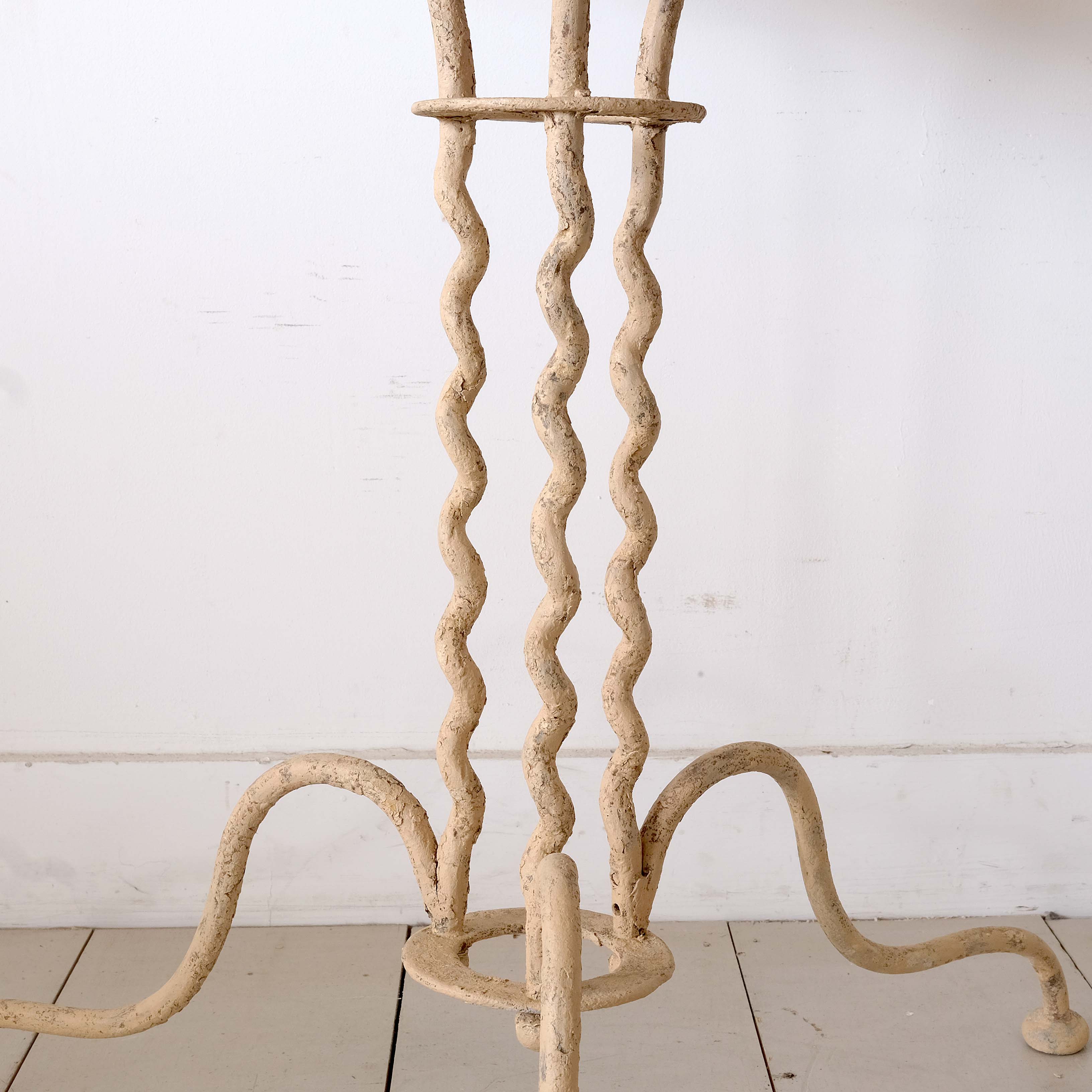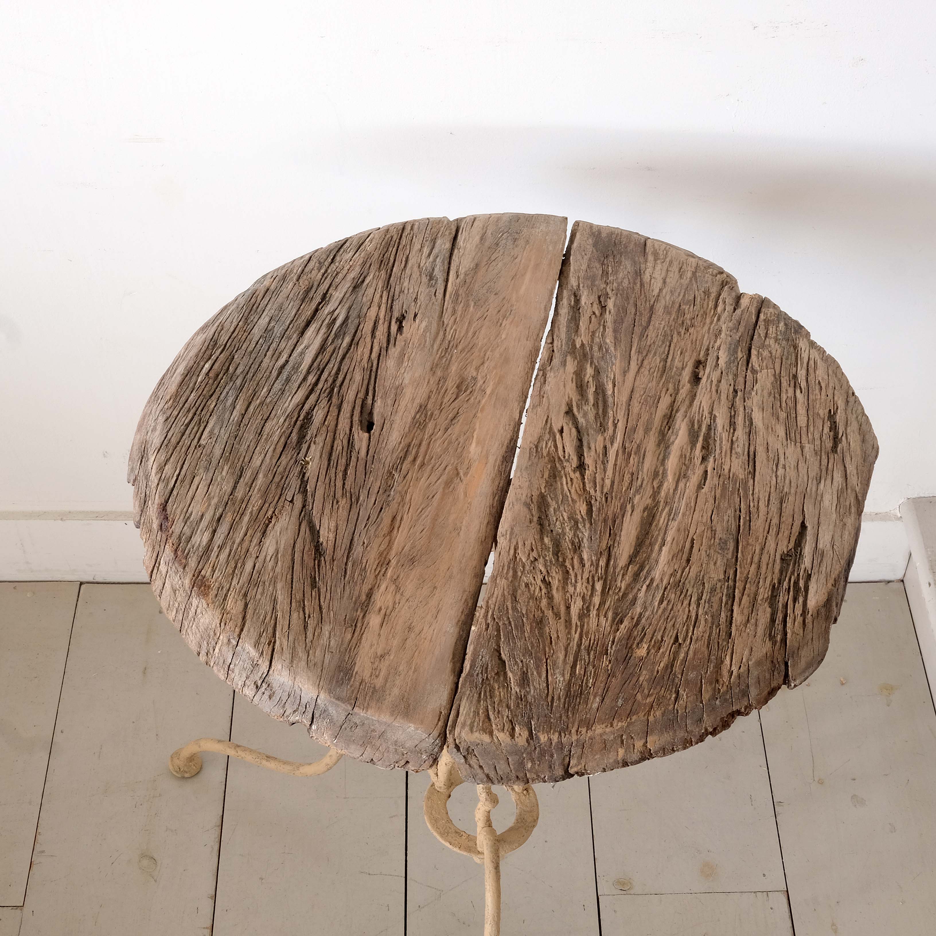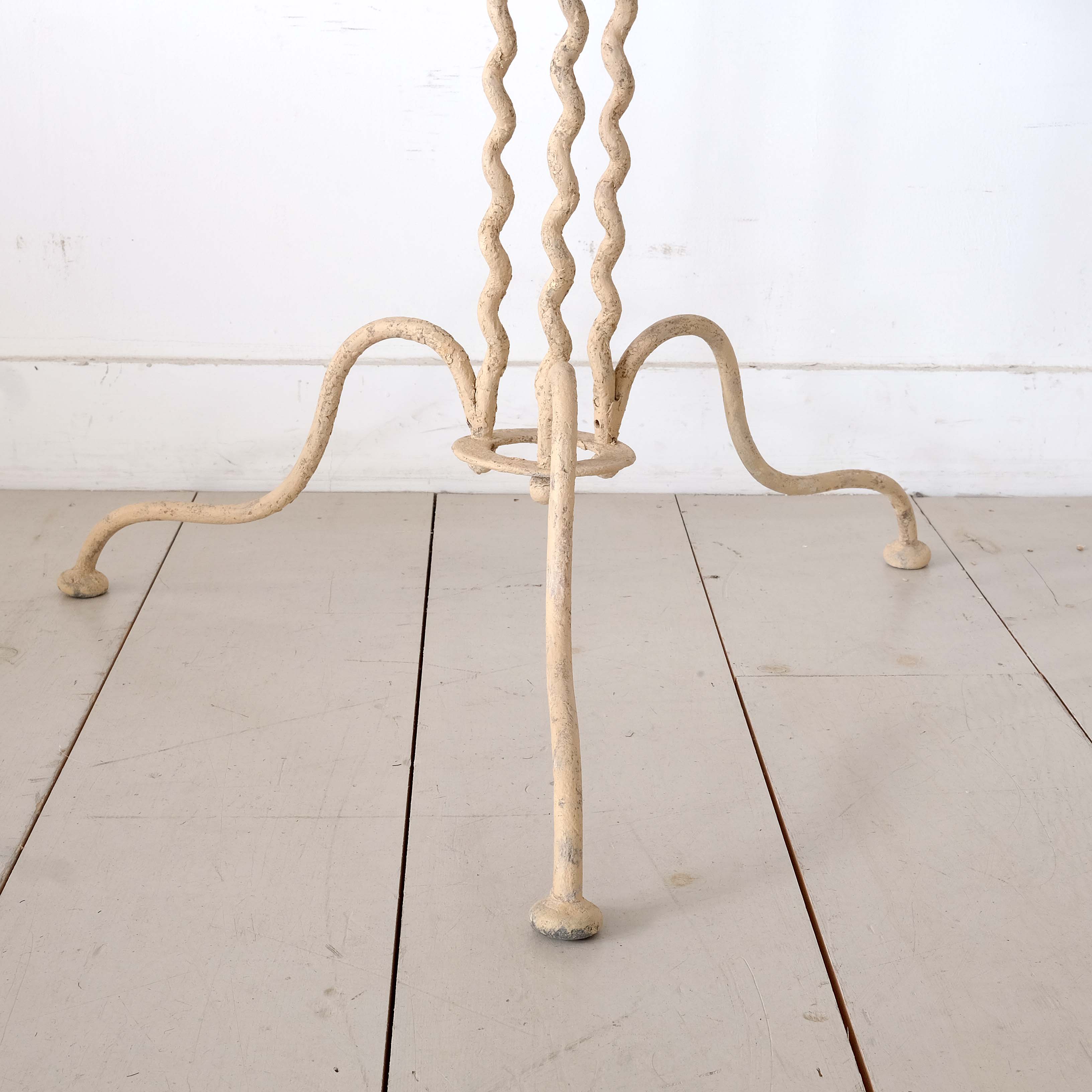 Late 19th century French garden table. Very unusual and elegant wrought iron base with remnants of the original paint that we have touched in. Later weathered wooden top that has replaced the original top but the two have been together for a long time. Very attractive piece.