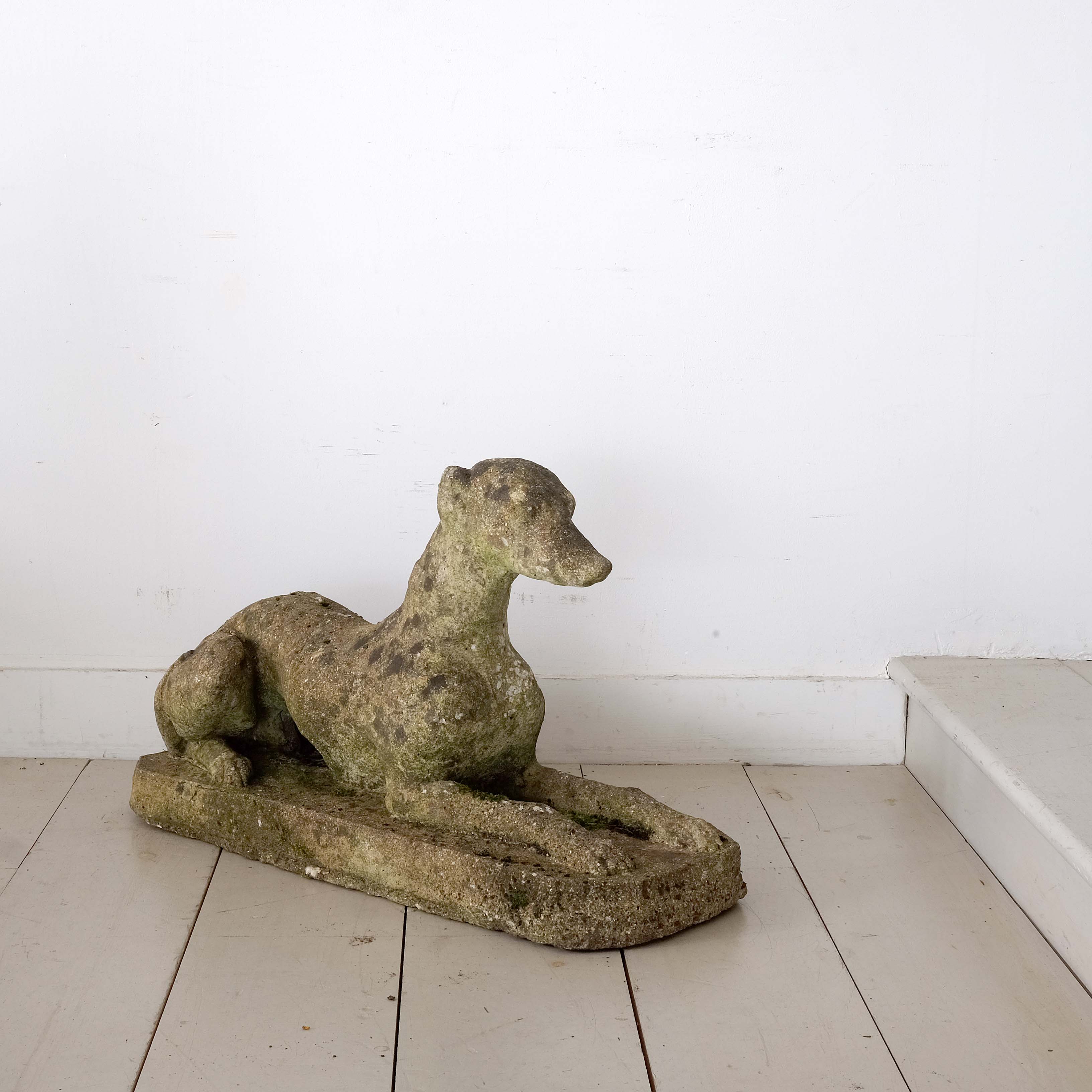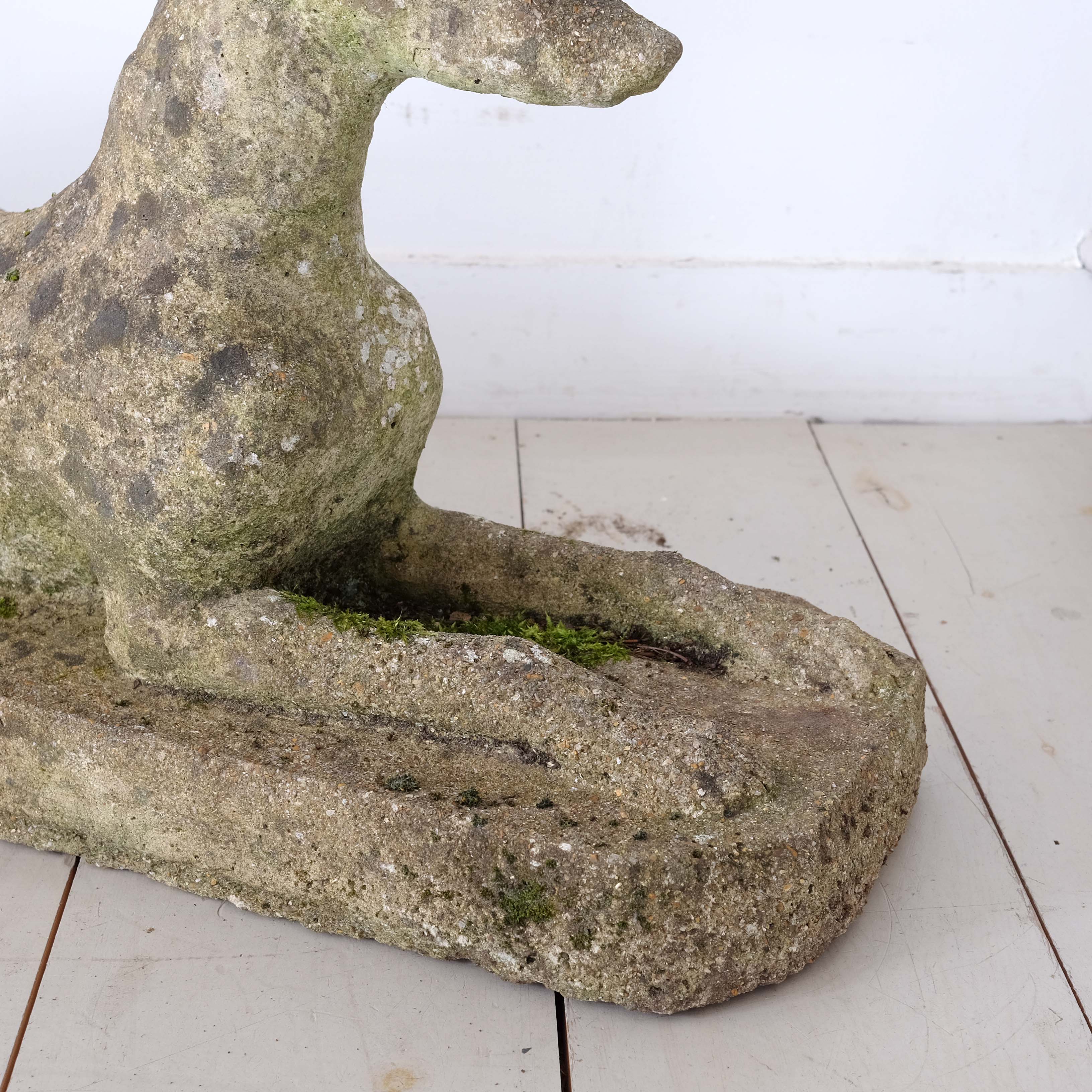 A 20th century garden sculpture depicting a rather regal looking whippet in a seated posture. Formed in reconstituted stone with lovely signs of weathering.