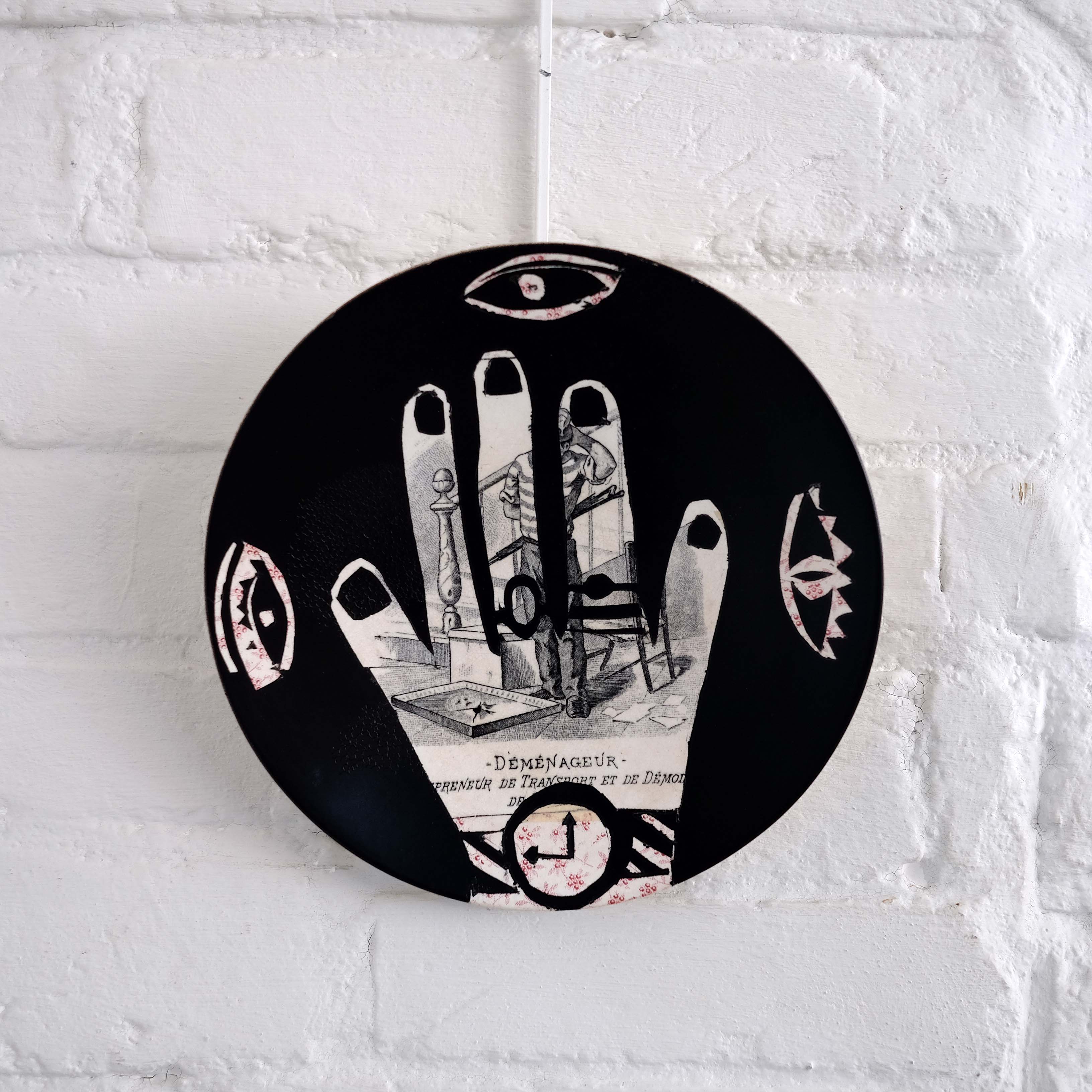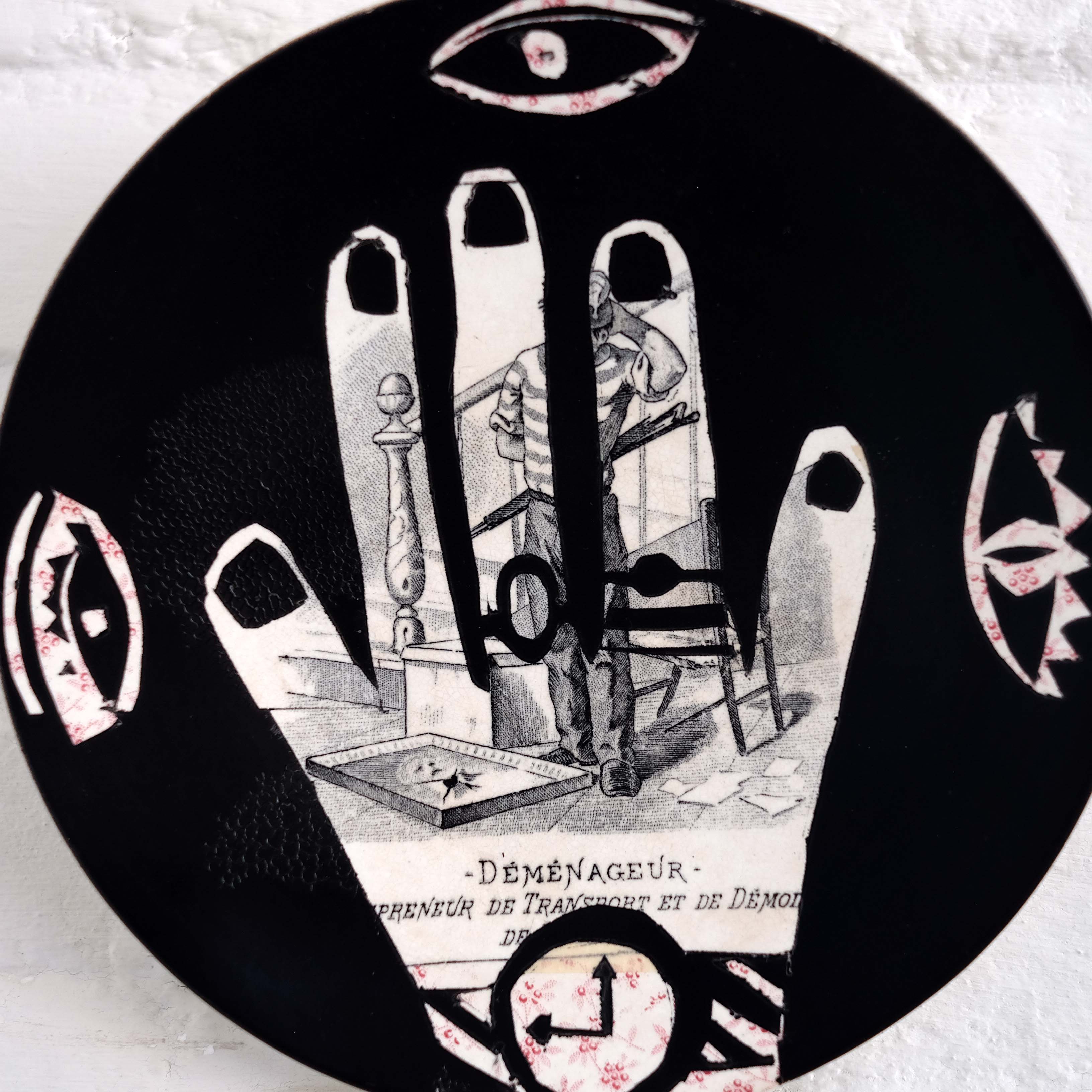 'Assiette Parlante' by Isabelle Hayman. 19th century transfer plate decorated with stencil. "The female figures layered on the vintage transfer plates are fierce and poetic, rewriting a new life for those elements of past domesticity.” Can be wall hung or used as a decorating piece