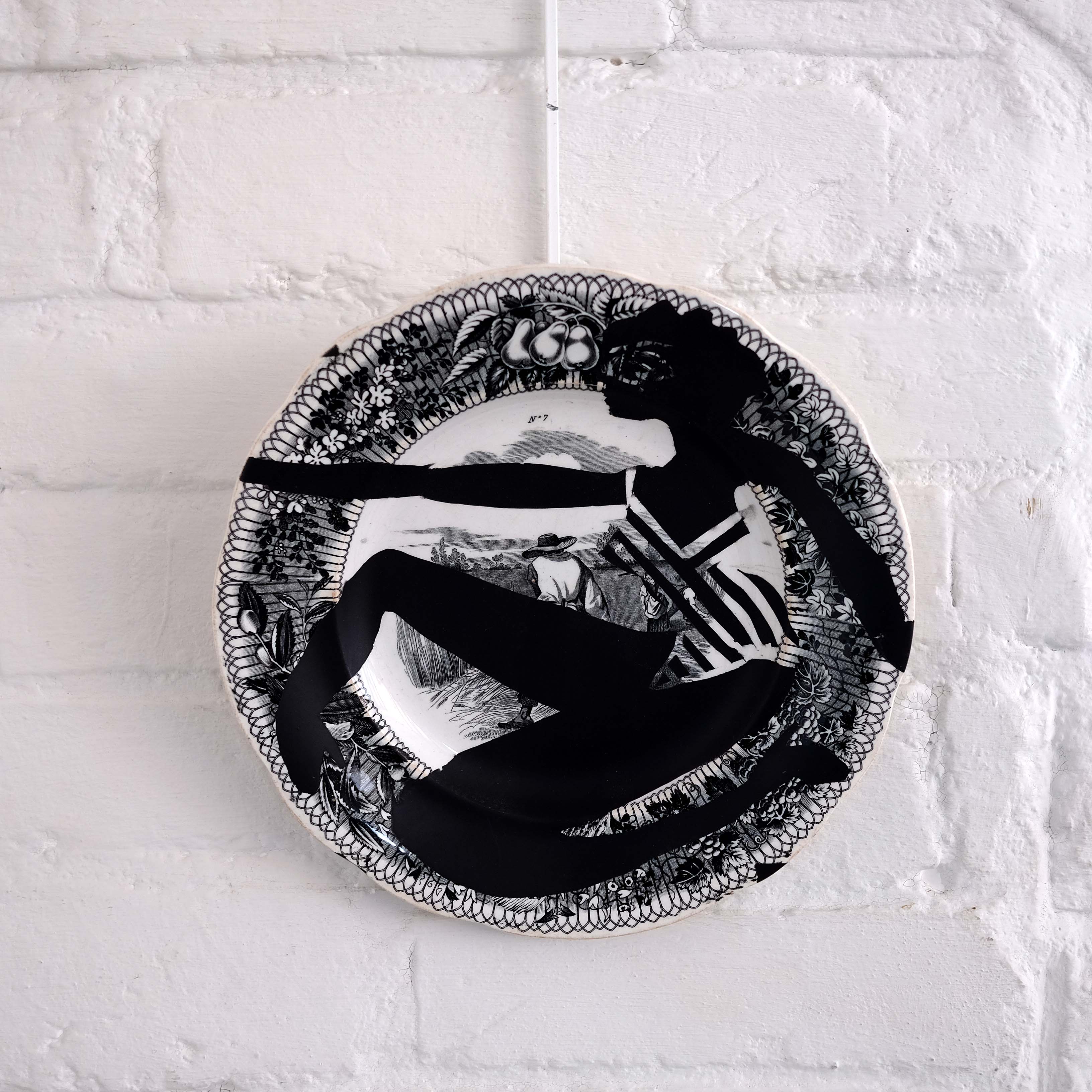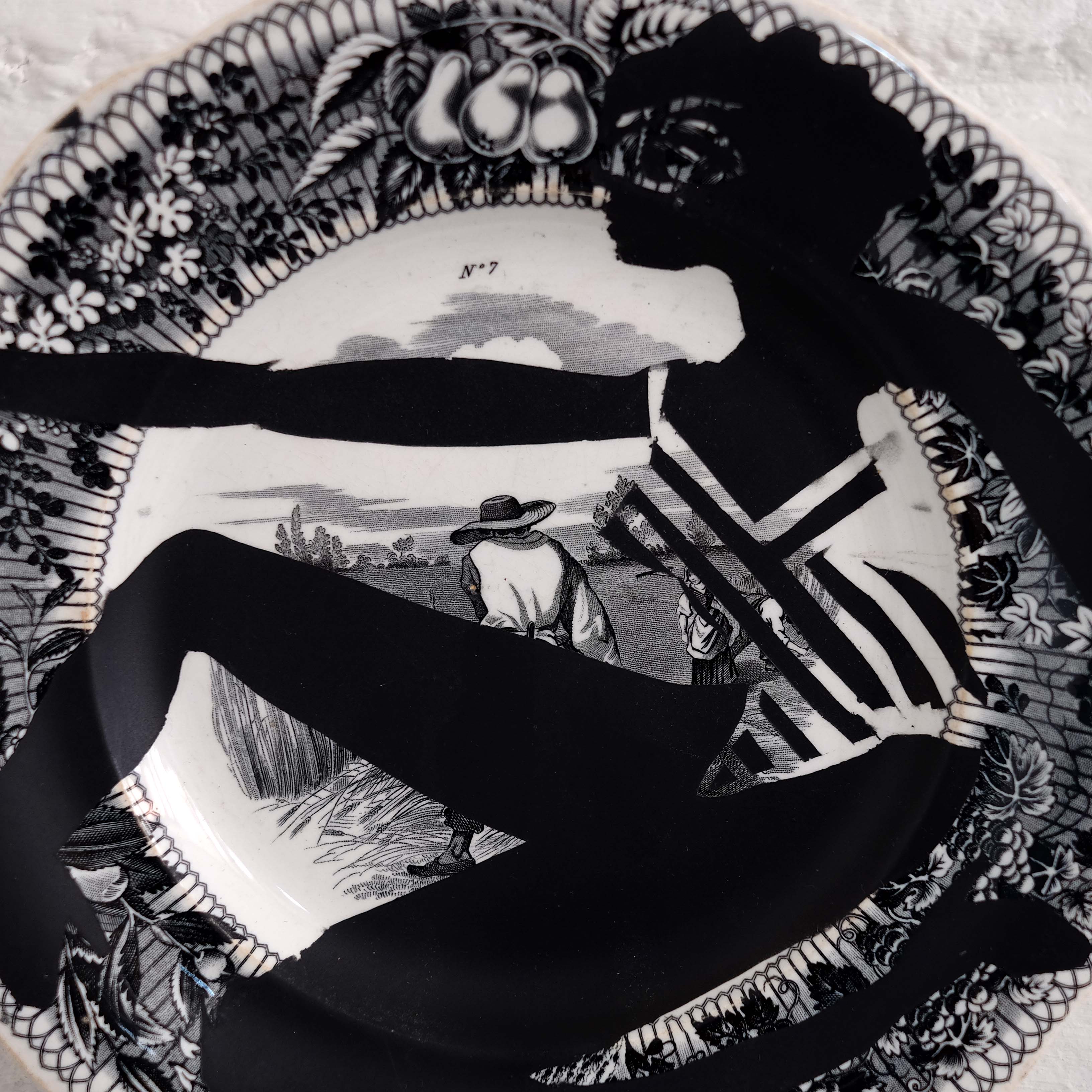 'Assiette Parlante' by Isabelle Hayman. 19th century transfer plate decorated with stencil. "The female figures layered on the vintage transfer plates are fierce and poetic, rewriting a new life for those elements of past domesticity.” Can be wall hung or used as a decorating piece