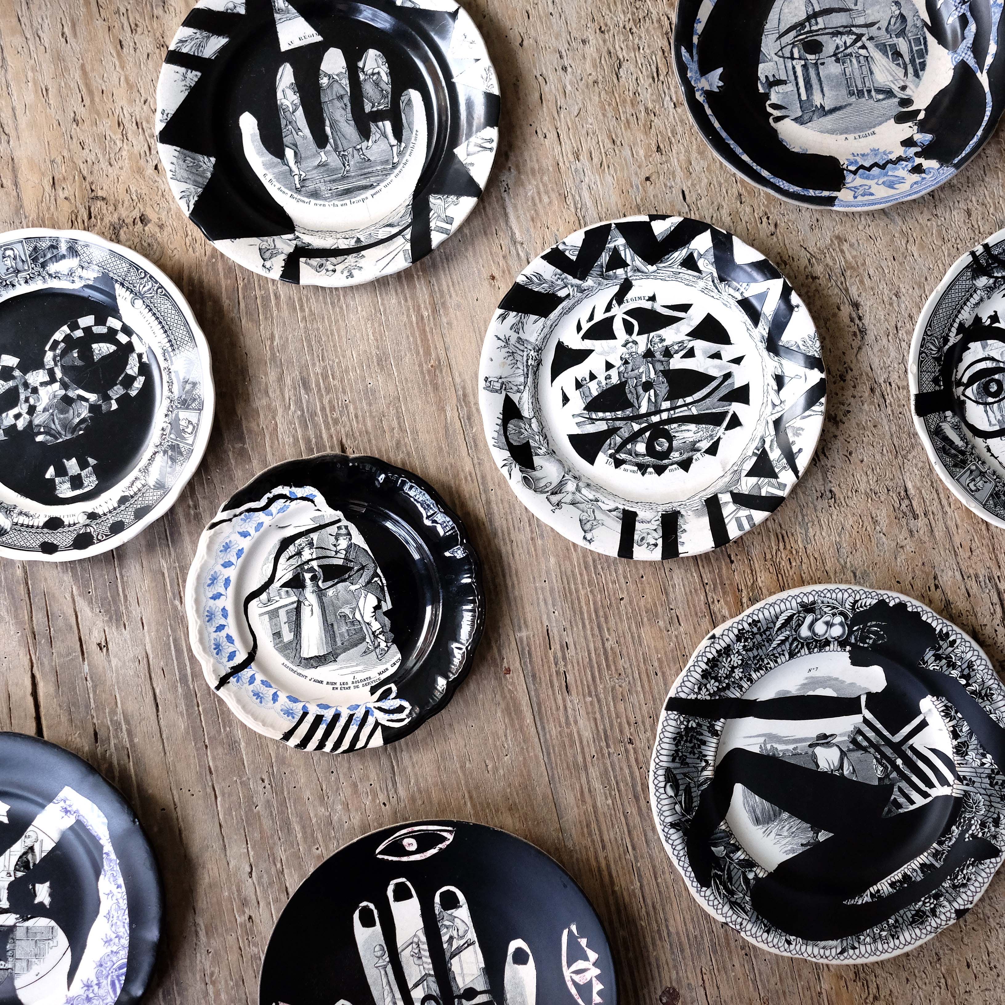 'Assiettes Parlantes' by Isabelle Hayman. 19th century transfer plate decorated with stencil. "The female figures layered on the vintage transfer plates are fierce and poetic, rewriting a new life for those elements of past domesticity.” Can be wall hung or used as a decorating pieces.