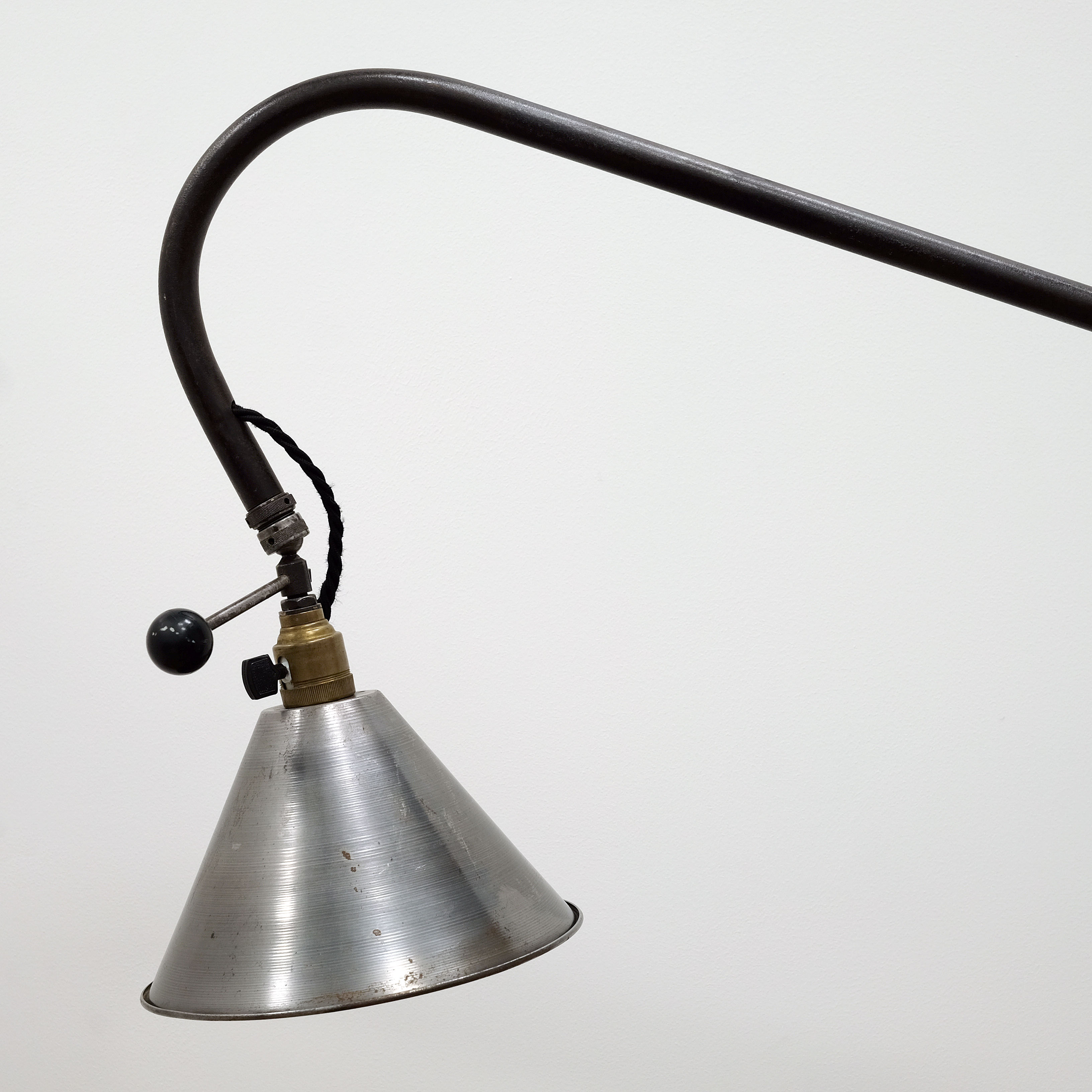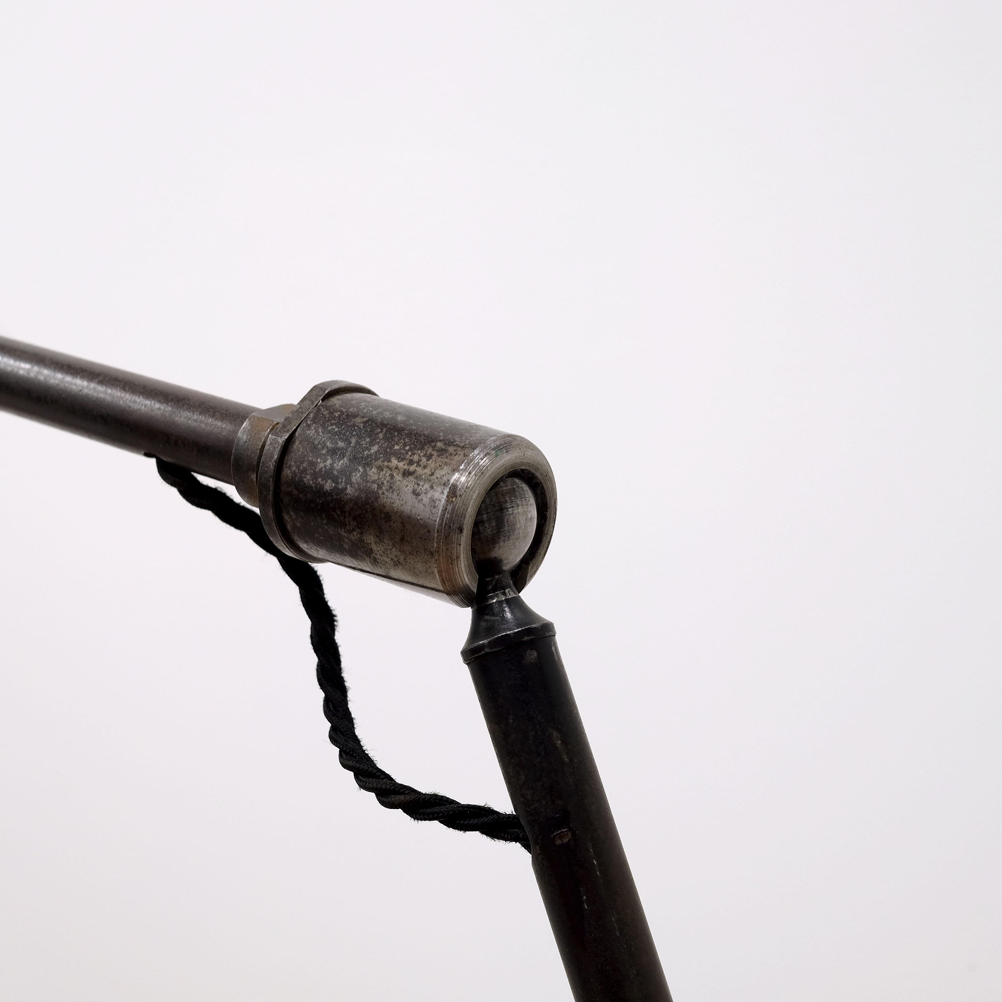 Good quality mid 20th century industrial floor light. Tubular metal with sheet metal tray and base on the original castors. Articulates in three places including two ball and socket joints. Original metal shade. Rewired and PAT tested for UK use.