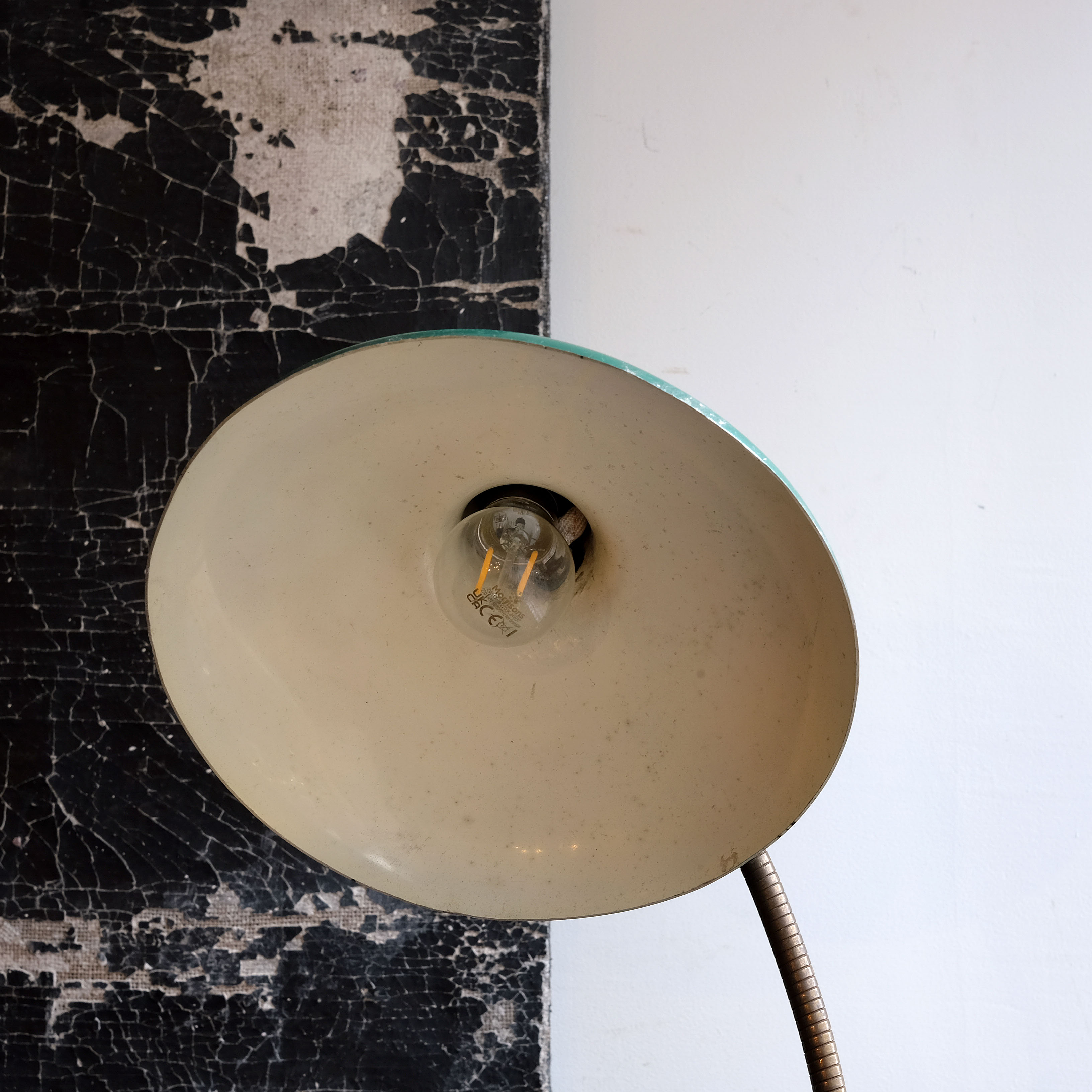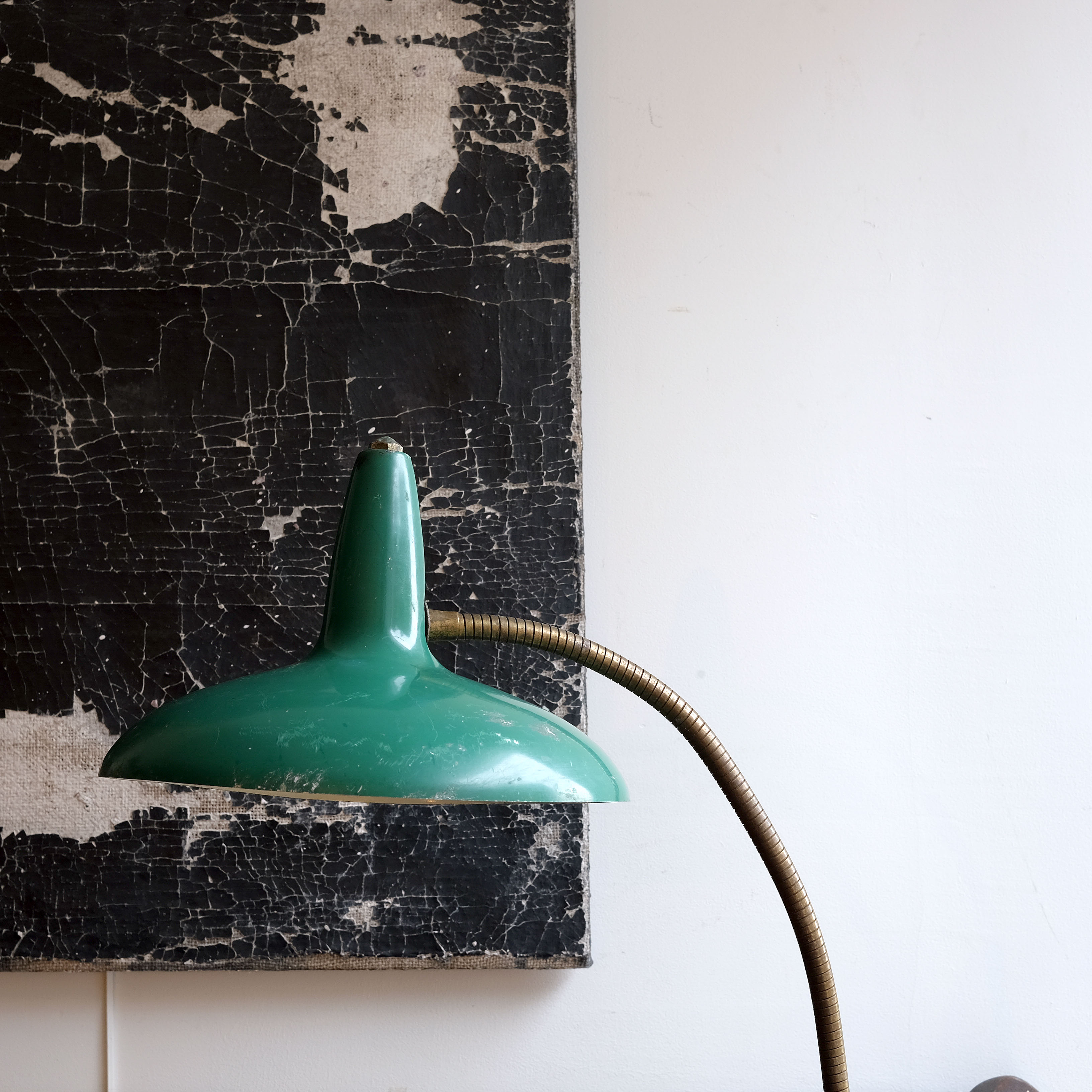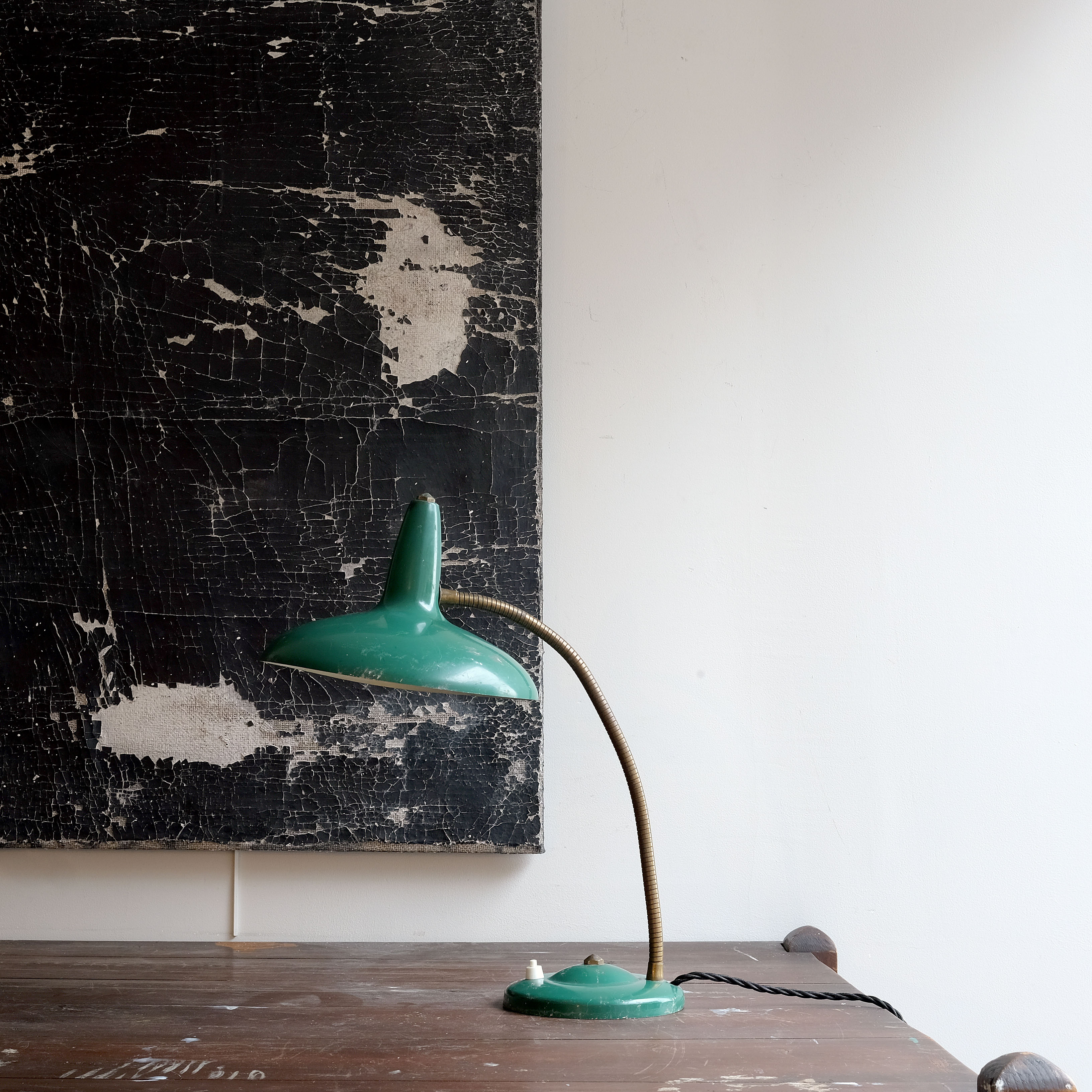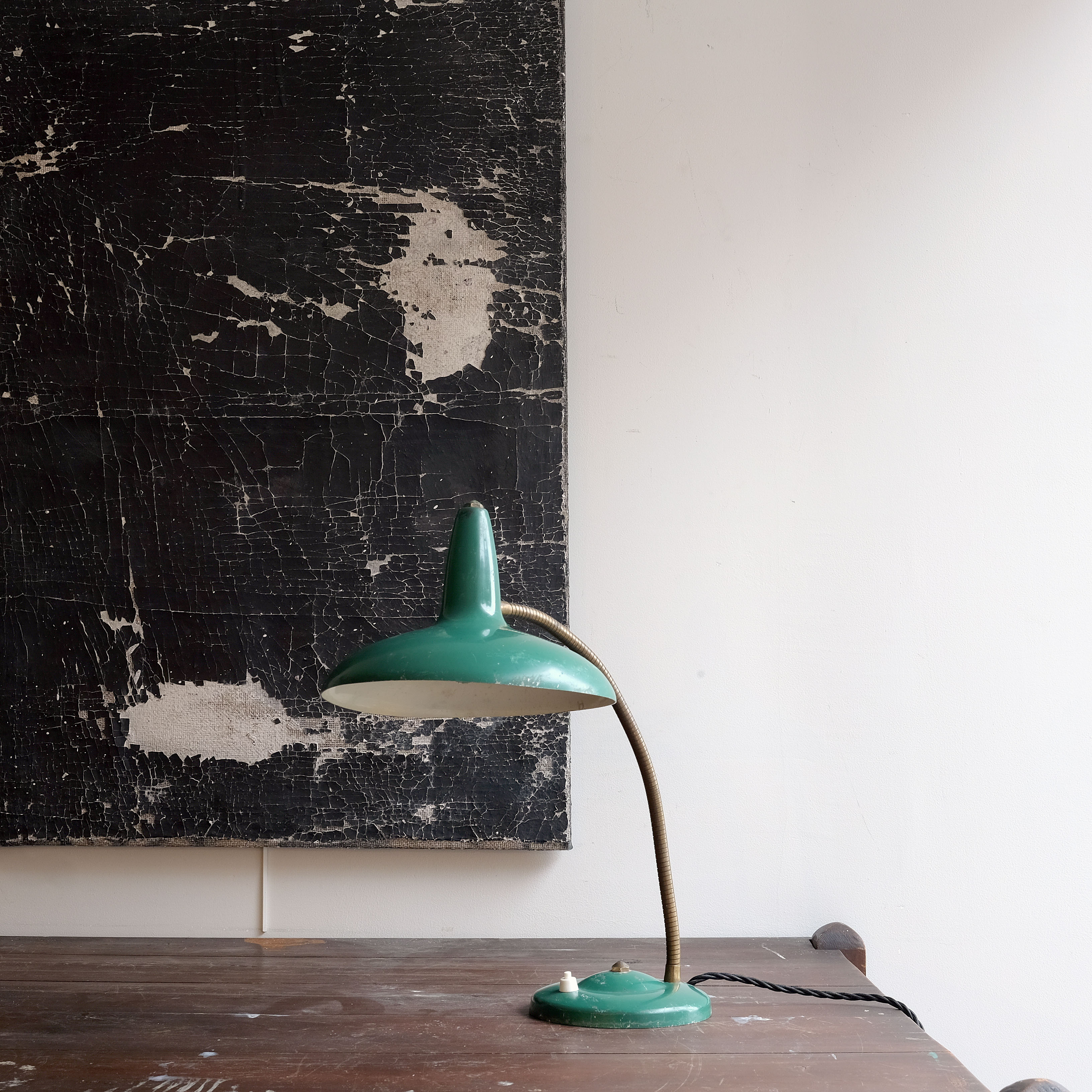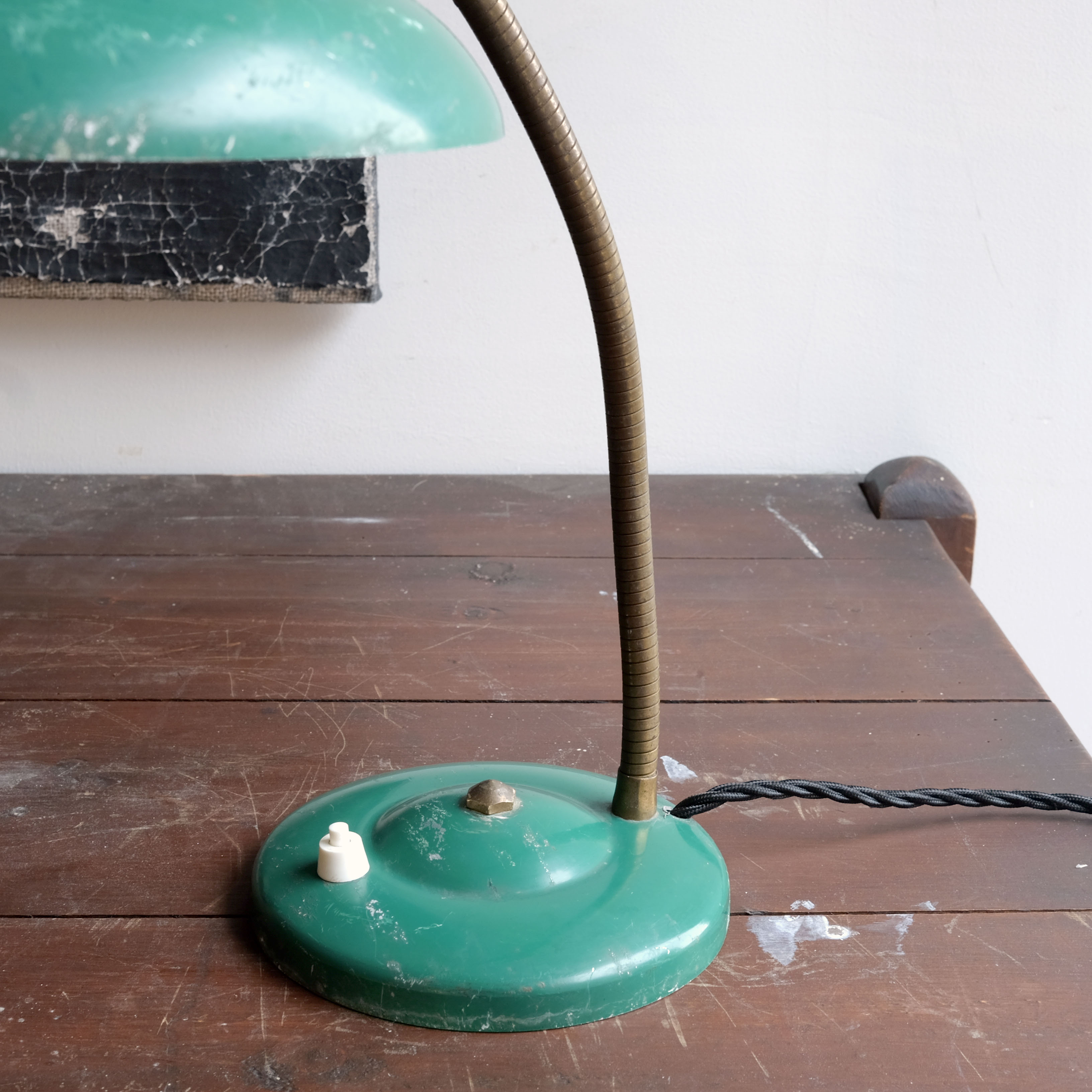 A very chic mid 20th century Italian table lamp, green metal shade and base with adjustable bendy brass stem. Re-wired and PAT tested for UK use.