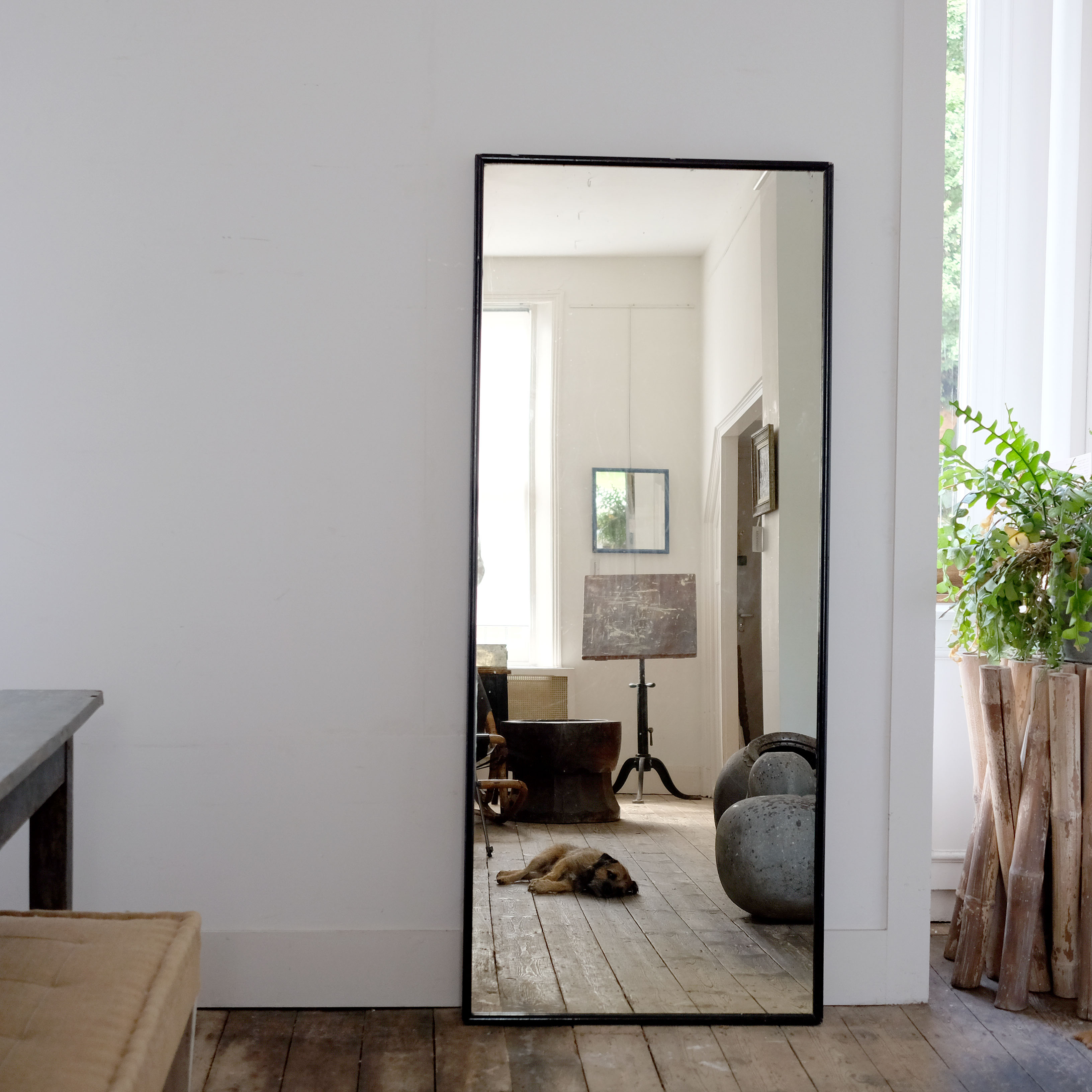 Antique English tailor's mirror, late 19th century, original plate, original panelled back, and original black finish around the bull nose frame. Elegant dressing mirror proportions. Nice ageing and character to glass but in good usable condition.