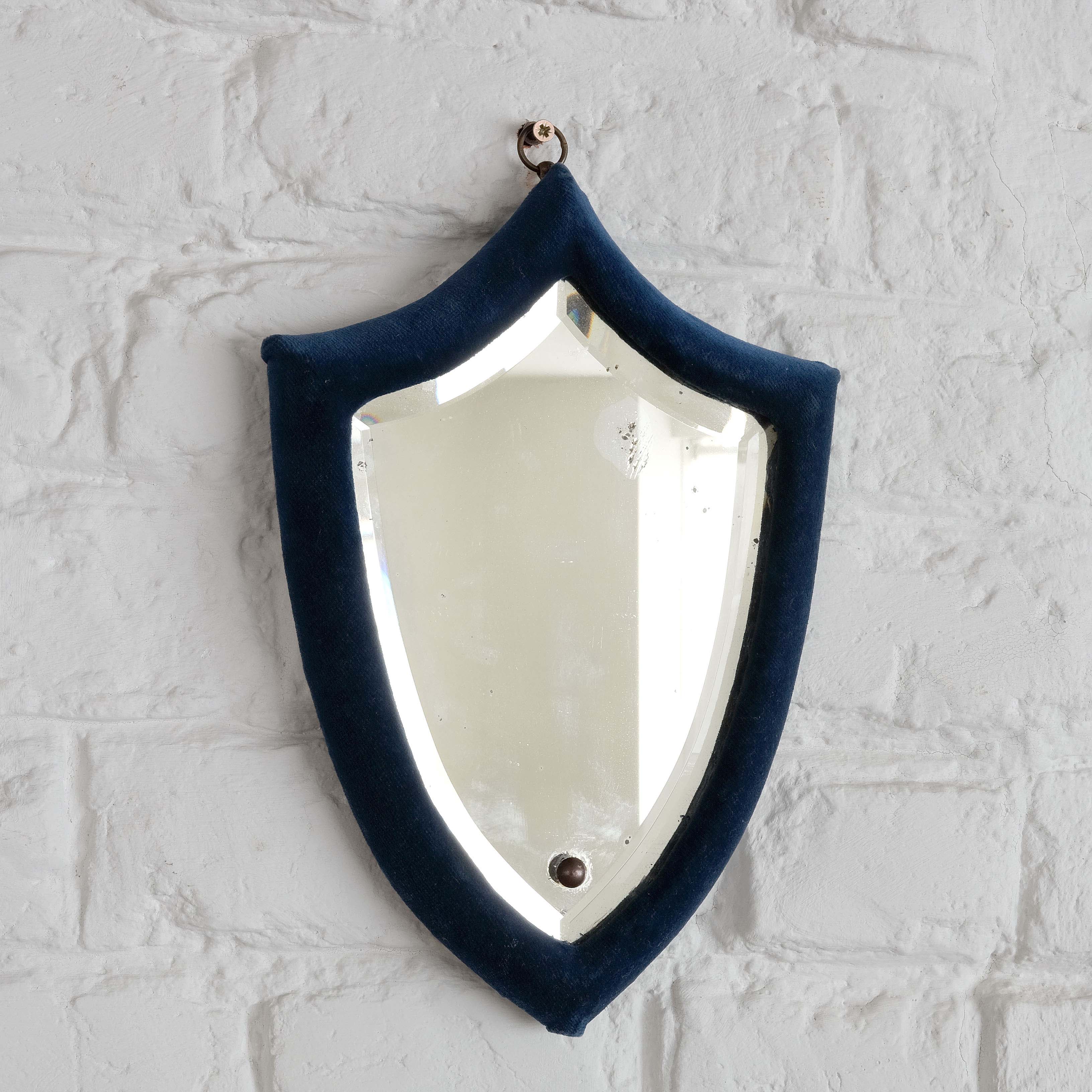 A very beautiful little shield shaped mirror with the original bevelled plate, and the lovely original blue velvet around the frame. England, circa 1910.
