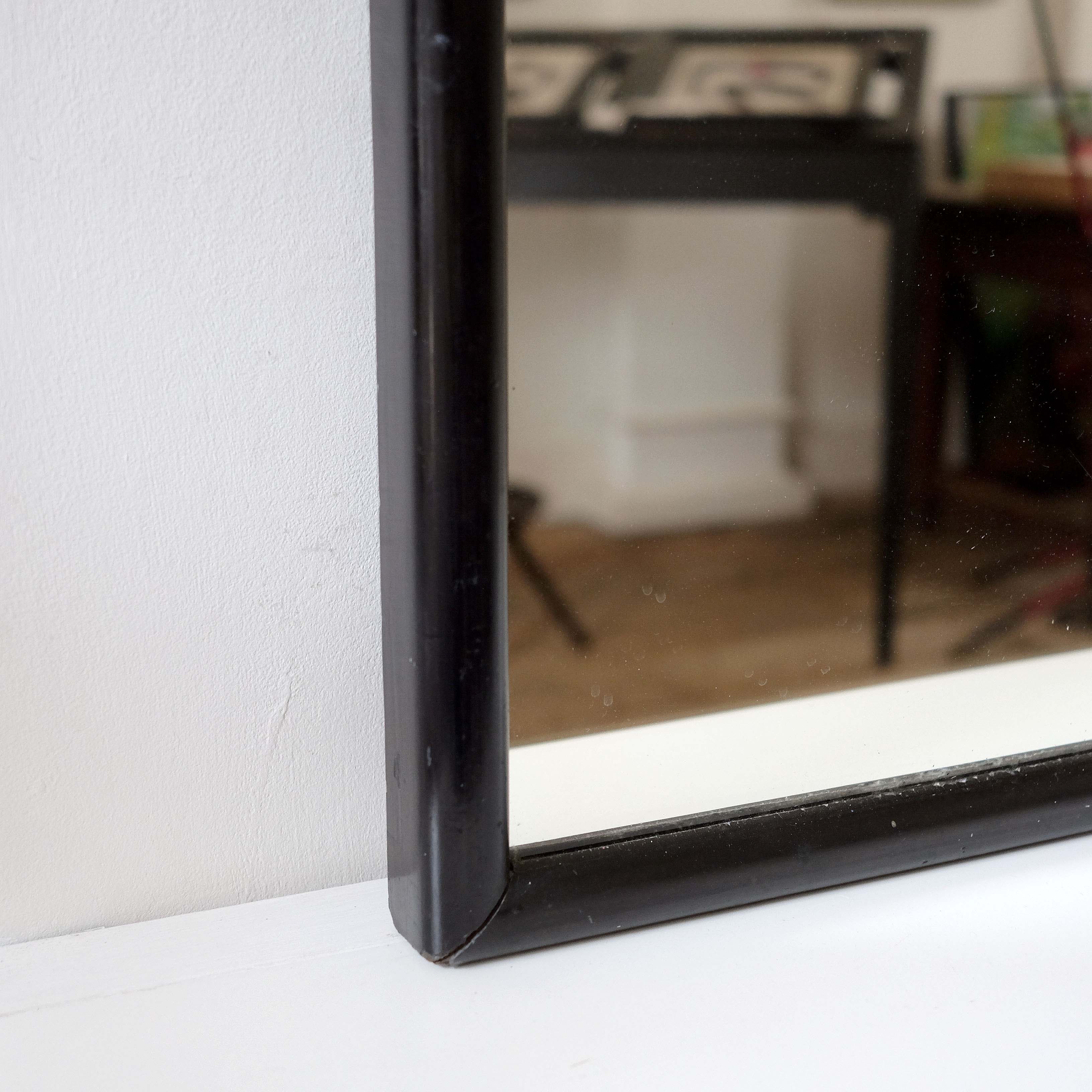Late 19th century English shop mirror from an outfitter or similar. Original plate, original paneled back, and original ebonised finish to the elegant bull nose frame.