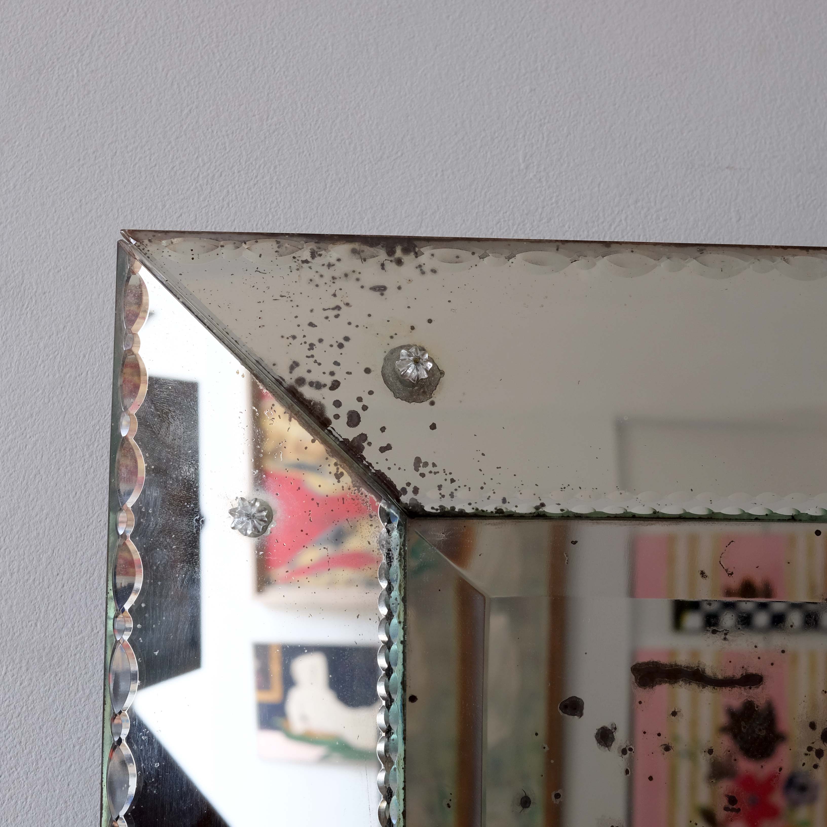 A stylish 1940s French cushioned Venetian style mirror with all the original plates and flower screw decorations. The plates are nicely distressed but not too much.